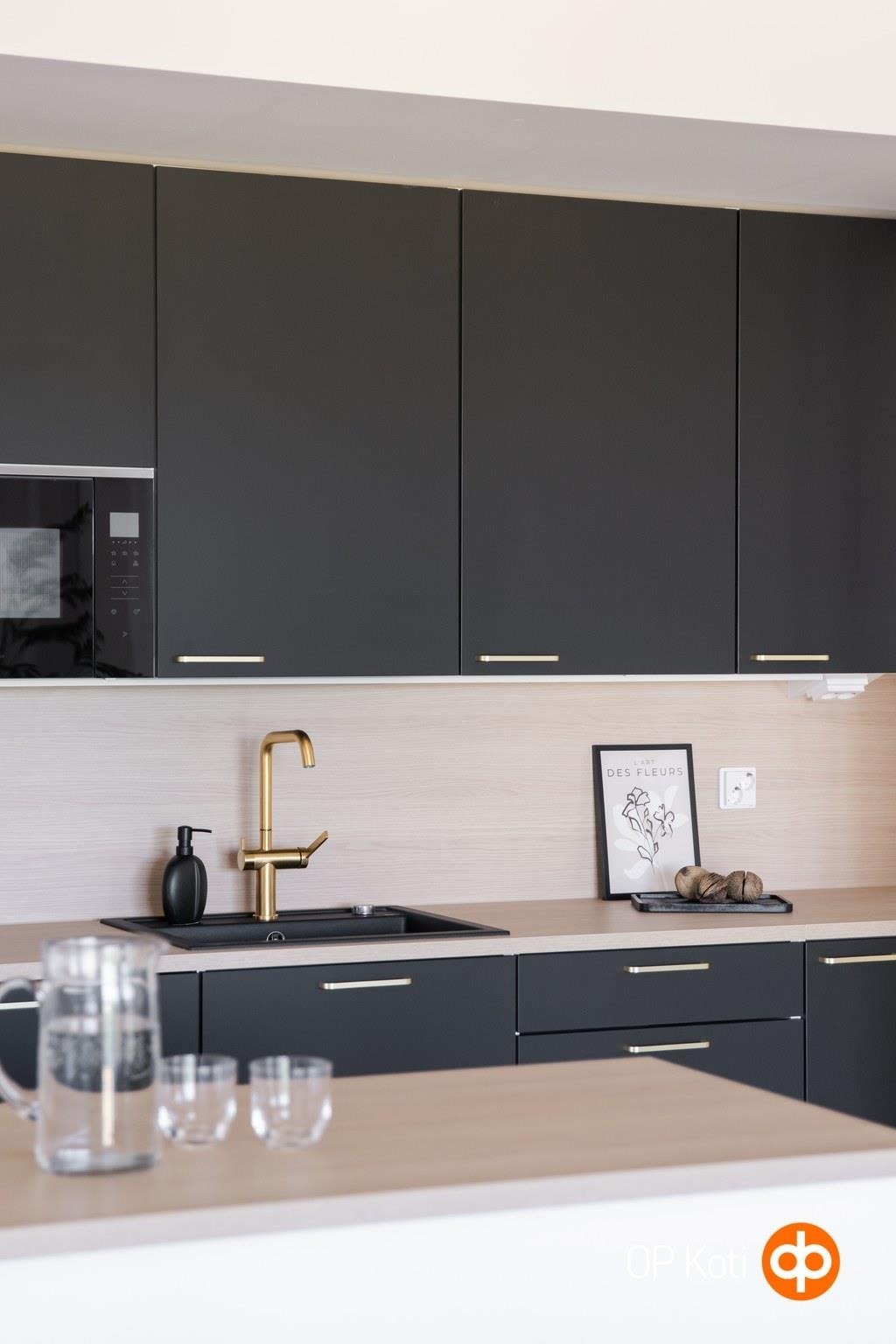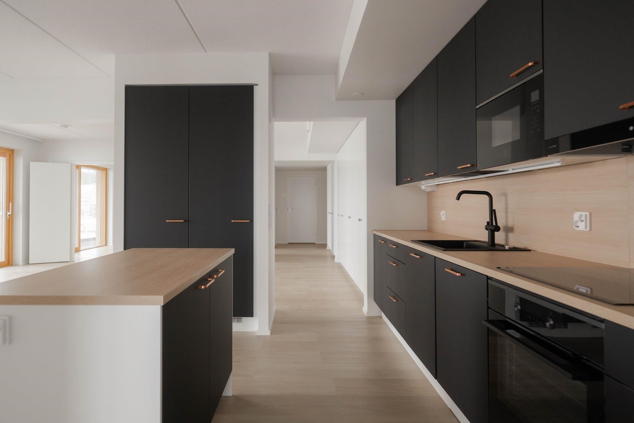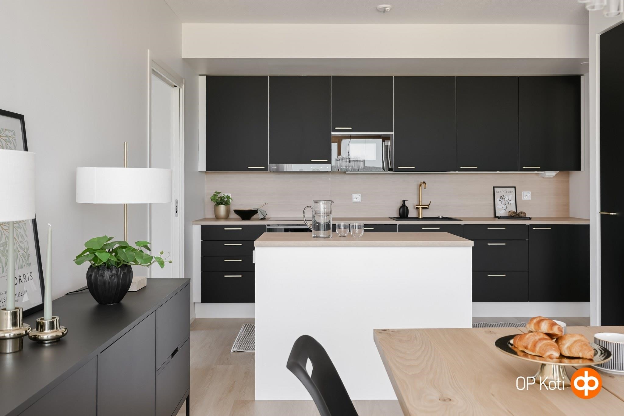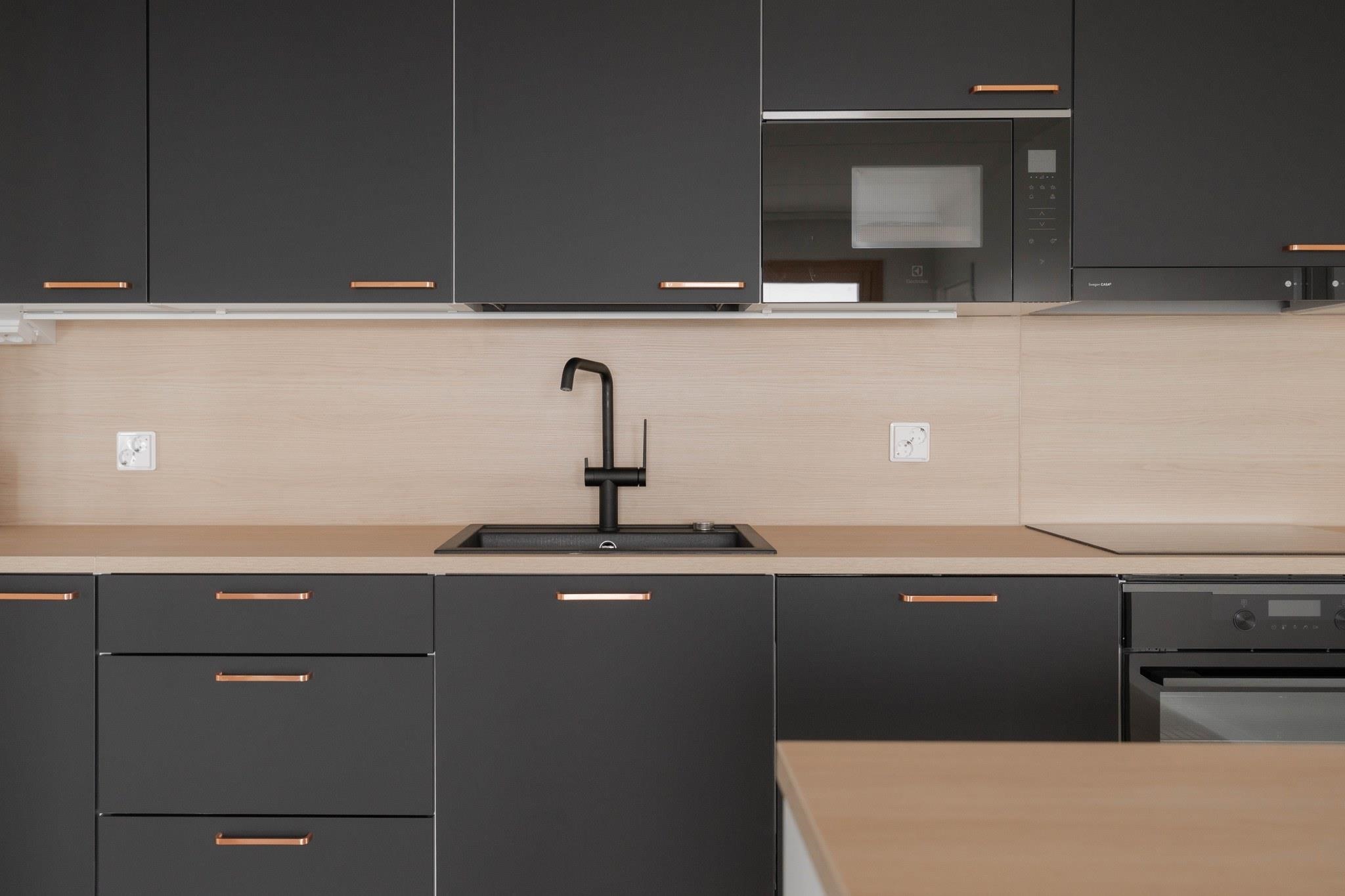 - Jääkaappipakastin, erillisuuni, liesitaso, astianpesukone. Välitilassa laminaattipintainen levy ja LED-nauhavalaisin.