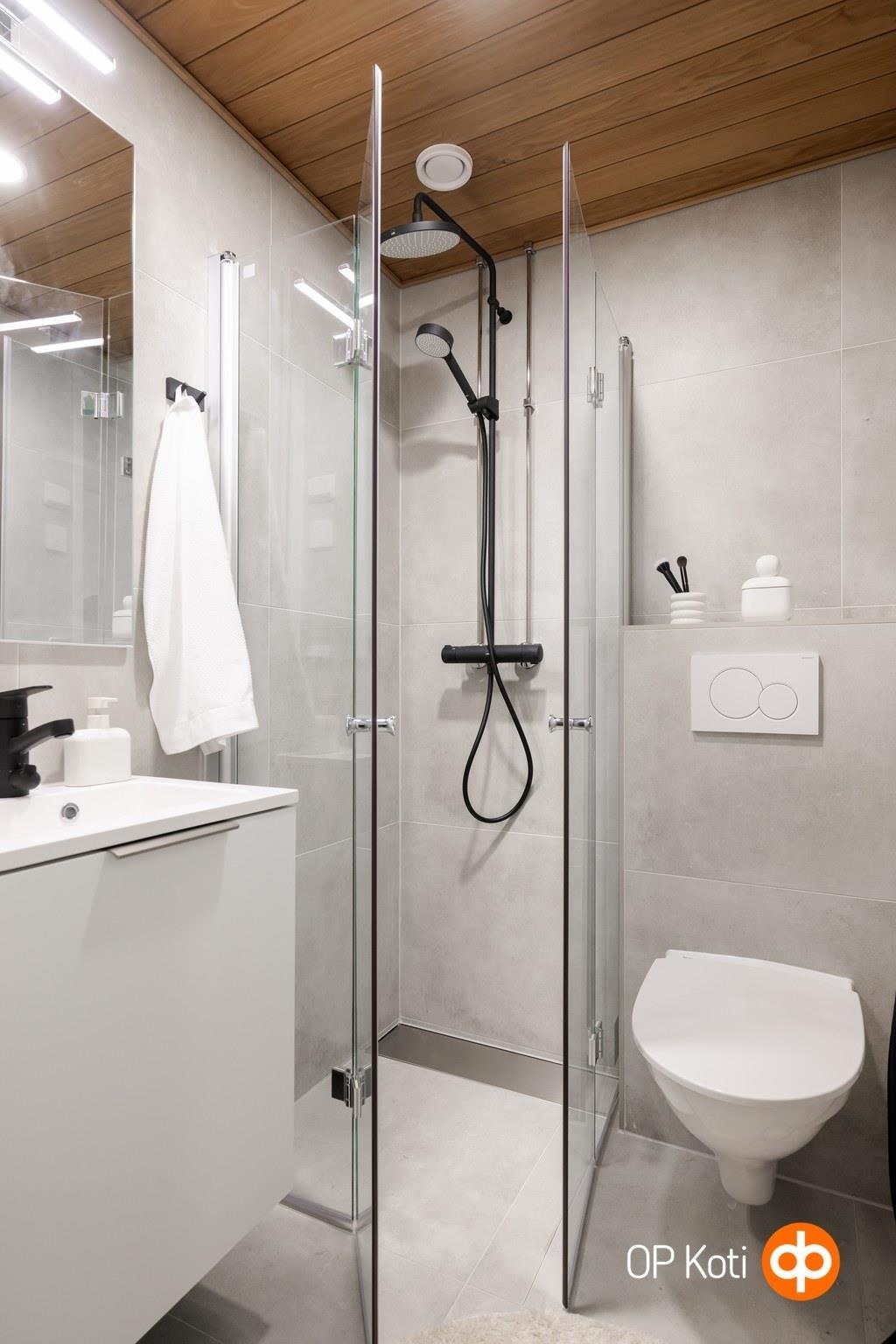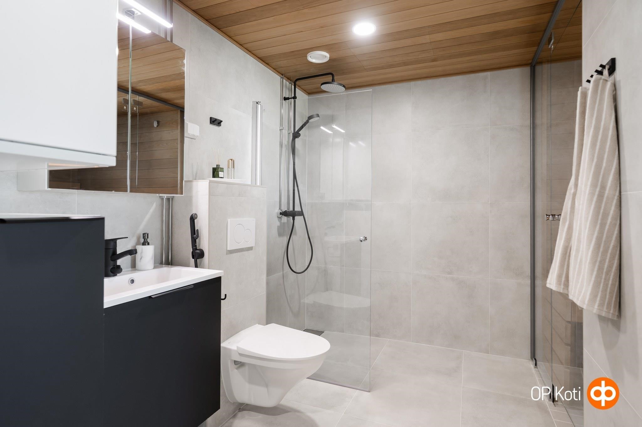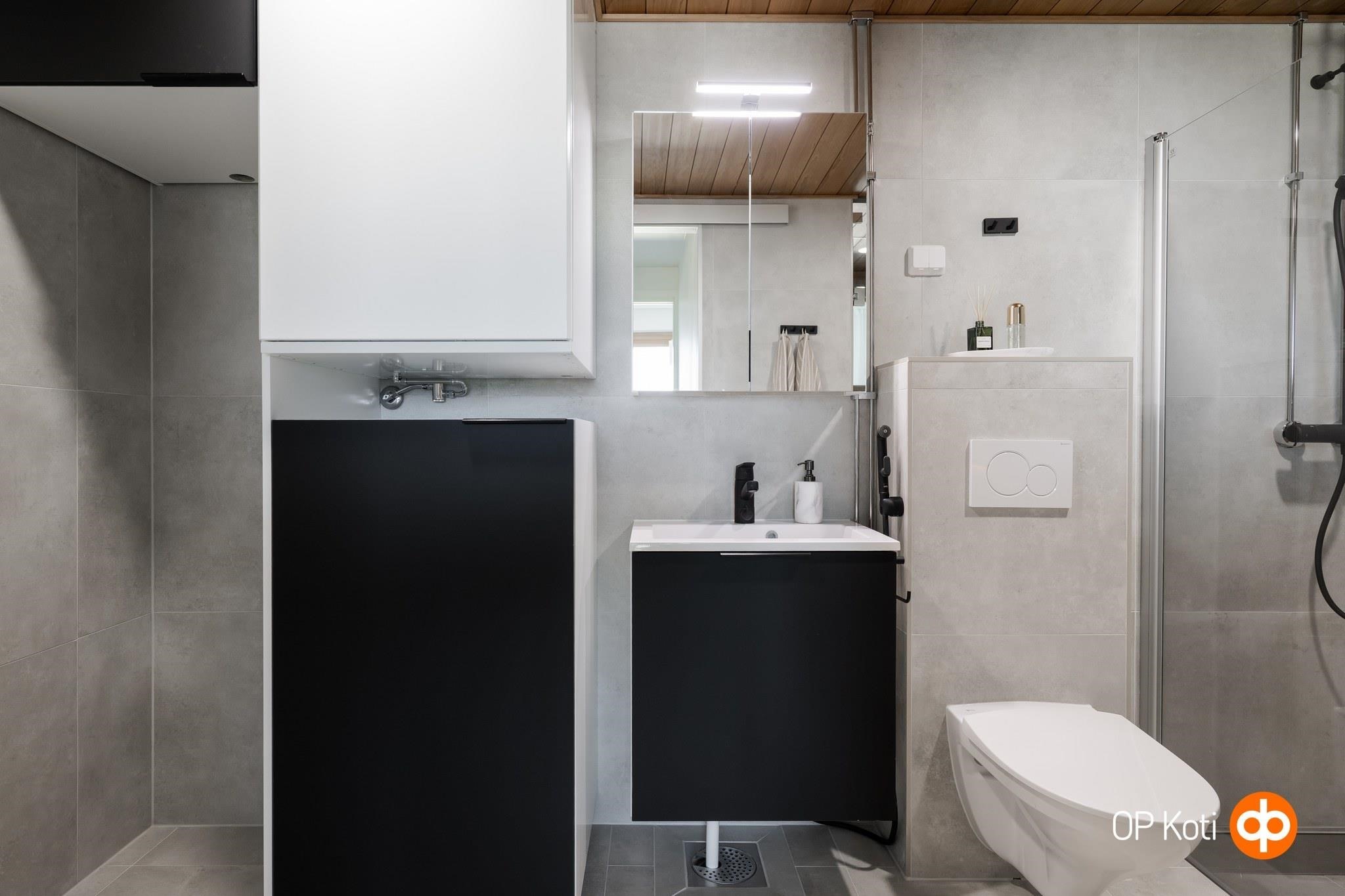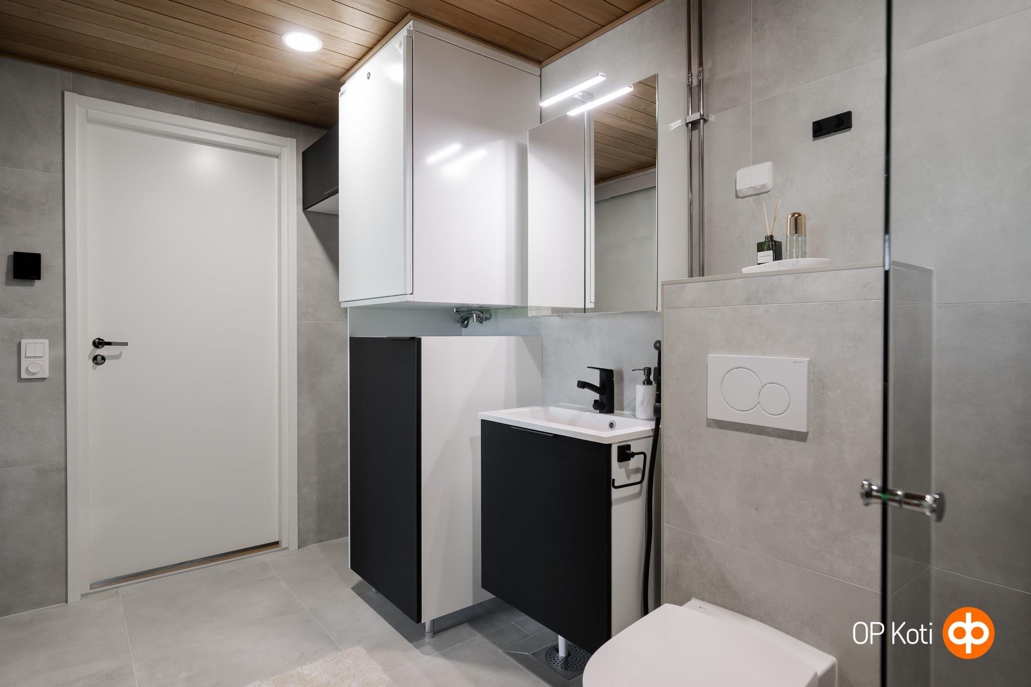 - Kylpyhuone, peilikaappi, kaapit Pyykkikaappi, allaskaappi, pesukoneliitäntä, lattialämmitys sähköinen mukavuuslattialämmitys.