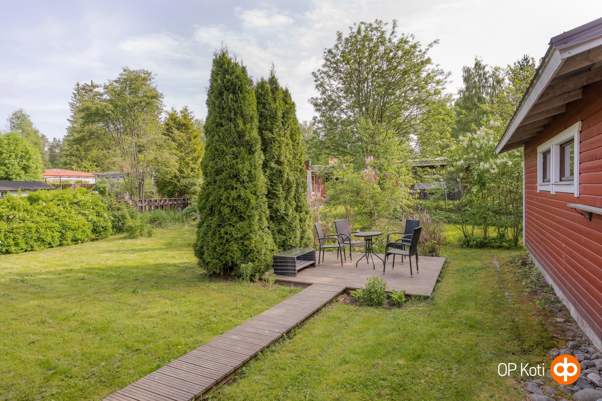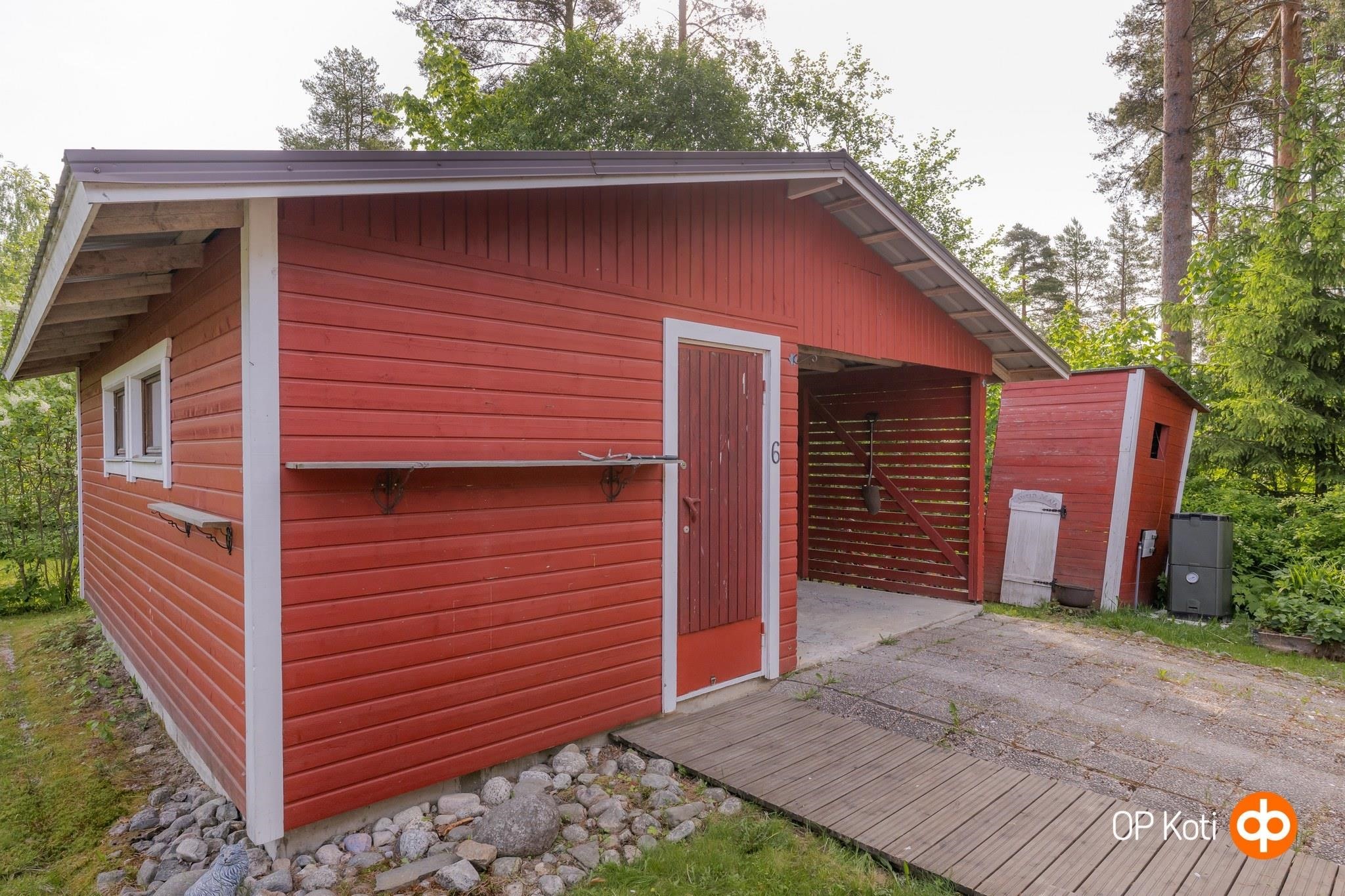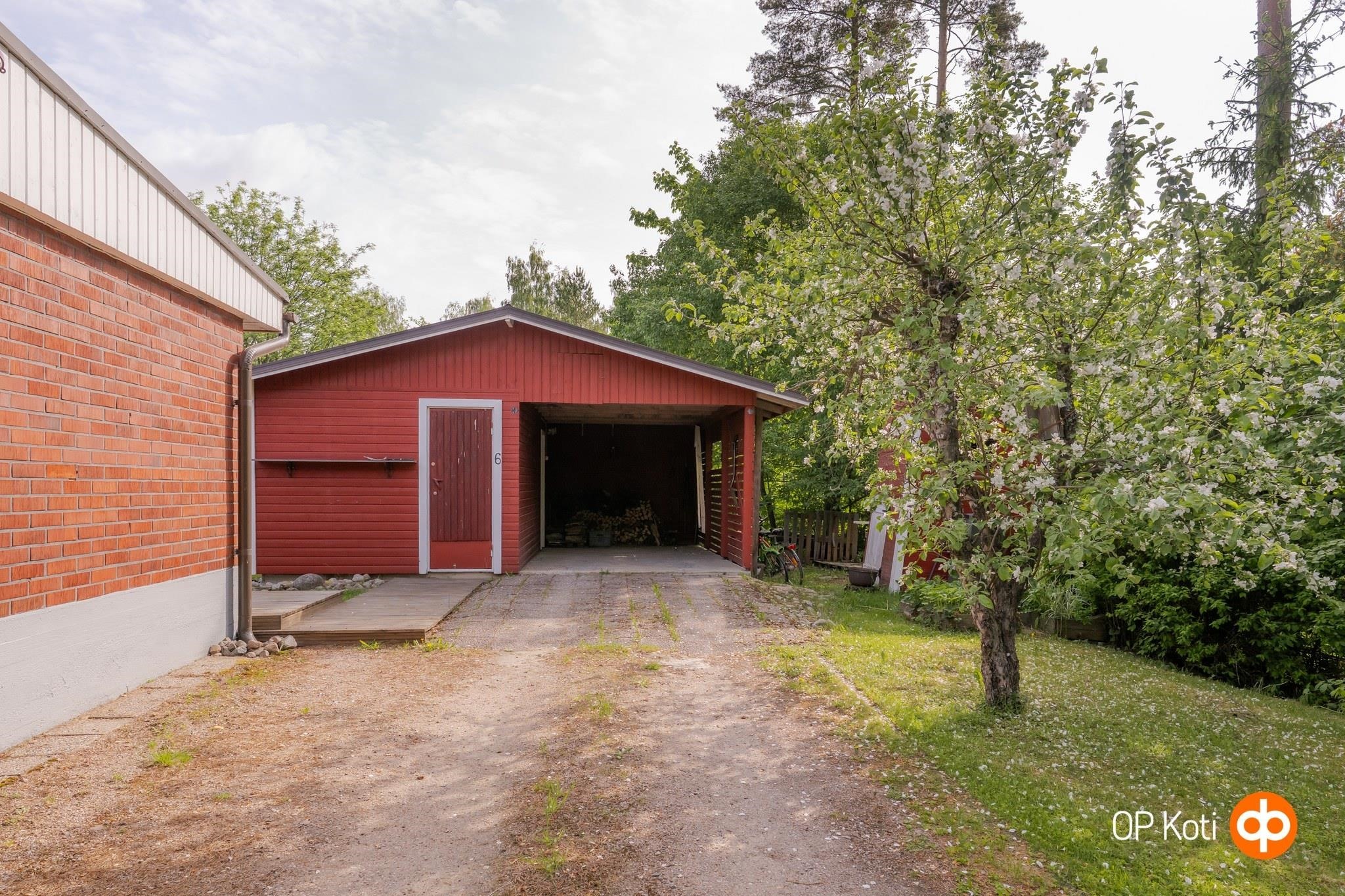 Tontti rajautuu vieressä olevaan metsään ja sijaitsee autotien päässä, mukavasti omassa rauhassaan. Talon etupuolelta löytyy viihtyisä pihapiiri, jonne mahtuvat niin lasten trampoliini, pihapelit, kuin pergolakin, jolle rakennettu oma terassi tarjoaa mukavan tilan istuskeluun ja kesäiltojen viettämiseen. Pihasta löytyy myös reilun kokoinen autokatos, jonka yhteydessä oleva varasto antaa paljon tilaa säilytykseen.