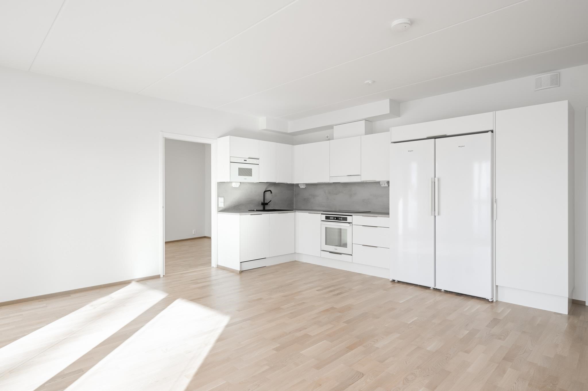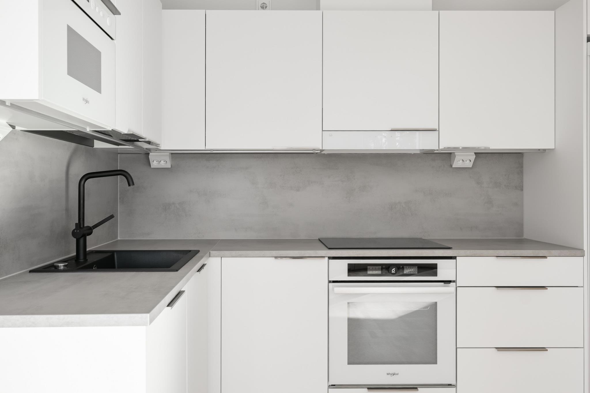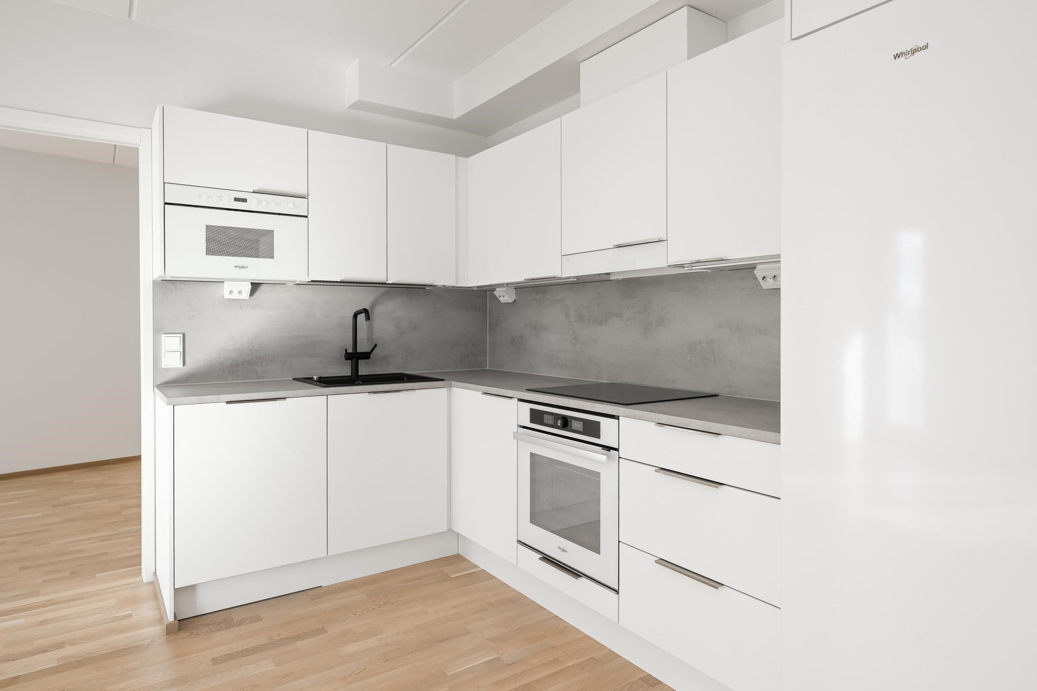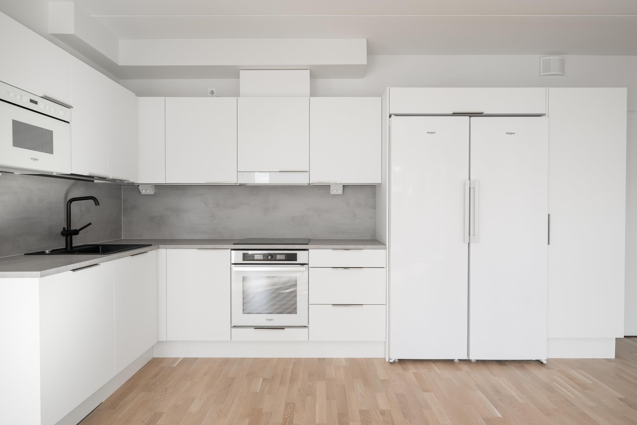 - Keittiöissä on jääkaappipakastin tai erilliset jää- ja pakastinkaappi piirustusten mukaan. Lisäksi erillisuuni, induktioliesi ja liesikupu. Astianpesukone ja mikro ovat kalusteisiin integroituja. Työpöytätasot ovat laminaattipintaisia, joissa on komposiittialtaat. Keittiöiden kalustovälit ovat kalustevälilaminaattia tai laattaa.