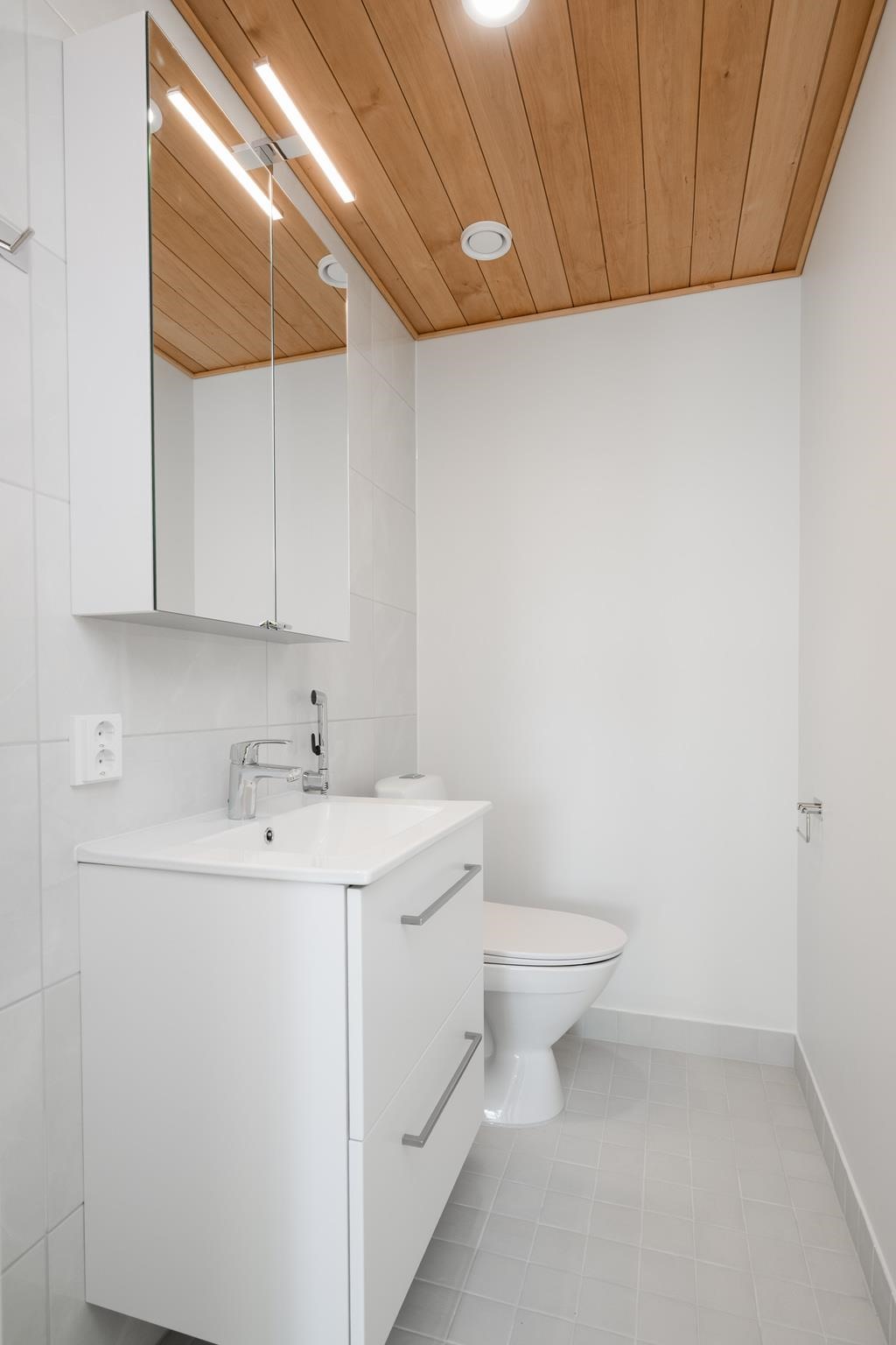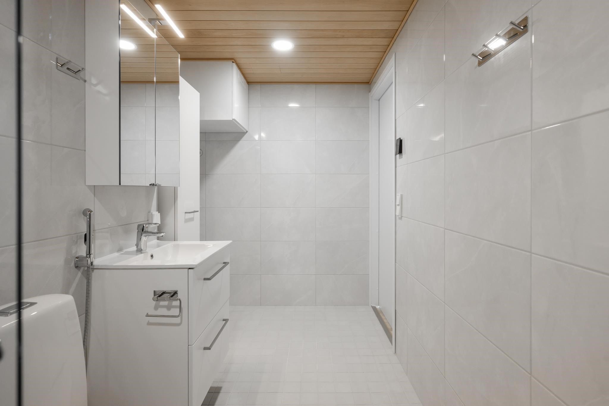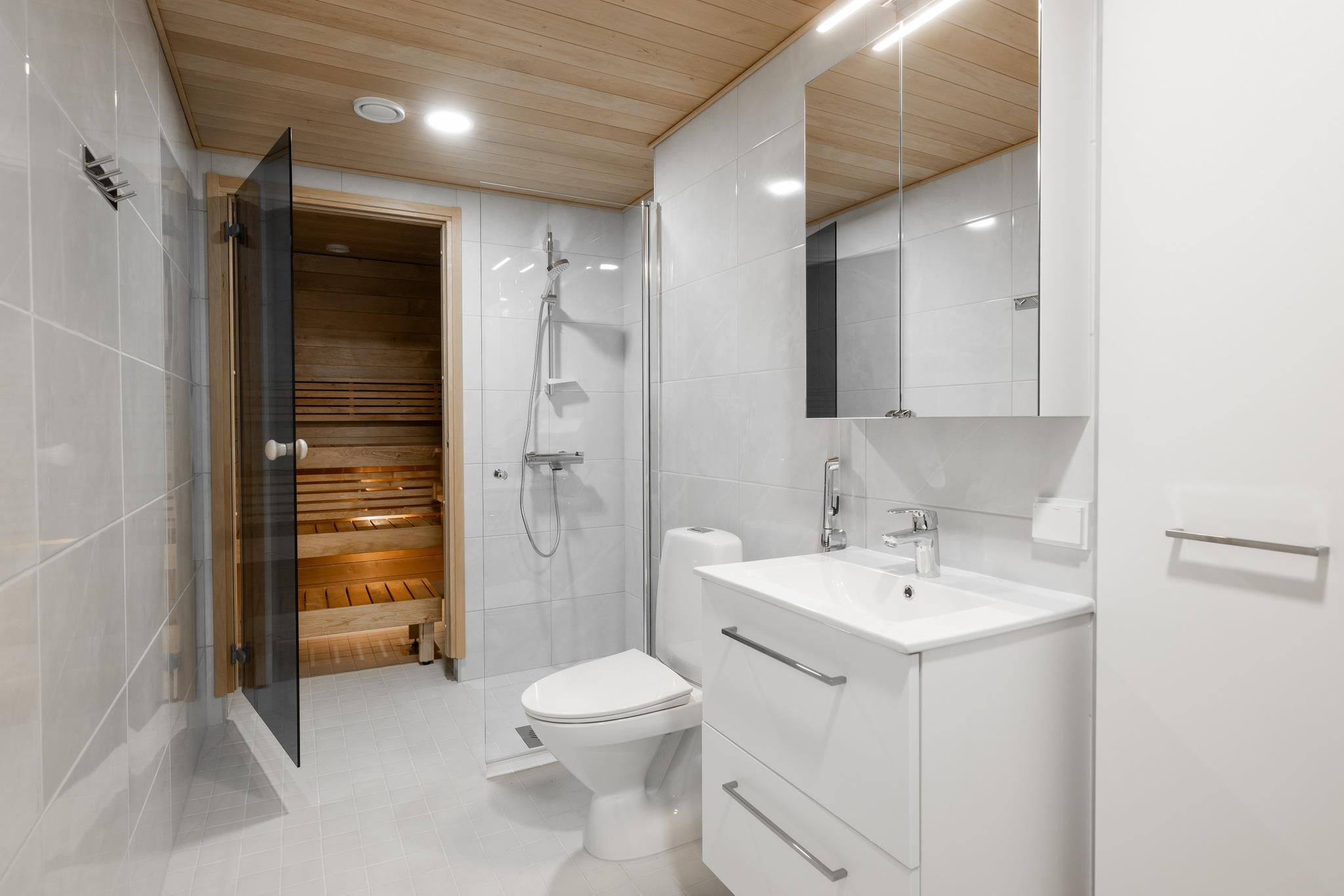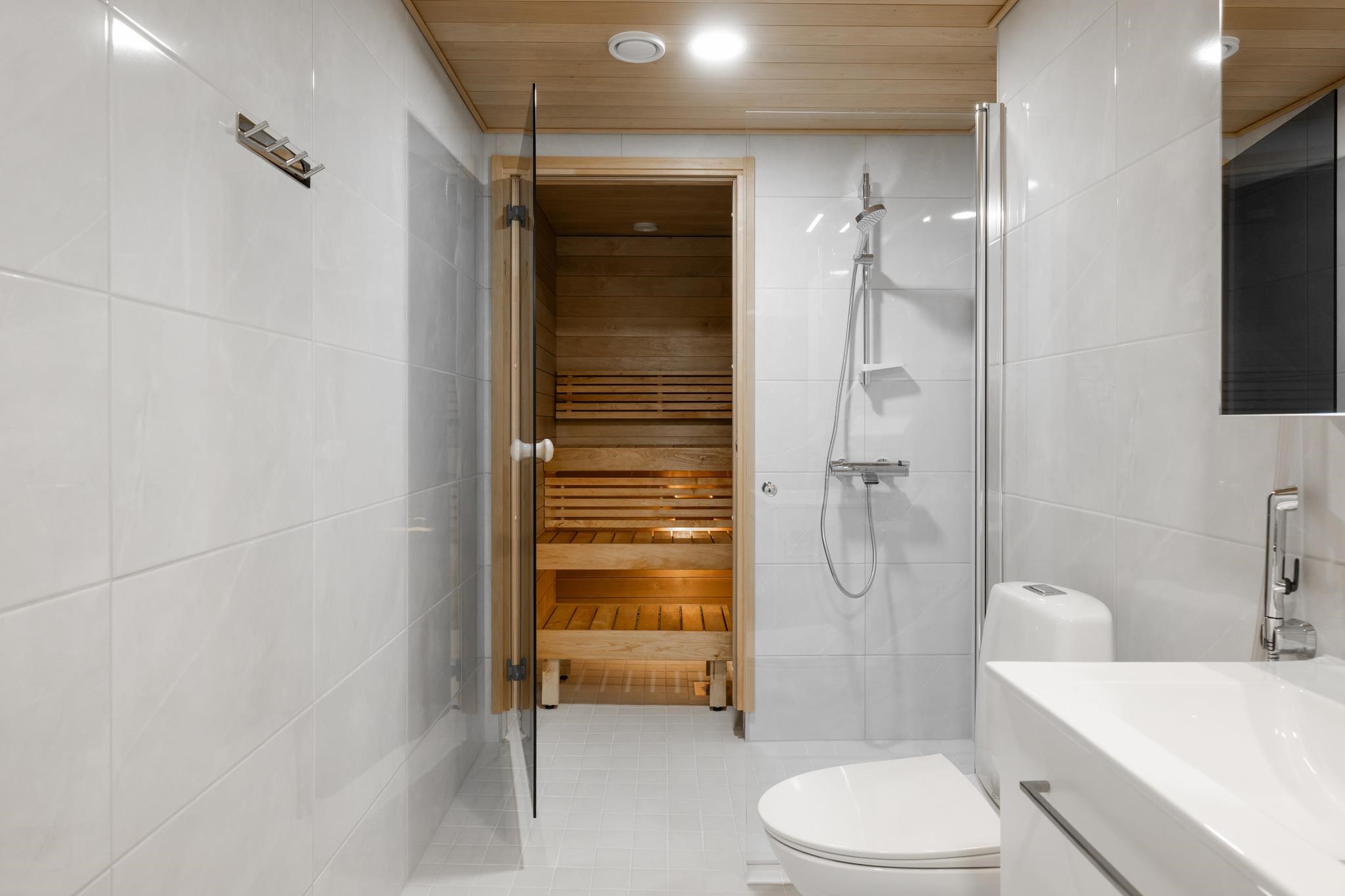 - Wc-tilojen, saunojen ja pesuhuoneiden lattiat laatoitetaan. Seinäpinnoista laatoitetaan kylpyhuoneiden seinät kokonaan, altaiden taustaseinät wc-tiloista. Saunan seinät, katto ja lauteet ovat tervaleppää. Saunaan asennetaan sähkökiuas esim. Harvia Cilindro erillisellä ohjauspaneelilla. Pesuhuoneissa on liitännät pyykinpesukoneelle ja kuivausrummulle. Pesuhuoneissa on allas- ja peilikaappi tai peili valaisimella.