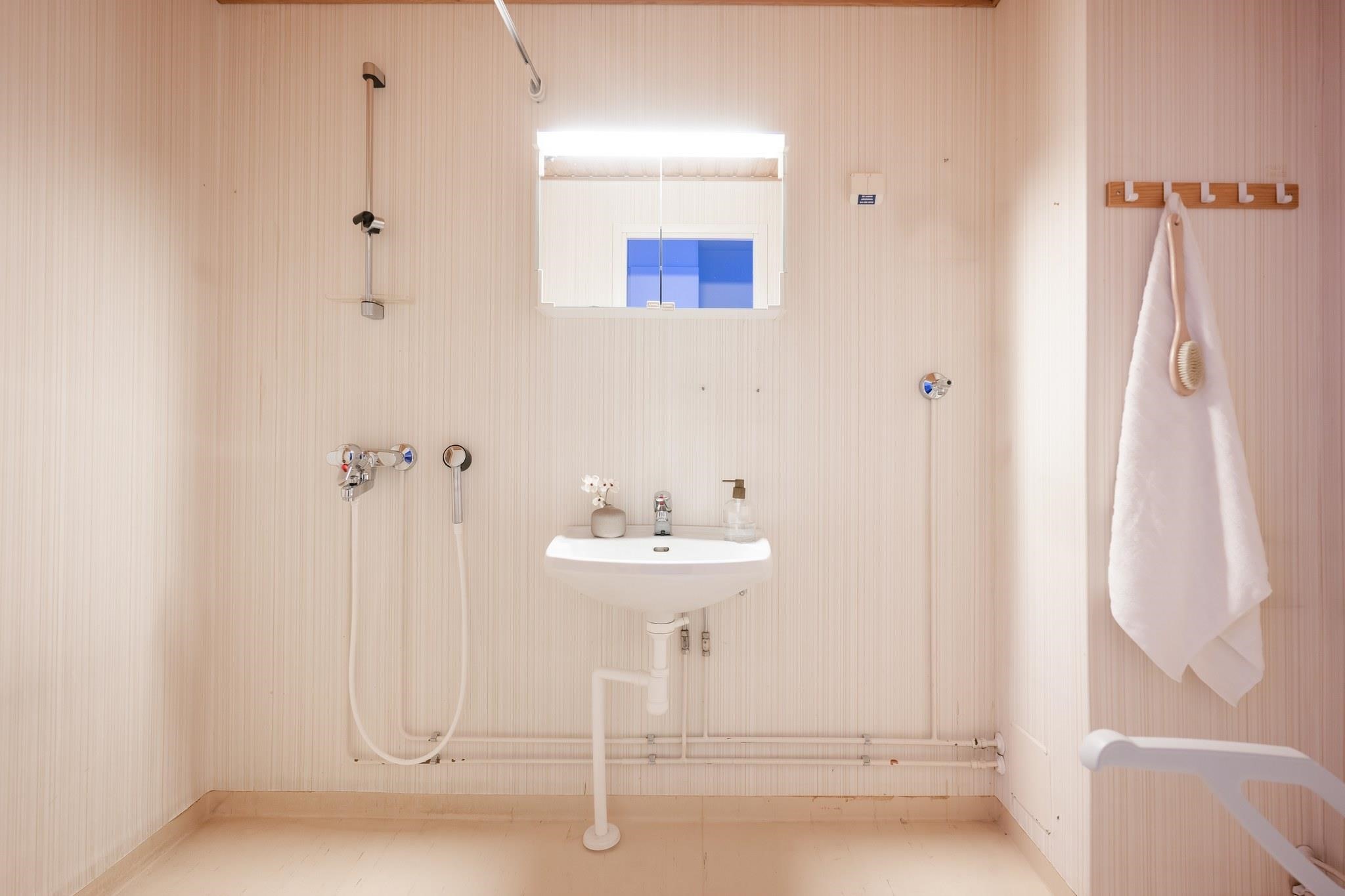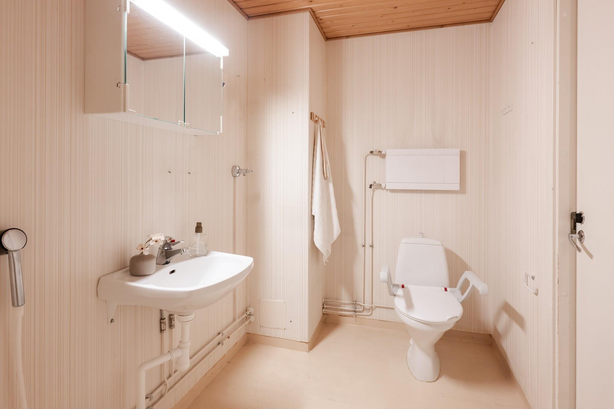- Sauna, sähkökiuas, kylpyhuone, suihku, peilikaappi, pesukoneliitäntä, kiinteät valaisimet. Sauna ja kylpyhuone ovat alkuperäiset, mutta siistit.