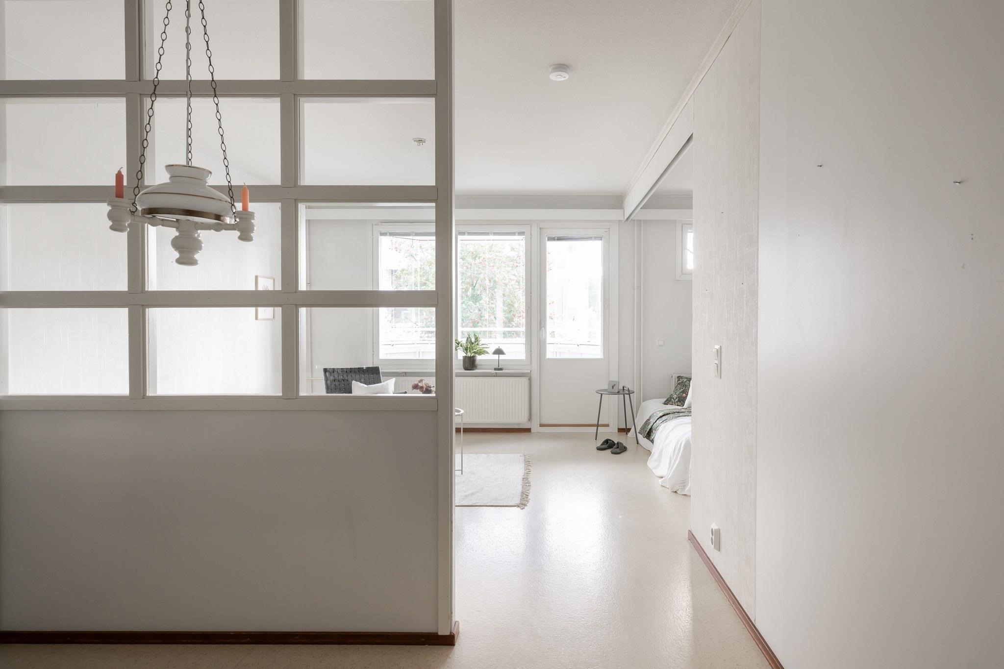 Asunnon sydän sykkii Alvar Aaltomaista henkeä lasiruutuisen väliseinän kautta, joka jakaa keittiön ja olohuoneen.