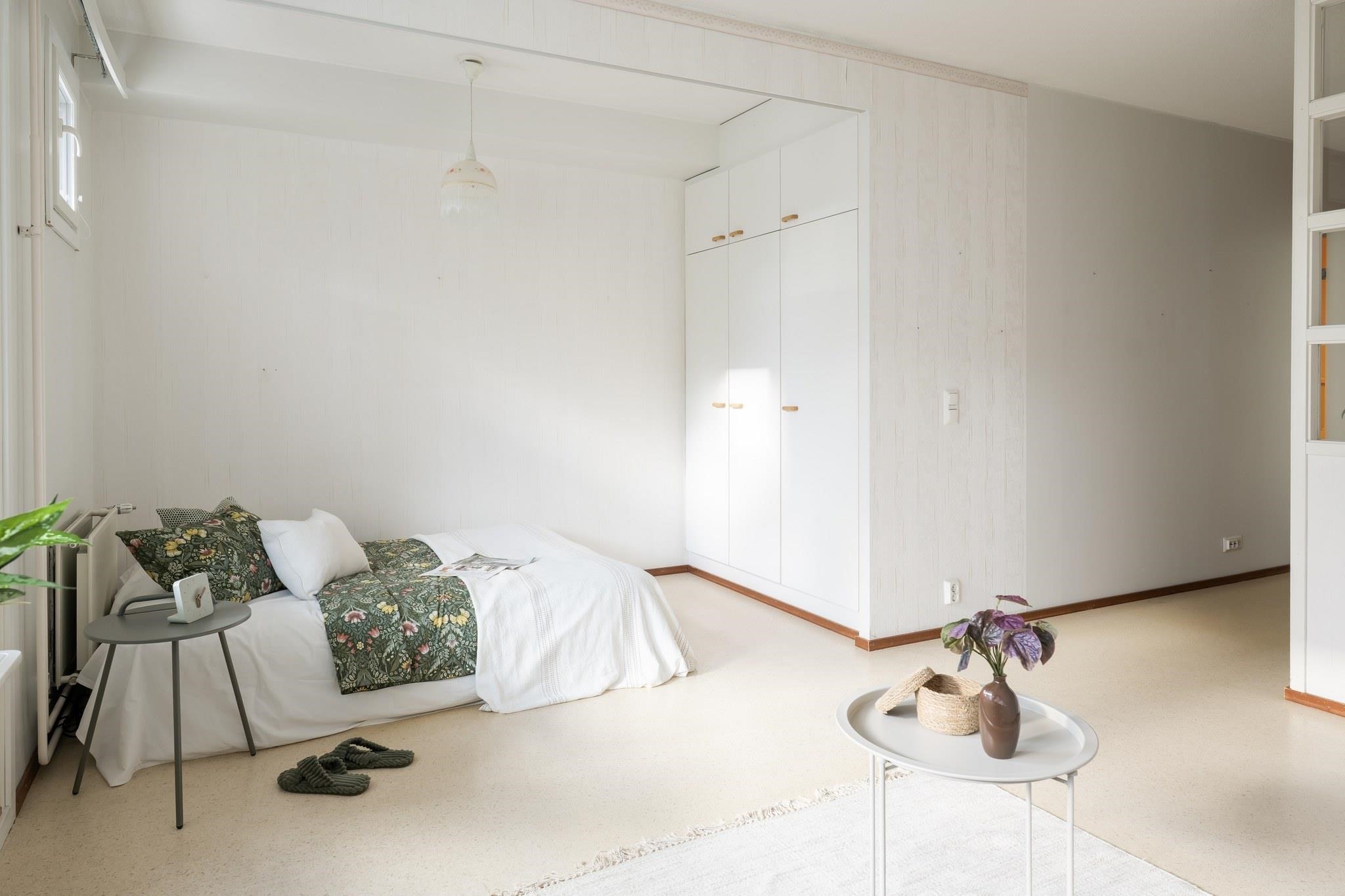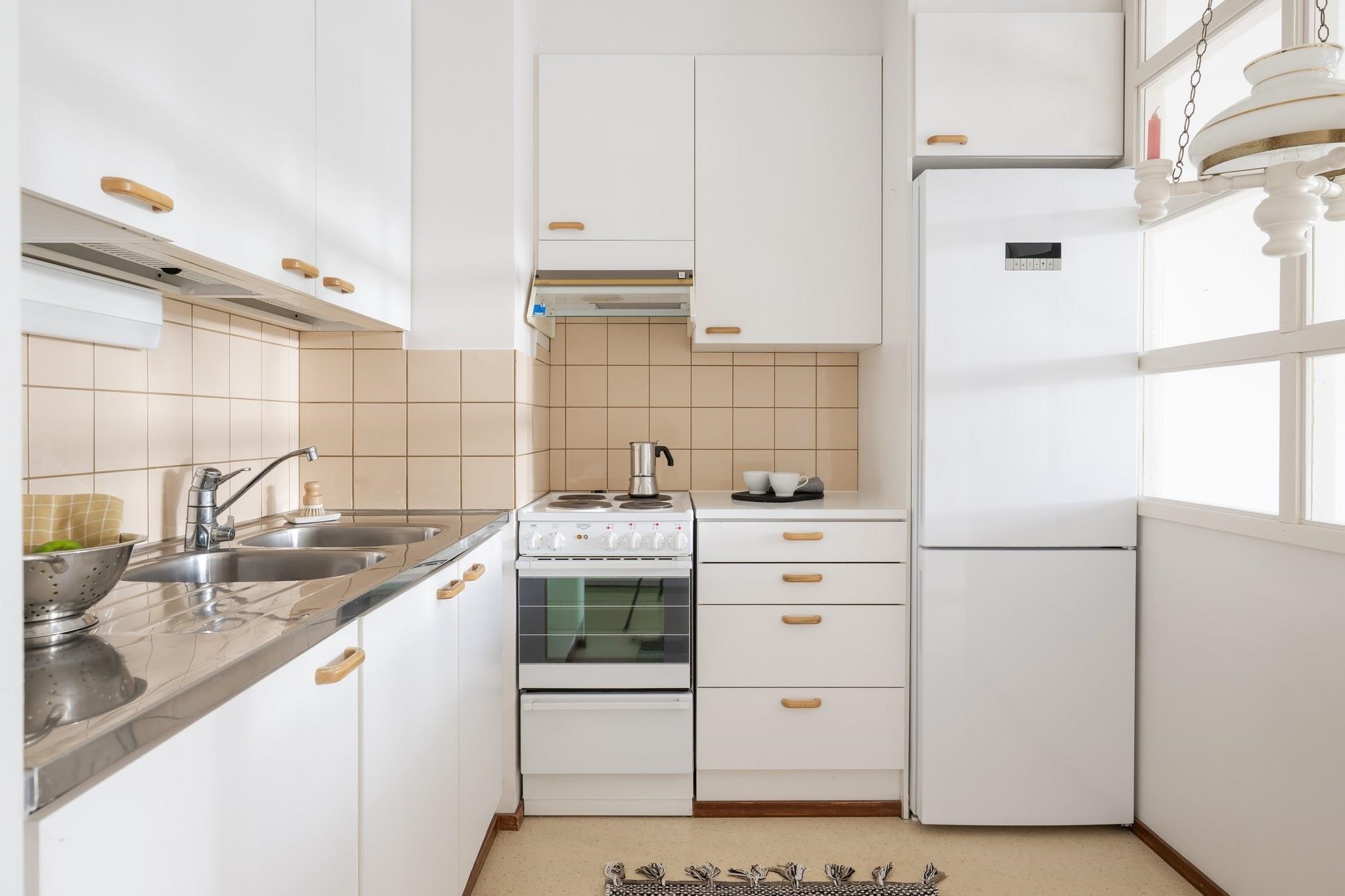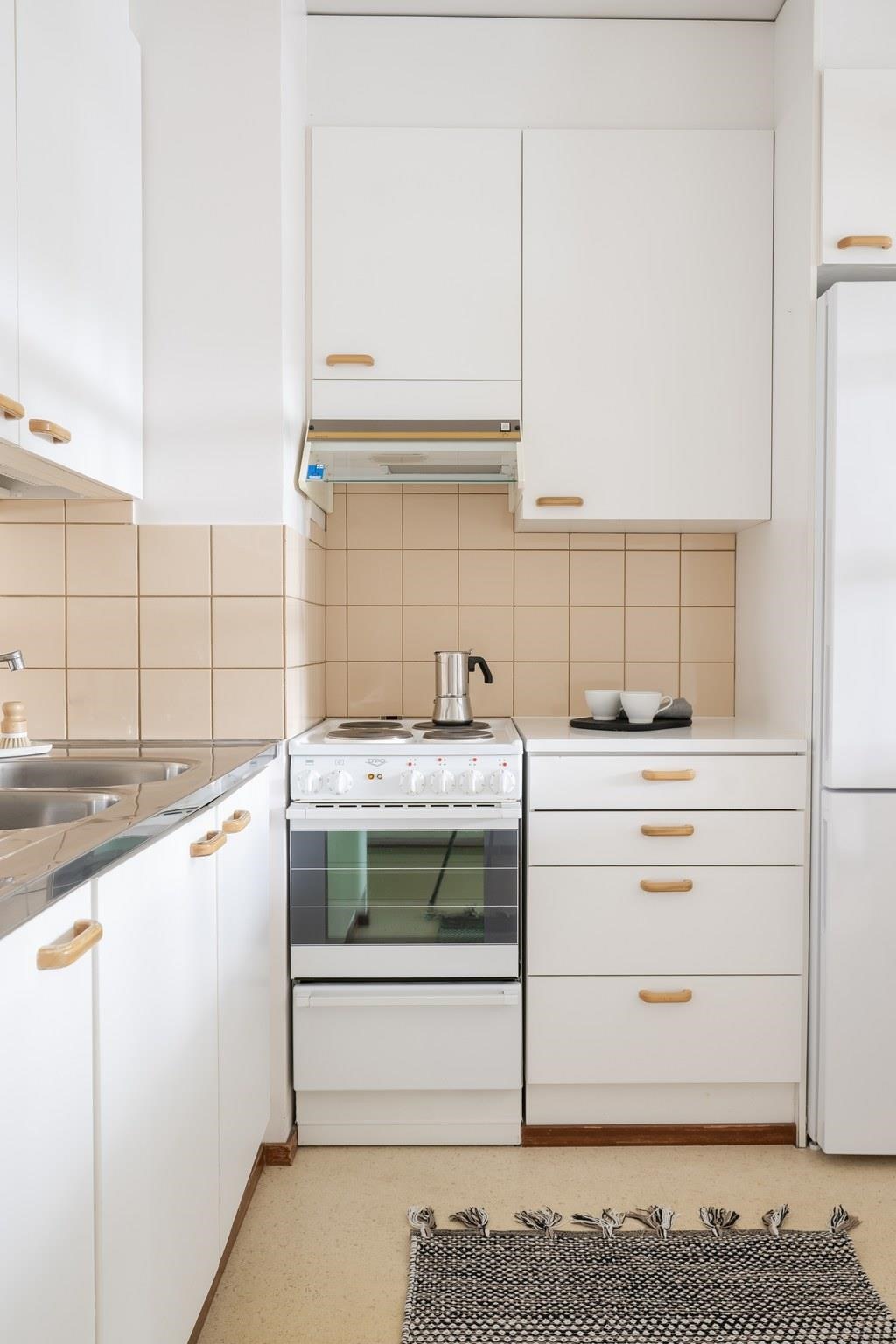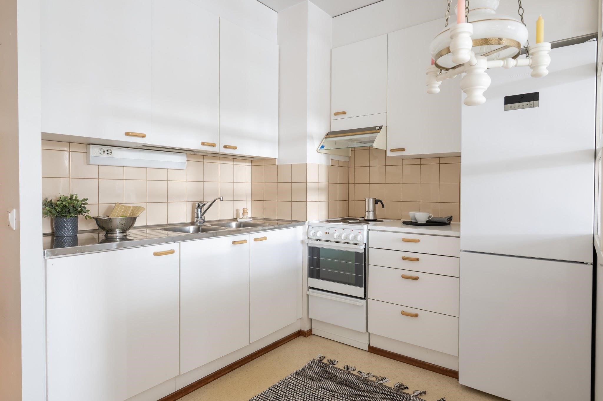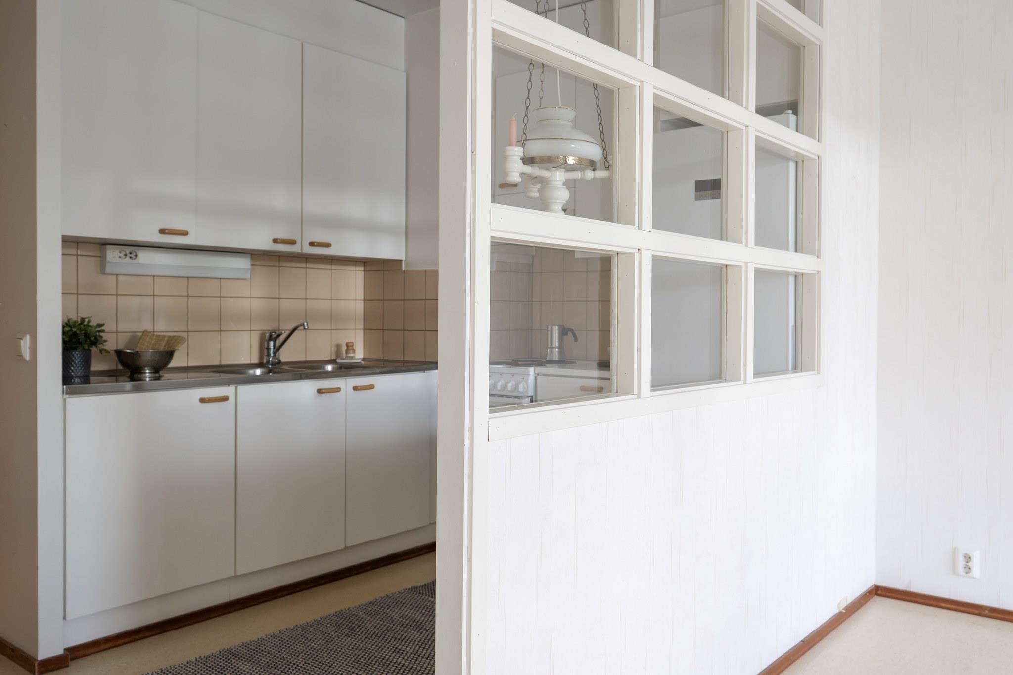Asunto on alkuperäisessä, mutta siistissä kunnossa. Päästä luova itsesi valloilleen ja remontoi pinnat, niin saat näköisesi asunnon.