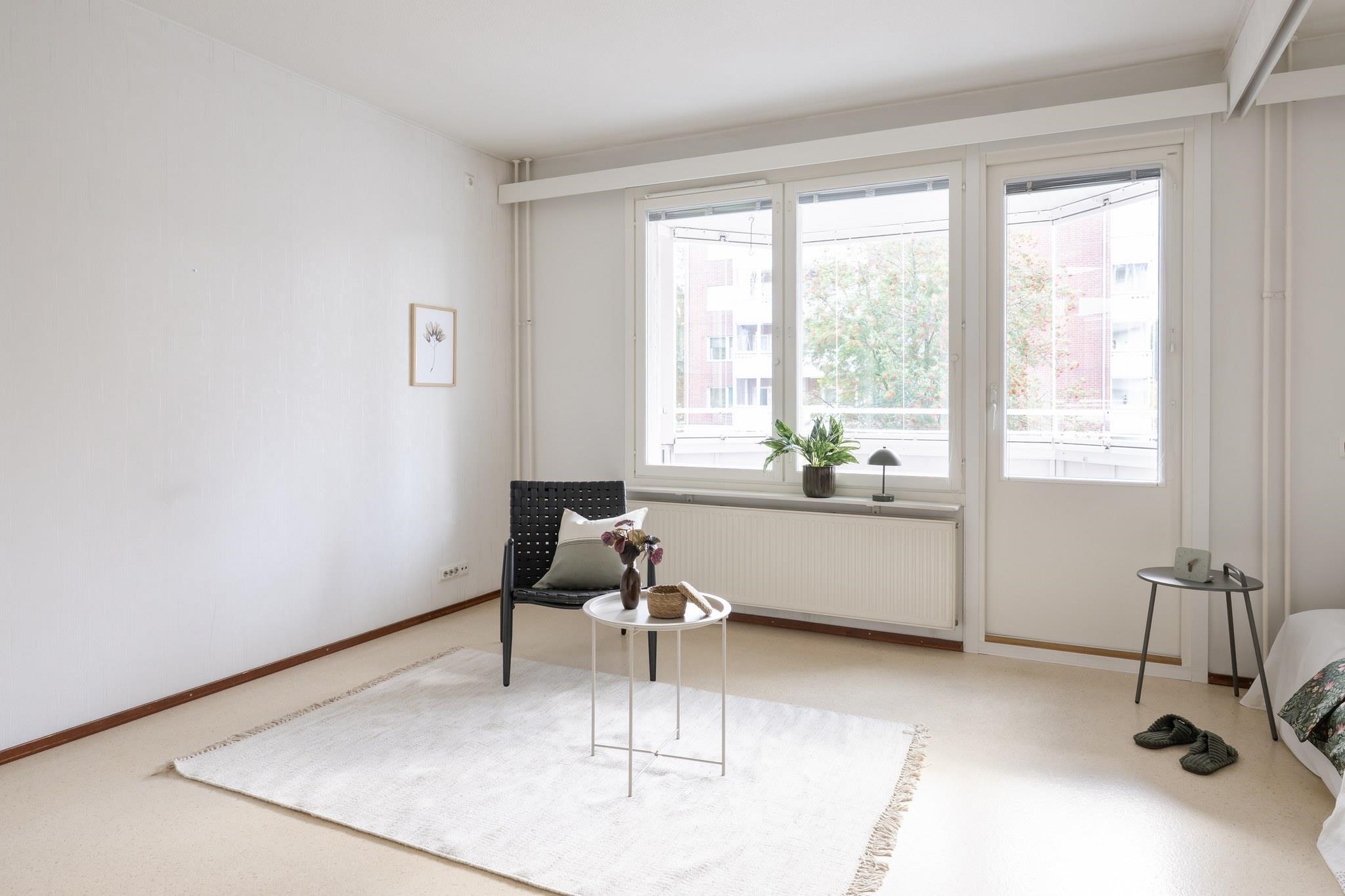 Kuvittele koti, joka hengittää rauhaa. Suhteellisen iso erkkeriparveke avautuu sisäpihan puolelle, ja tarjoaa tilan, jossa voit nauttia aamukahvisi auringon nousun säestäessä.