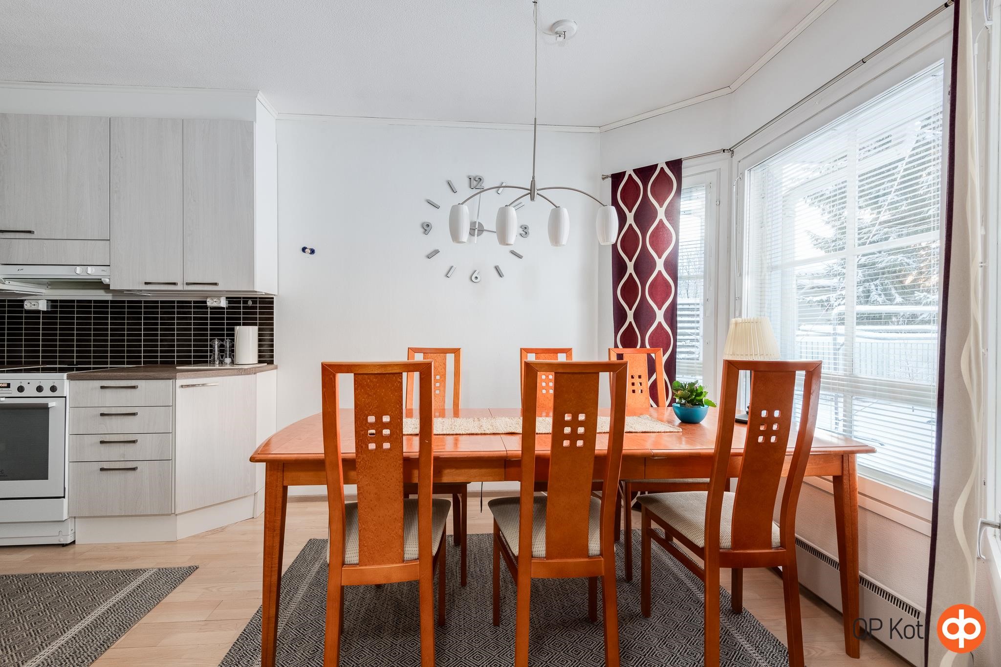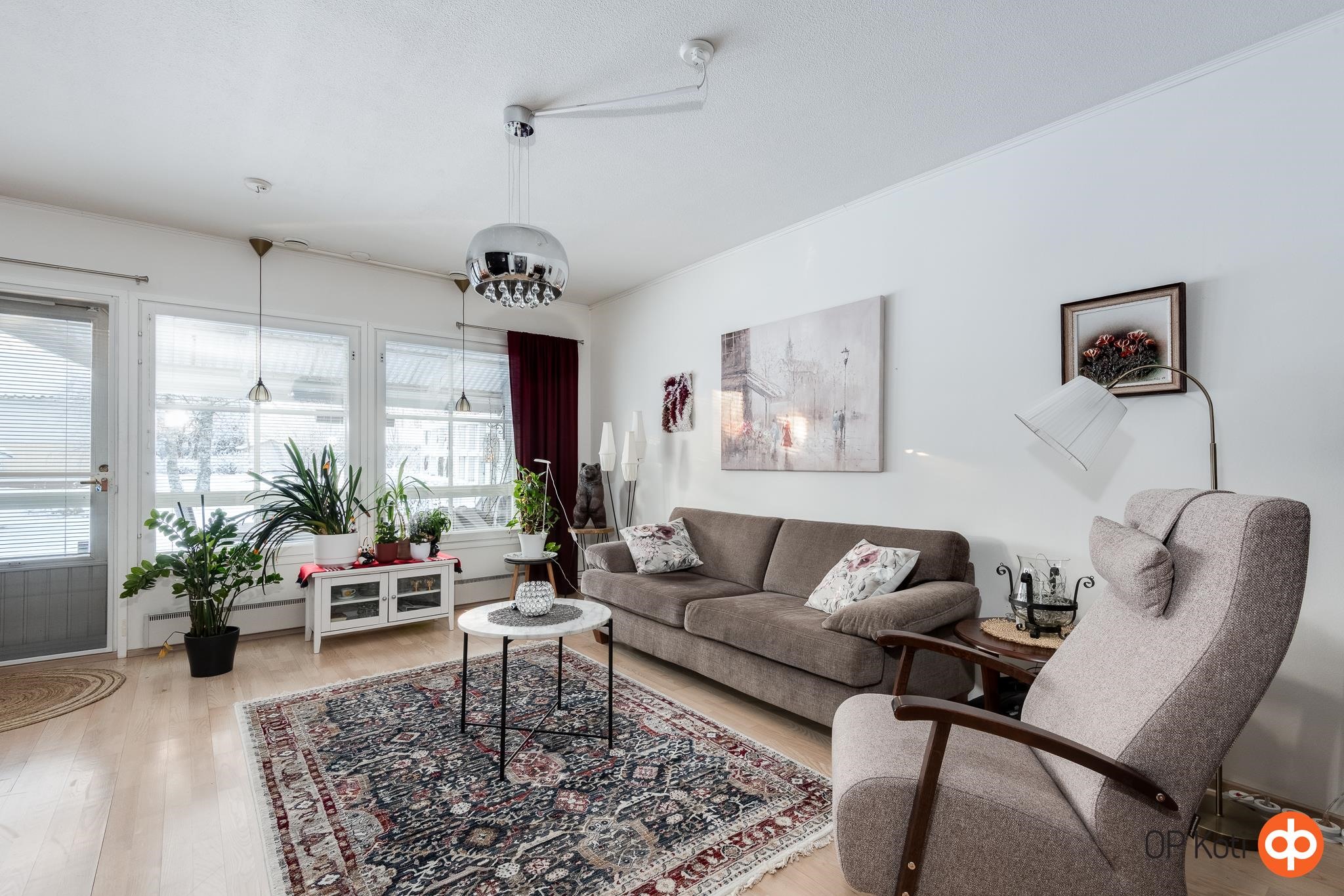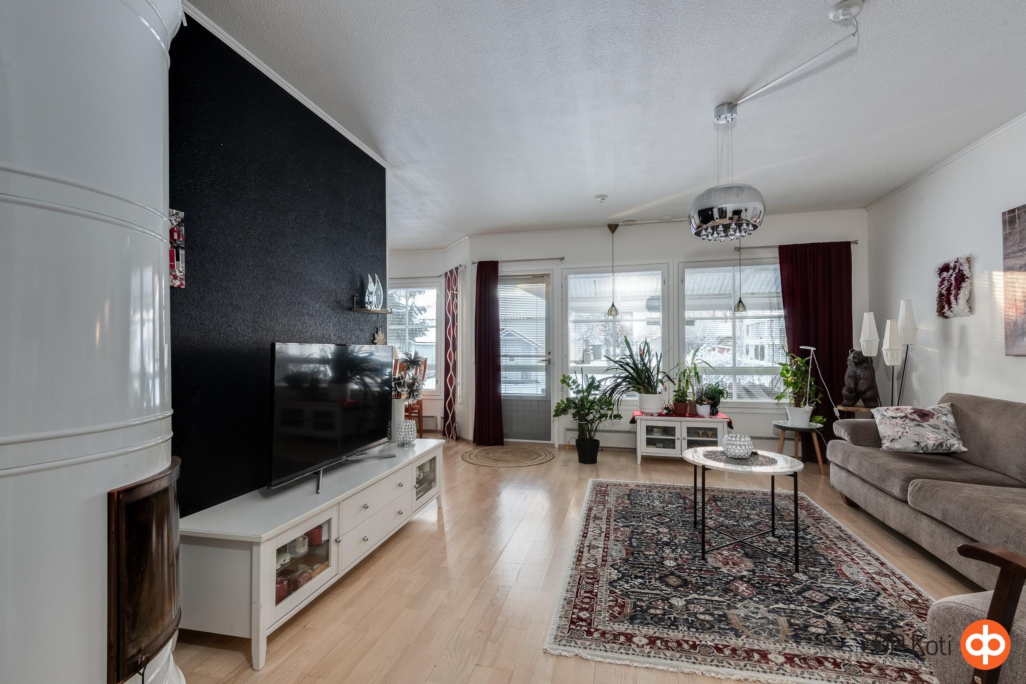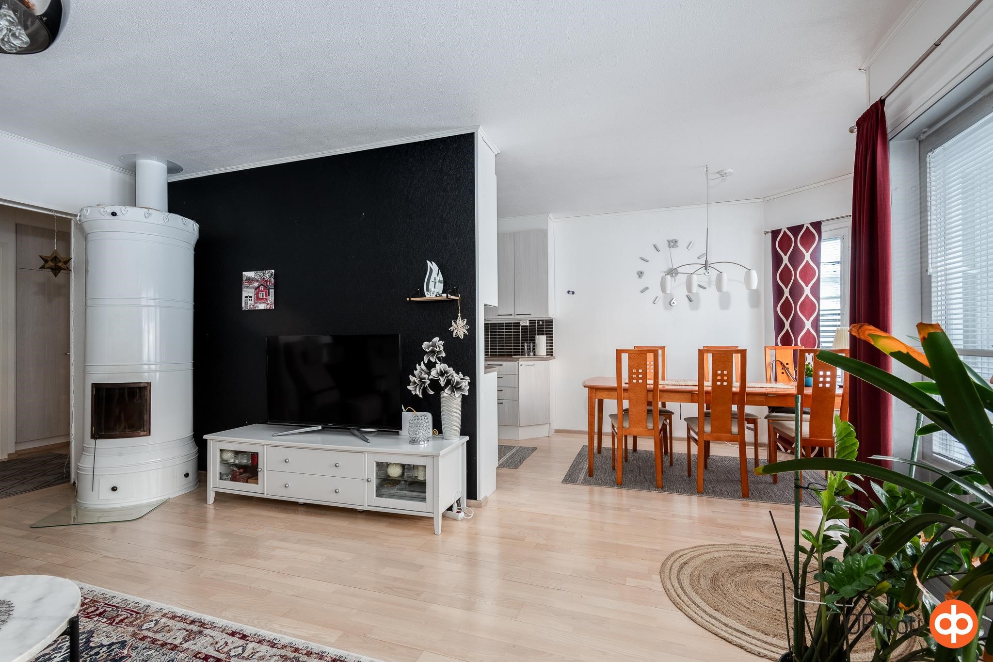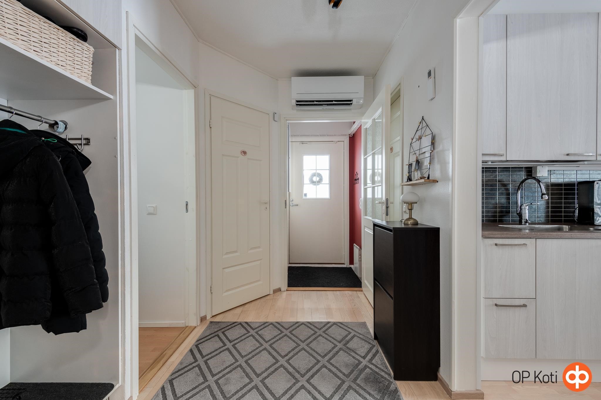 Asunnossa on neljä huonetta, tilava keittiö sekä oma sauna, joka on remontoitu viime vuosina. Kodin pohjaratkaisu on käytännöllinen: keittiö on uusittu 2016 ja varustettu modernilla kalustuksella sekä astianpesukoneella. Olohuoneessa on tilaa suuremmallekin ruokapöydälle ja sohvaryhmälle. Makuuhuoneet ovat rauhallisia, ja säilytystilaa löytyy vaatehuoneesta sekä ulkovarastosta. Kylpyhuone ja erillinen wc on remontoitu nykyaikaisiksi, ja asunnossa on lisäksi ilmalämpöpumppu. Auton säilytys on helppoa oman autokatoksen ansiosta.