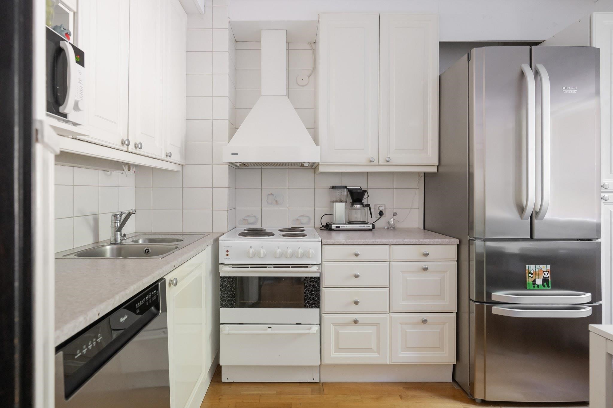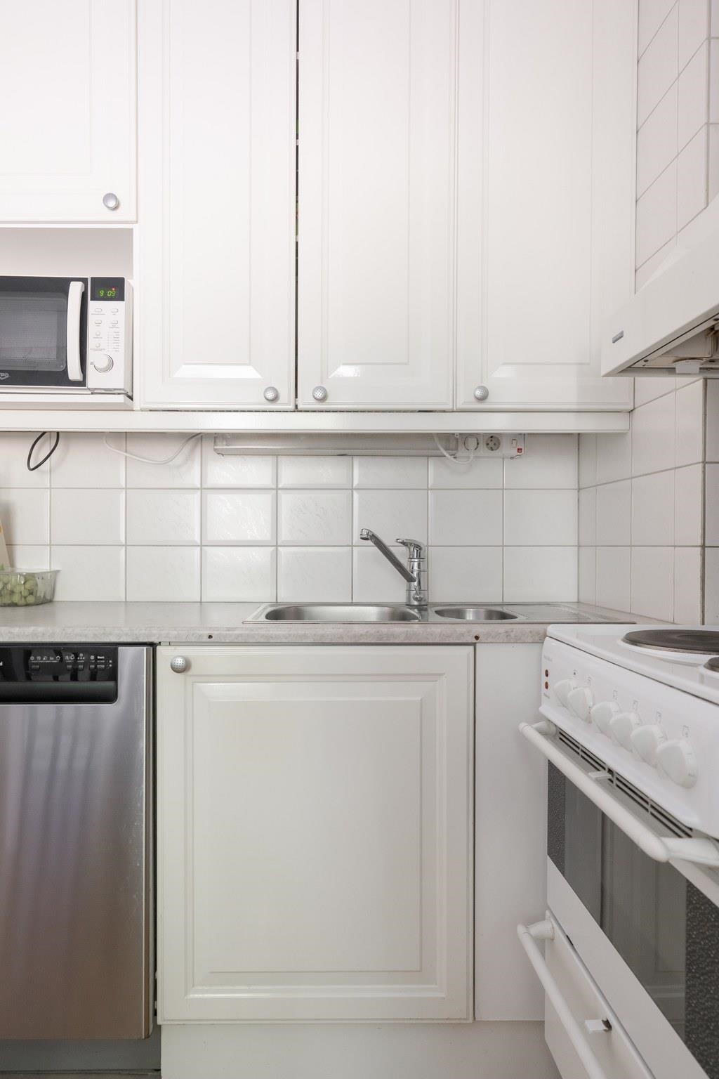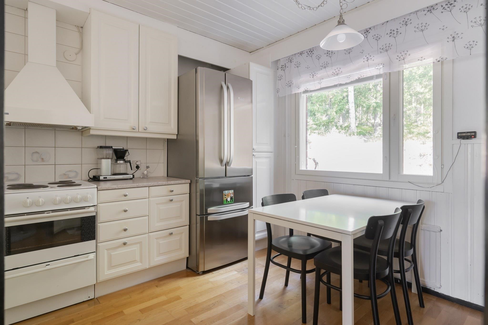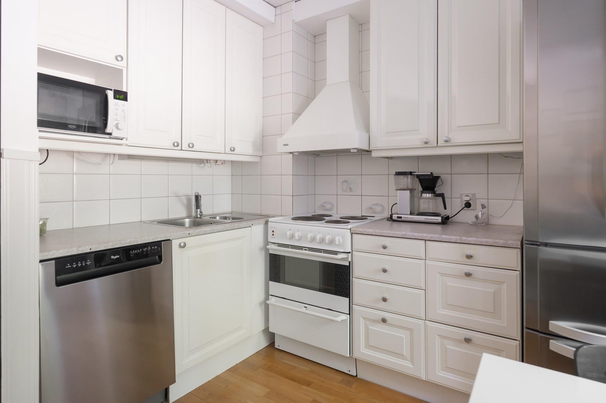 - Jääkaappipakastin, lattialiesi, sähköliesi, liesikupu, astianpesukone, kaapistot, kiinteät valaisimet.