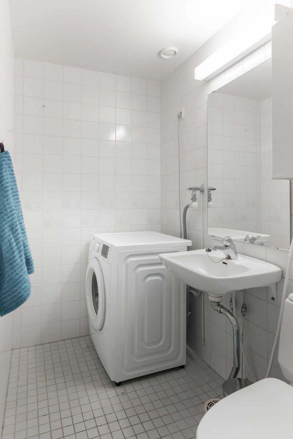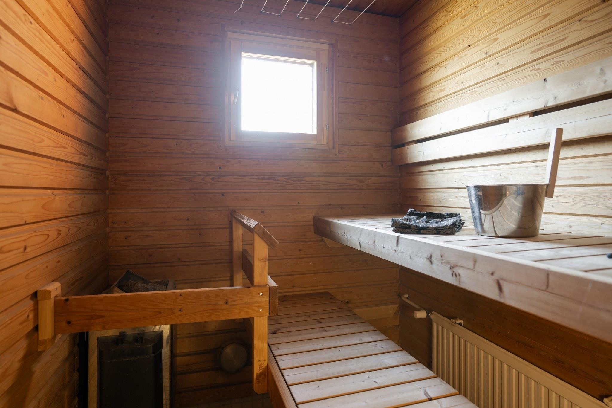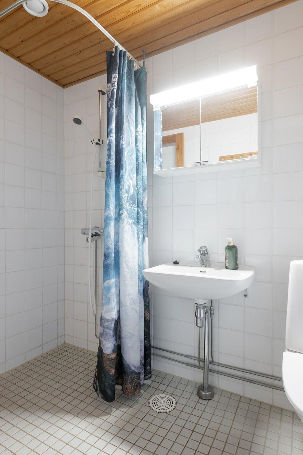 - Sauna, sähkökiuas, kylpyhuone, erillinen wc, suihku, peilit, kaapit, pesukoneliitäntä pesukoneliitäntä sijaitsee alakerran wc-tilassa, kiinteät valaisimet.