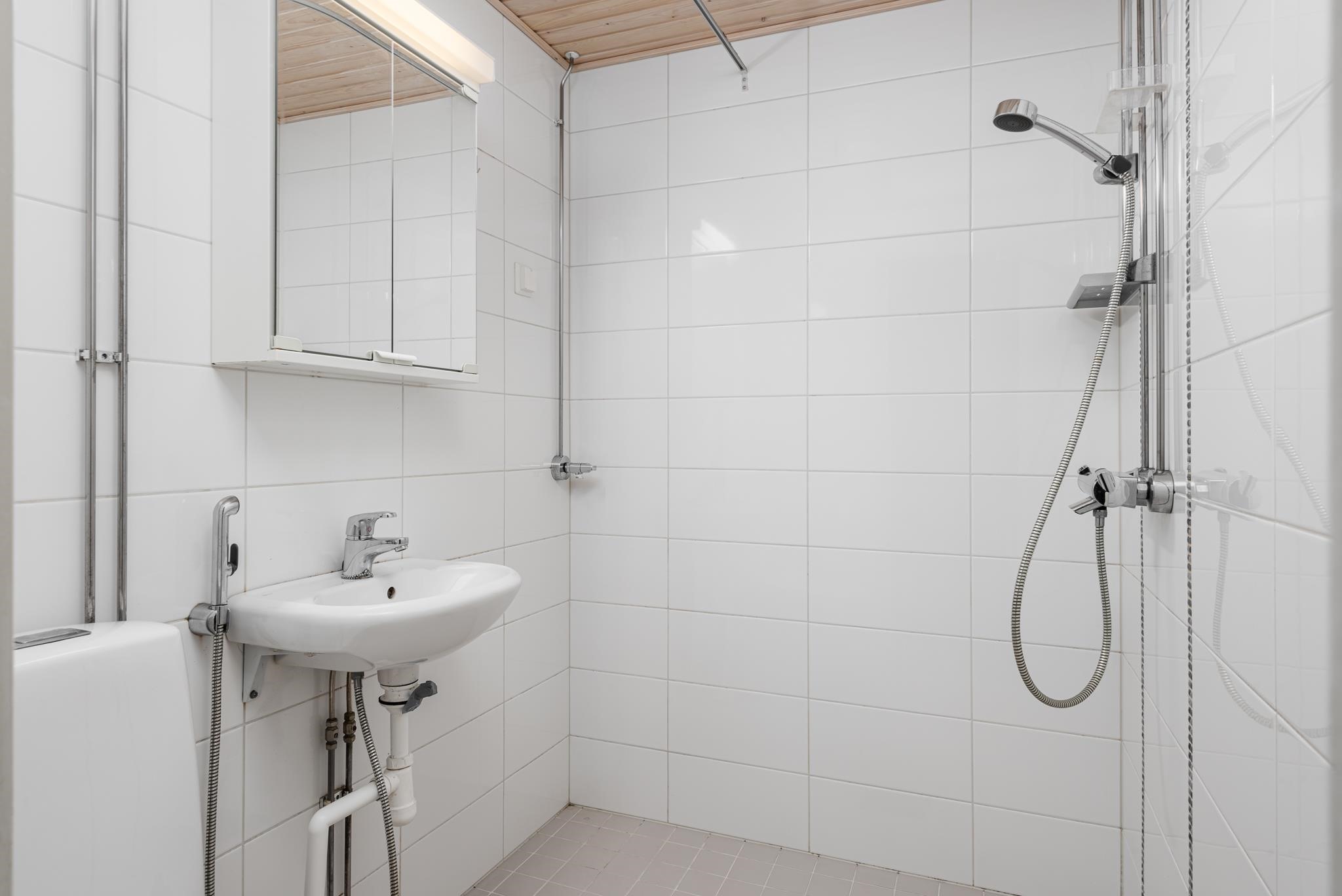 - Kylpyhuone, suihku, peilikaappi, pesukoneliitäntä, lattialämmitys, kiinteät valaisimet.