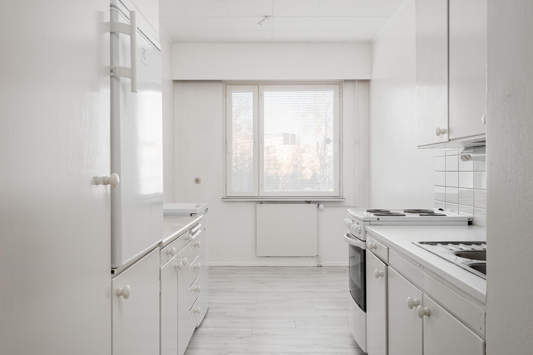 - Ikkunat kahteen suuntaan. Olohuone Presidentinpuistokadulle. Keittö ja makuuhuone sisäpihalle.
