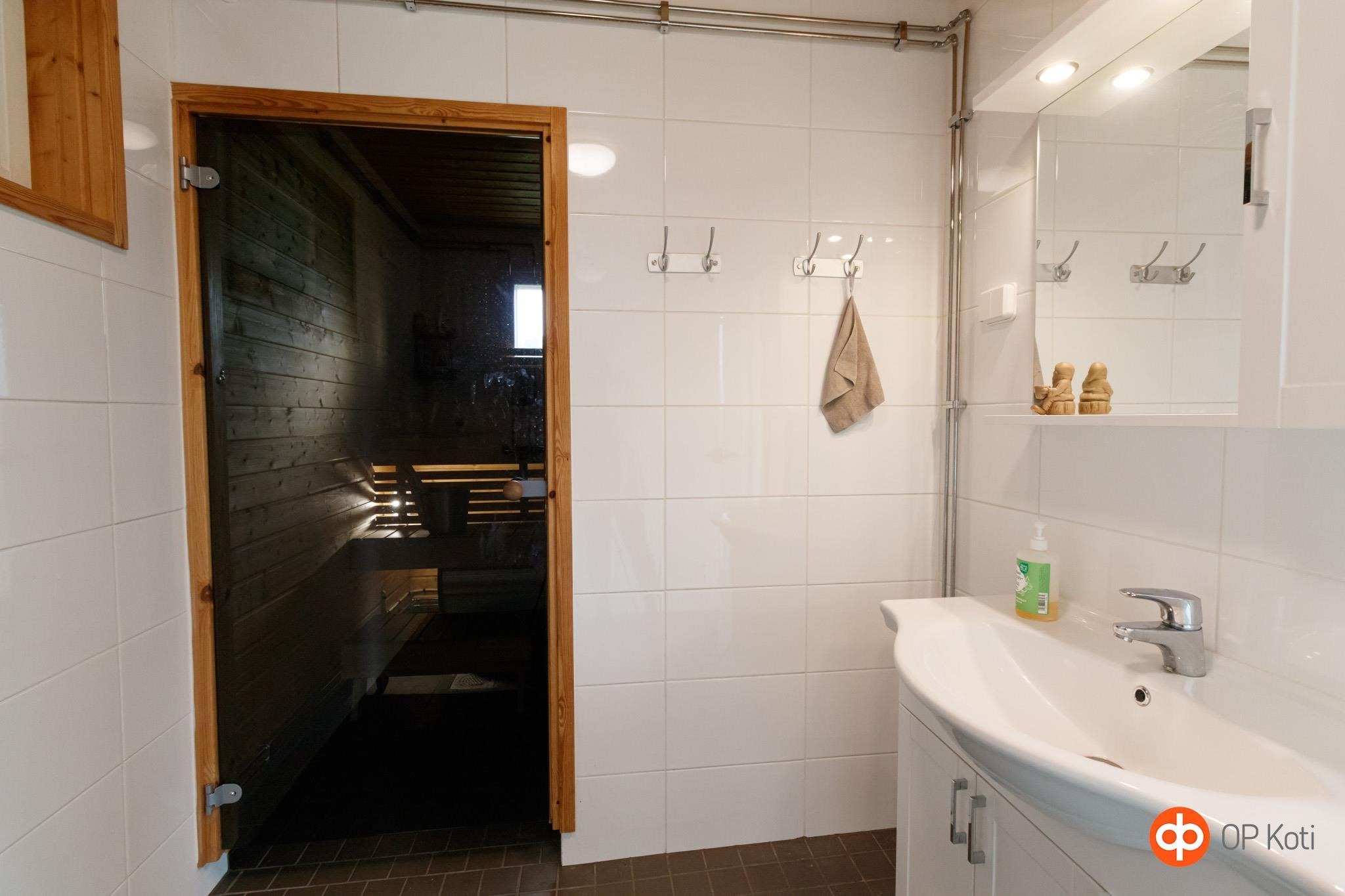 - Kylpyhuoneessa on suihkukaappi, suihku, peili- ja allaskaappi, pesukoneliitäntä sekä kiinteät valaisimet. Kaikissa tiloissa on lattialämmitys.