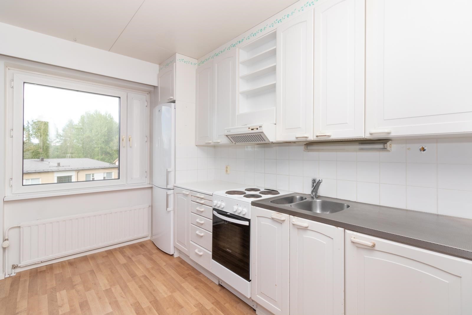 - Jääkaappipakastin, sähköliesi, liesituuletin, kaapistot, kiinteät valaisimet.