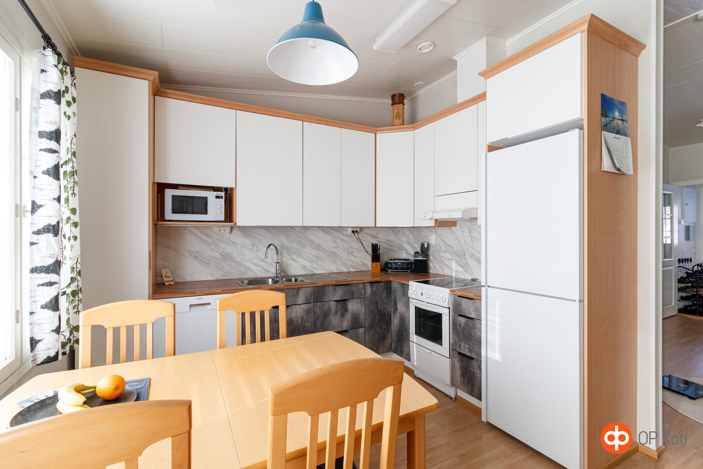 - Jääkaappipakastin, keraaminen liesi, liesituuletin, astianpesukone.