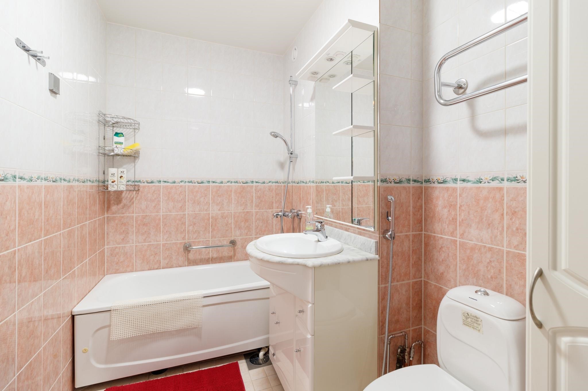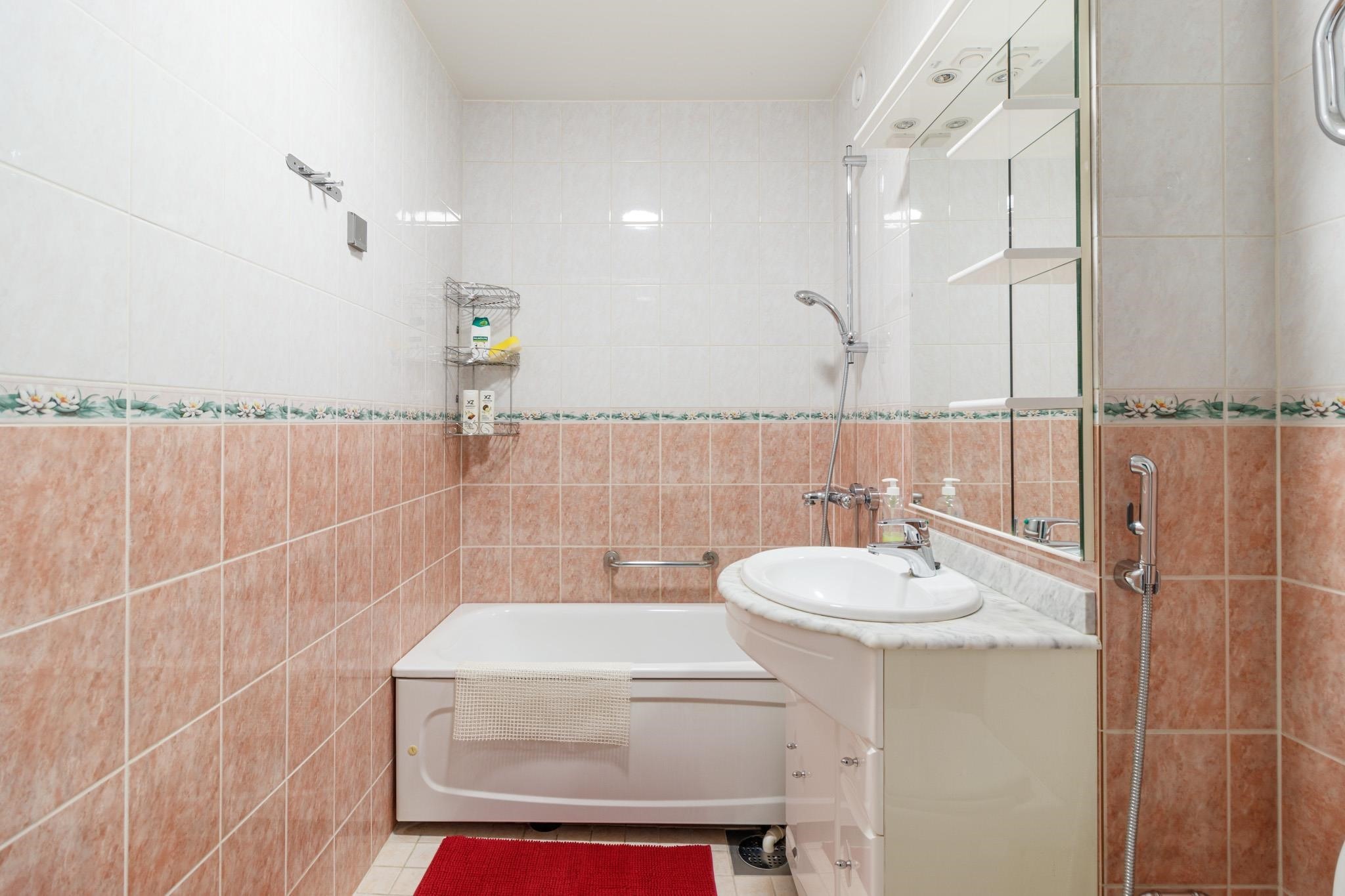 - Kylpyhuone, suihku, peilit, allaskaappi, pesukoneliitäntä, kiinteät valaisimet. Kuivauspatteri. Kuvissa näkyvä amme on poistettu.
