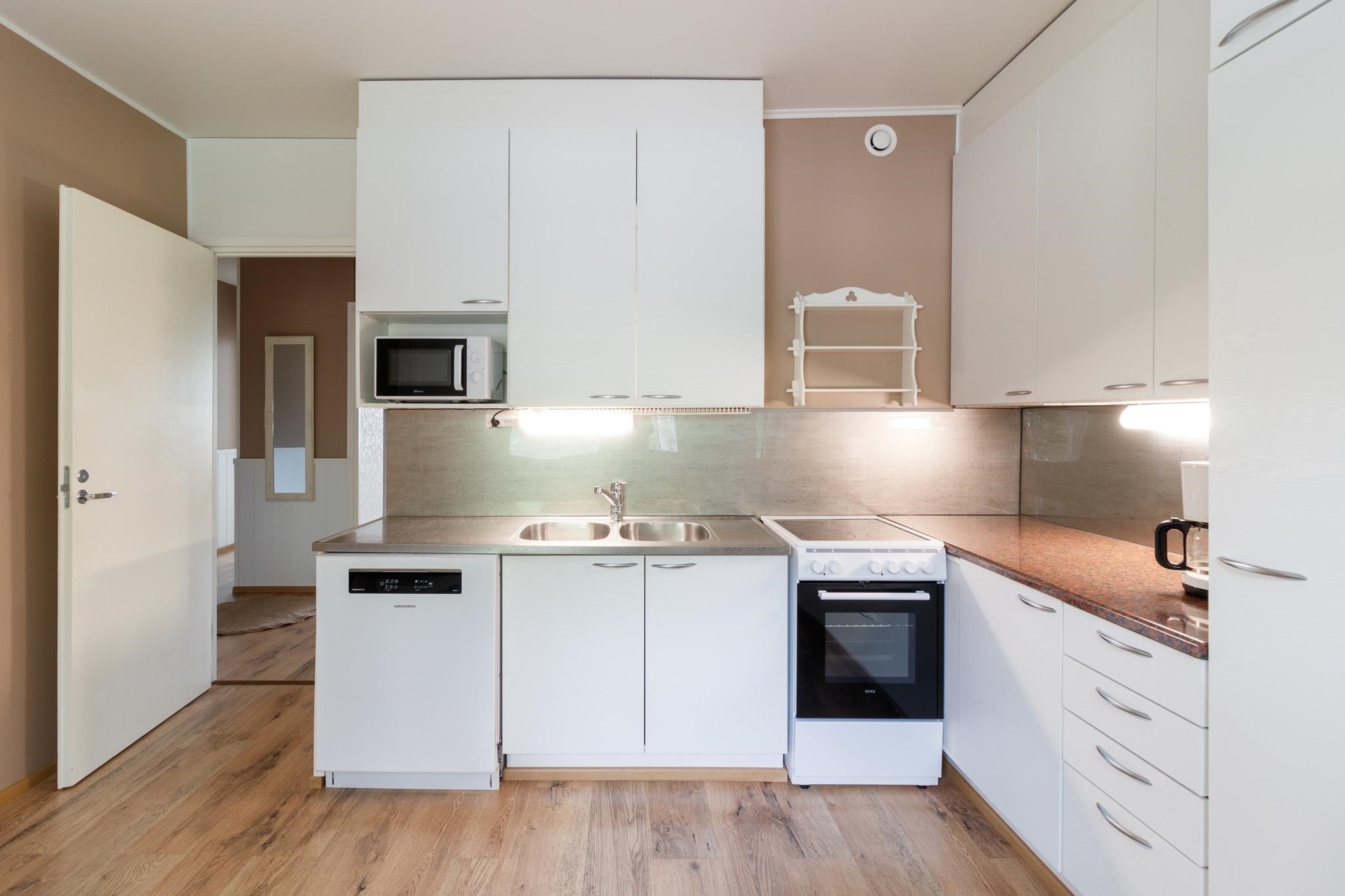 - Jääkaappi 105 cm korkea, sähköliesi, mikroaaltouuni, astianpesukone, kaapistot, kiinteät valaisimet.
