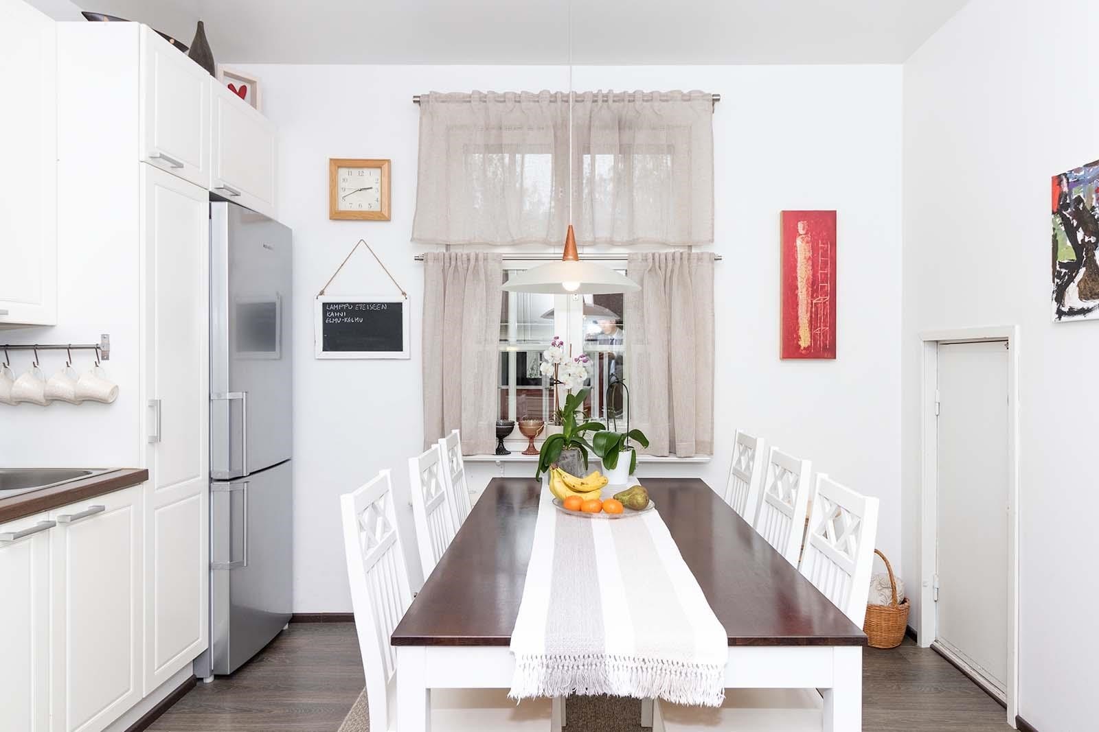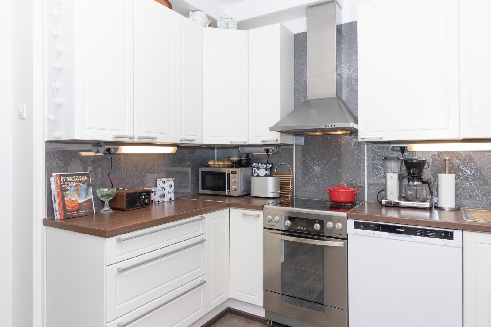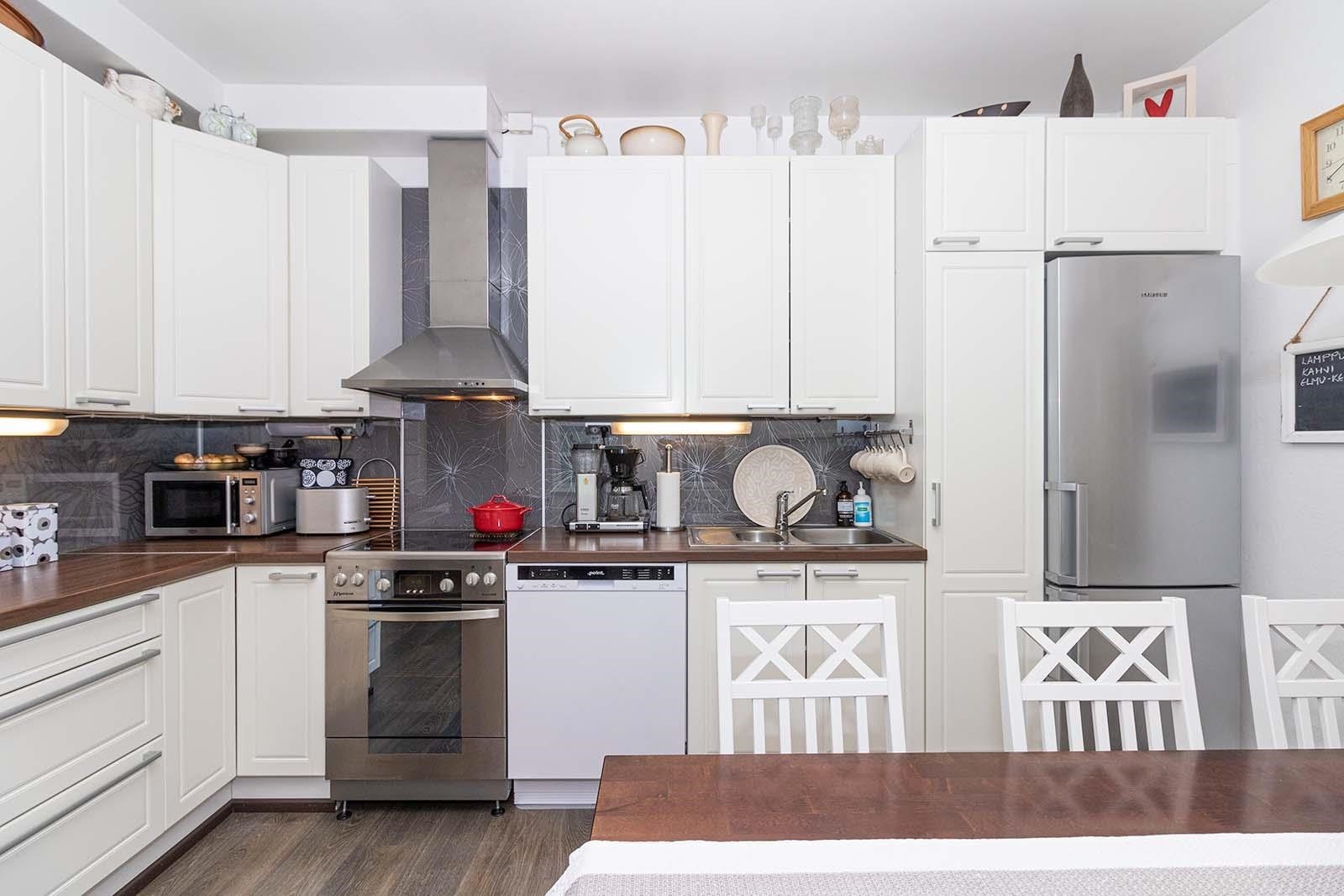 - Jääkaappipakastin, sähköliesi, liesituuletin, astianpesukone, kaapistot, kiinteät valaisimet.