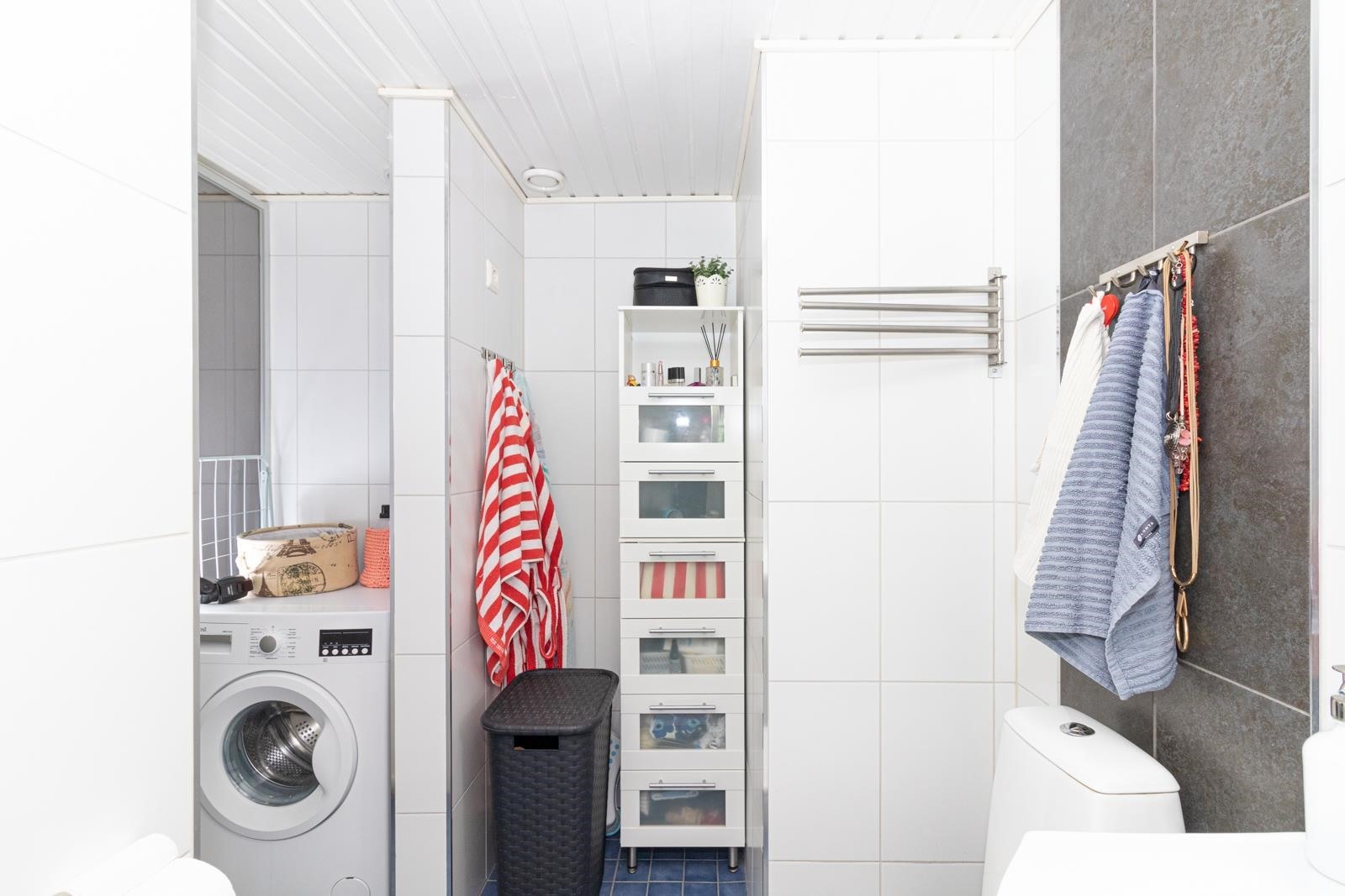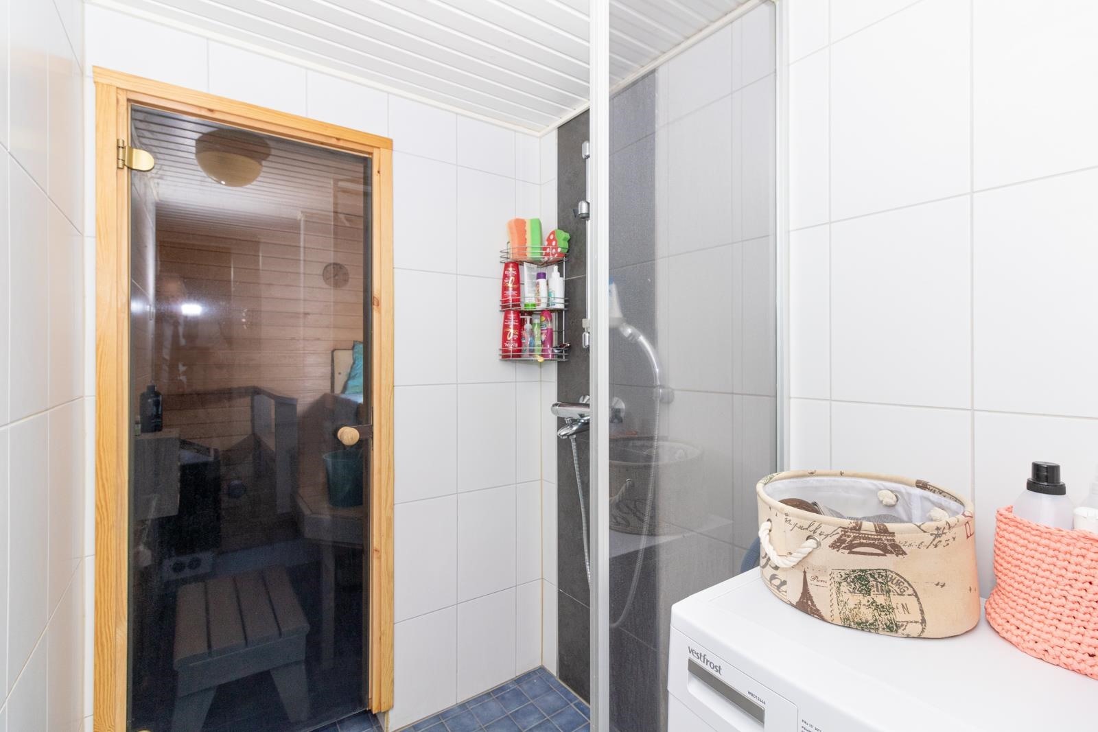 - Sauna, sähkökiuas, kylpyhuone, erillinen wc alakerrassa, suihkuseinä, peilikaappi, kaapit, allaskaappi, pesukoneliitäntä, lattialämmitys, kiinteät valaisimet.