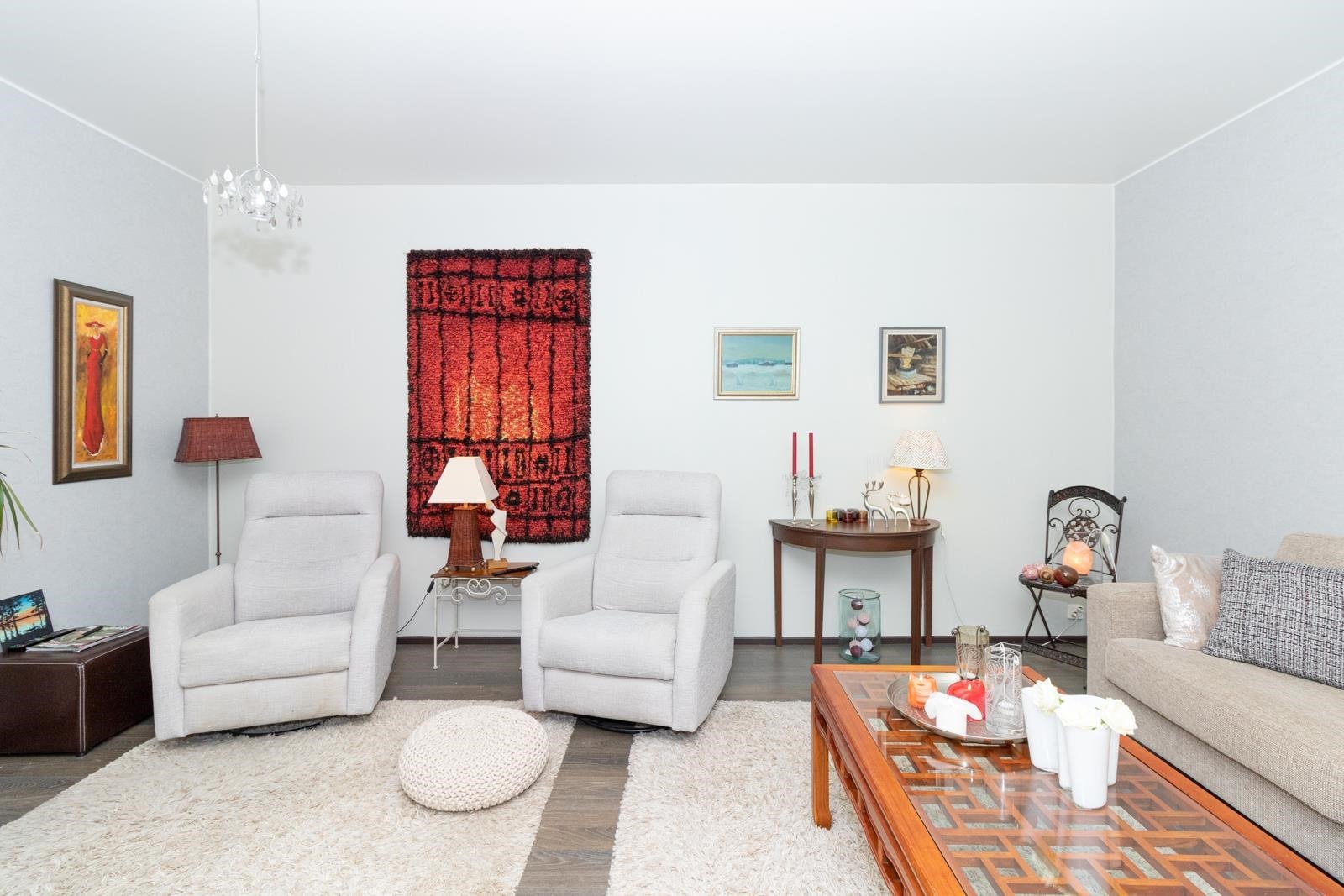 Keittiö: Maalatut seinät, laminaattilattia. Olohuone: Tapetoidut seinät, laminaattilattia. Makuuhuone 1: Tapetoidut seinät, laminaattilattia. Makuuhuone 2: Tapetoidut seinät, laminaattilattia. Sauna: Seinät paneloitu, lattia laatoitettu. Kylpyhuone: Seinät ja lattia laatoitettu. Eteinen: Seinät maalattu, laminaattilattia. Wc: Seinät tapetoitu, lattiassa muovimatto.