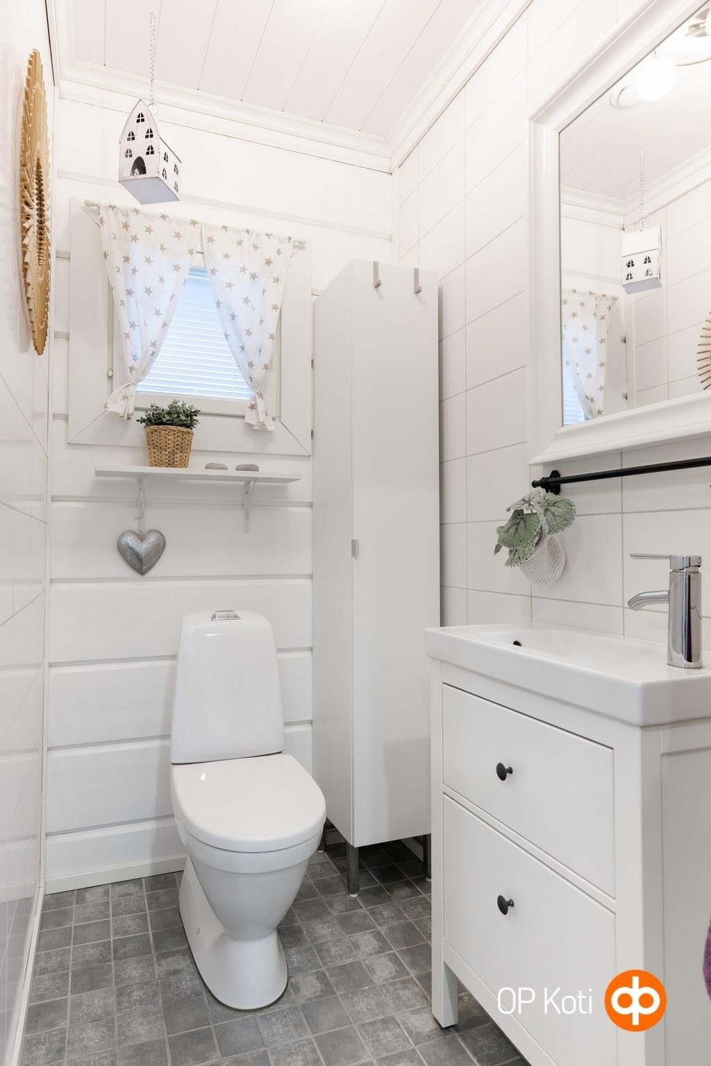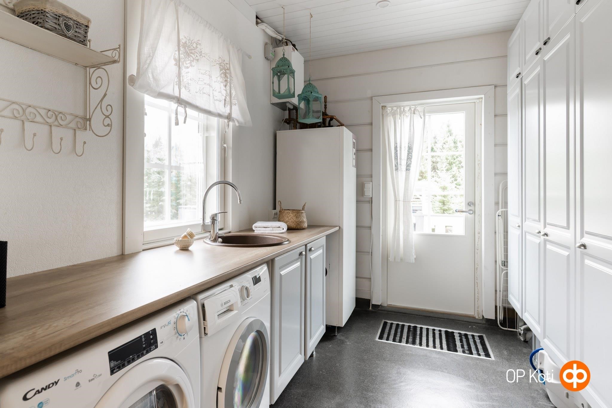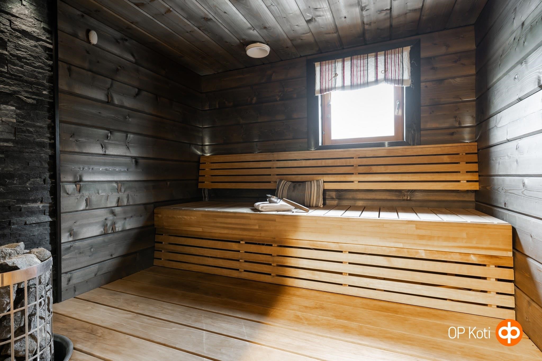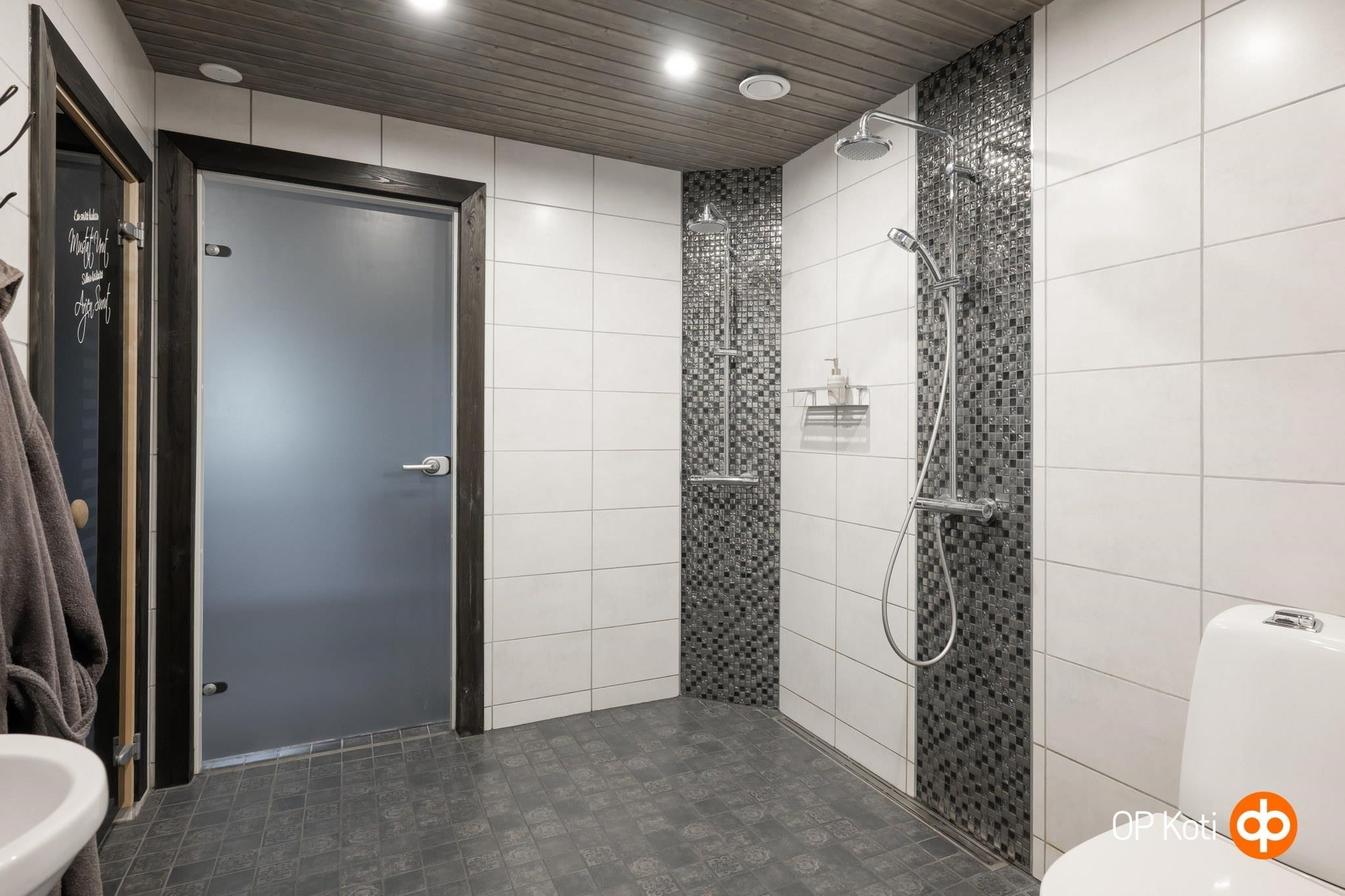 - Sauna, sähkökiuas, kylpyhuone, erillinen wc, suihku 2 kpl, peilikaappi, kaapit, allaskaappi, pesukoneliitäntä, lattialämmitys, kiinteät valaisimet.