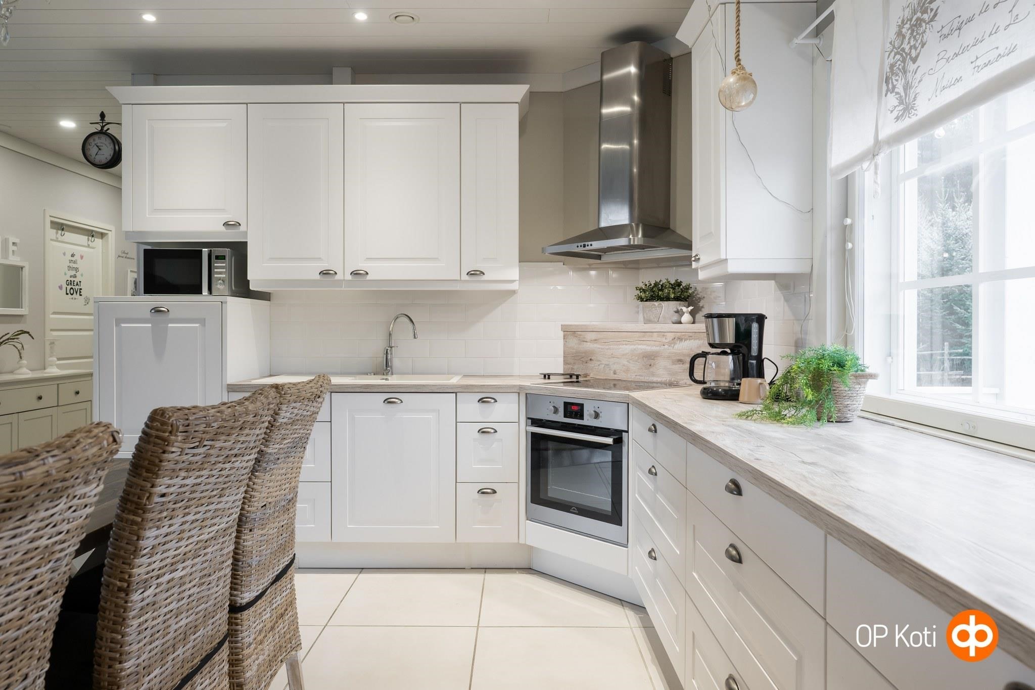 - Jääkaappi integroitu, pakastekaappi integroitu, erillisuuni, liesitaso, astianpesukone integroitu, kaapistot, kiinteät valaisimet.