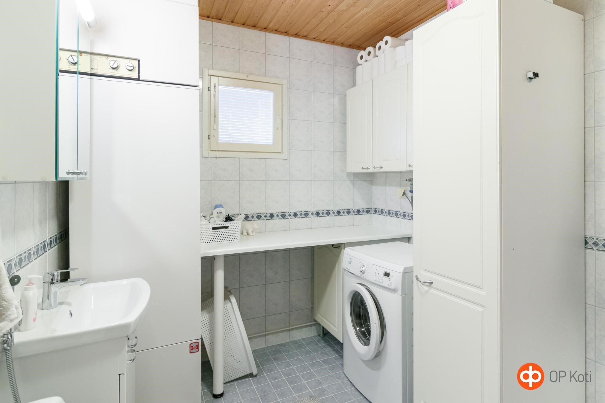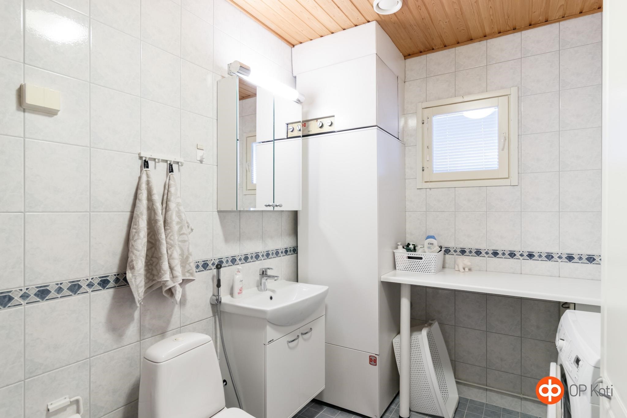 - Sauna, sähkökiuas, kylpyhuone, suihku sekottaja uusittu, suihkuseinä, peilikaappi, kaapit, allaskaappi, pesukoneliitäntä, lattialämmitys, kiinteät valaisimet.