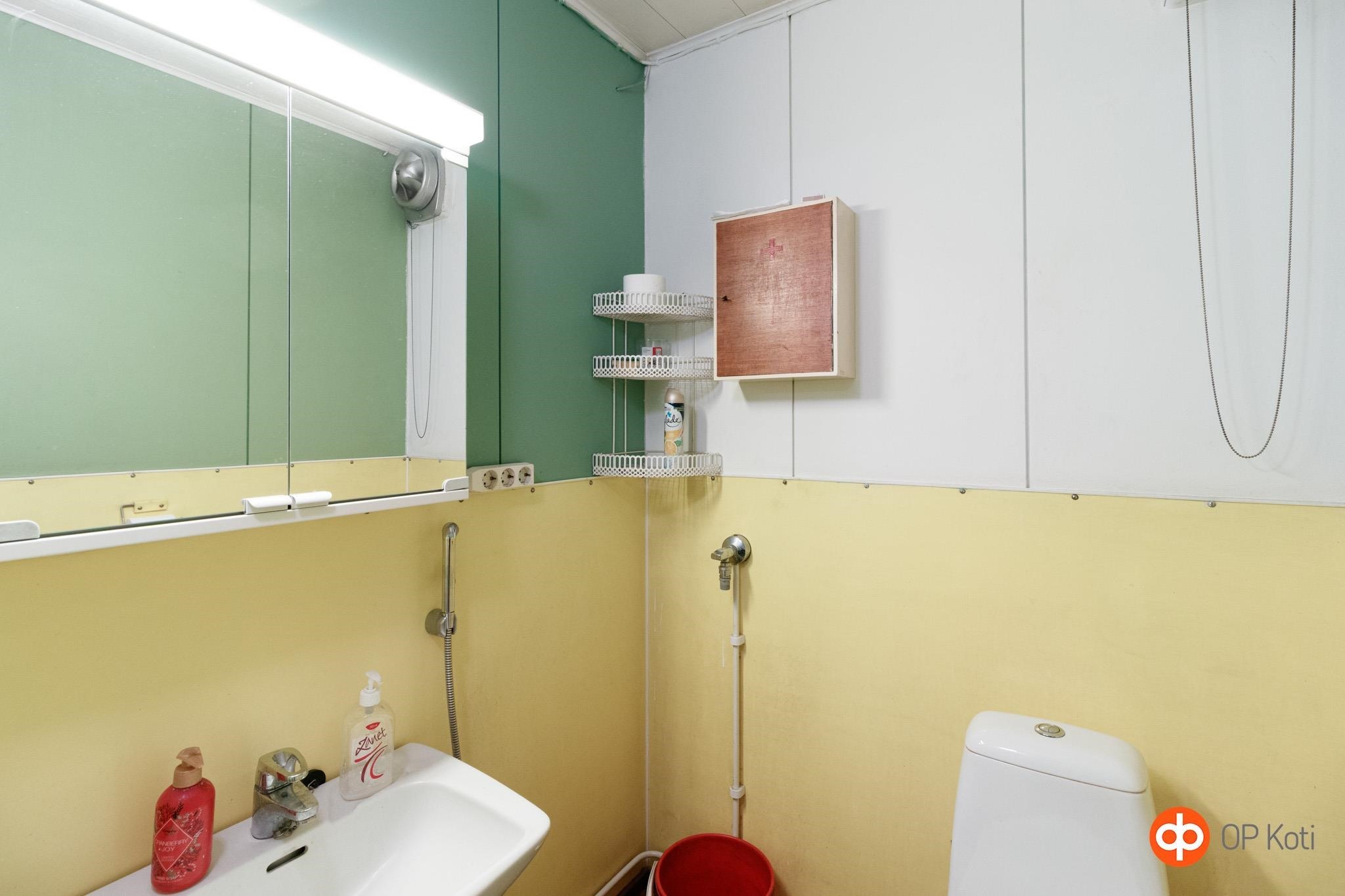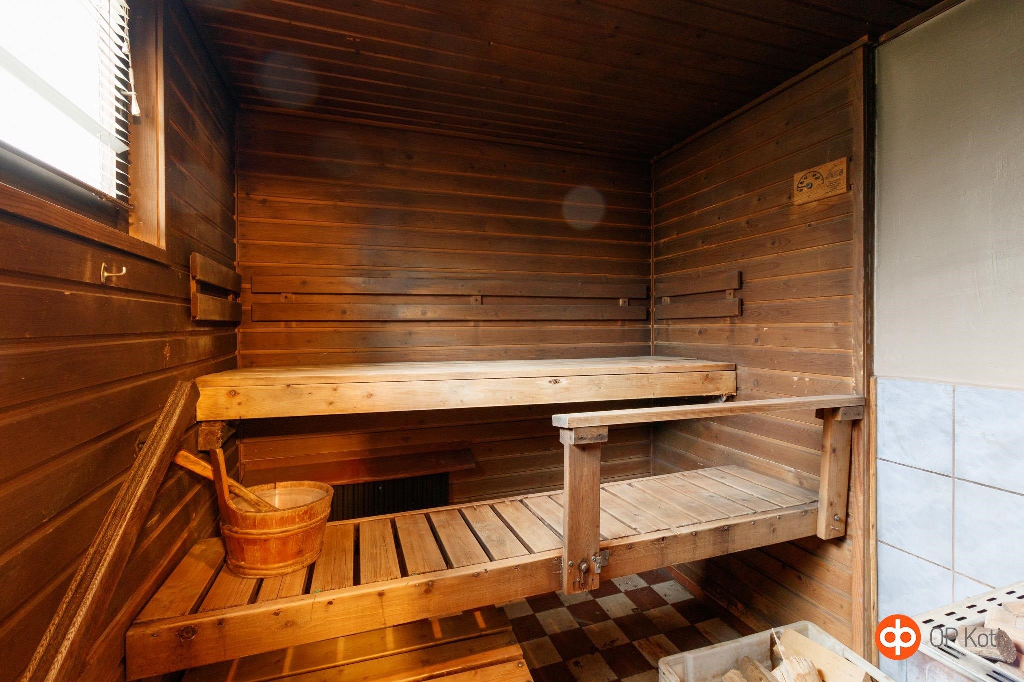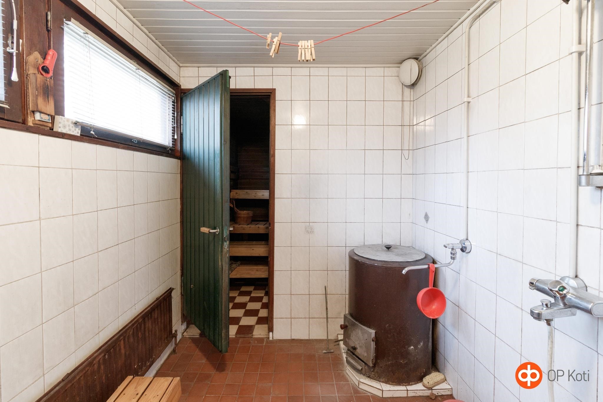- Sauna, puukiuas, kylpyhuone, suihku, peilikaappi, allaskaappi, pesukoneliitäntä. Muuripata