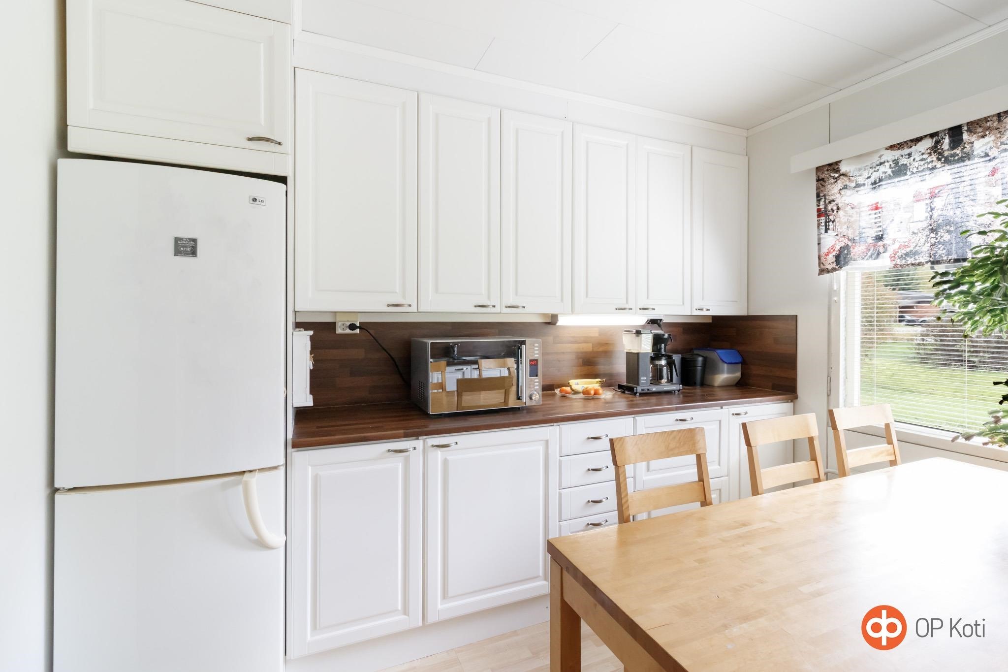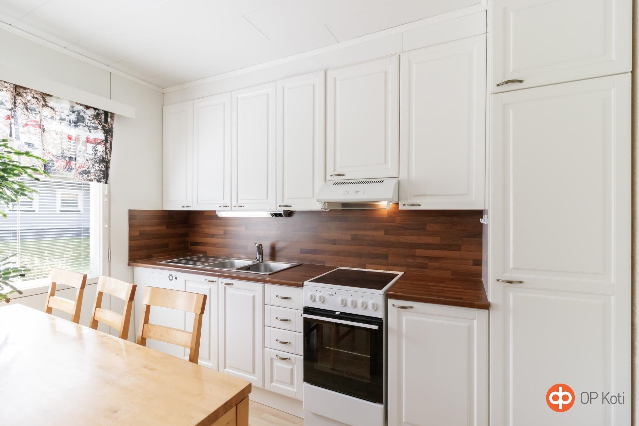 - Jääkaappipakastin, keraaminen liesi, liesituuletin, astianpesukone, kaapistot, kiinteät valaisimet.