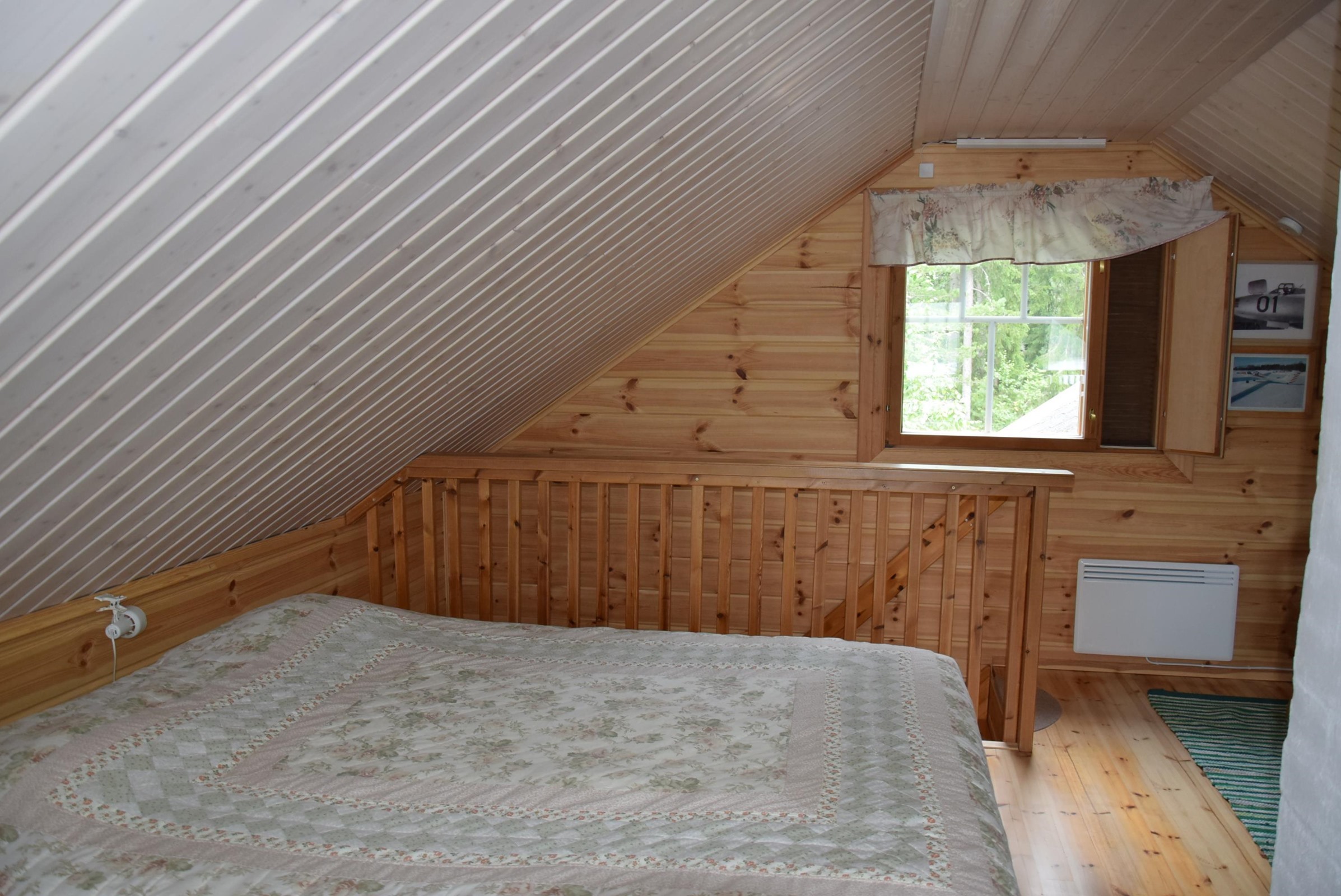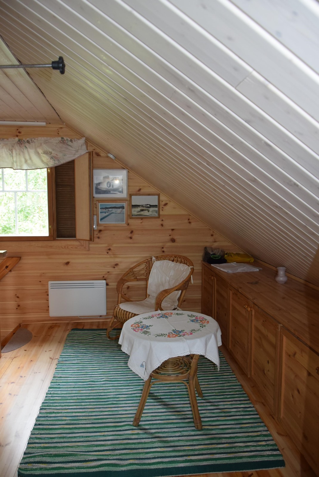 Keittiö: vinyylilattia, seinät paneloitu. Olohuone: vinyylilattia, seinät paneloitu. Makuuhuone 1: vinyylilattia, seinät paneloitu. Sauna: lattia laatoitettu, seinät paneloitu. Kylpyhuone: lattia ja seinät laatoitettu. Eteinen: vinyylilattia, seinät paneloitu. Wc: lattia ja seinät laatoitettu. Yläkerran makuutila: vinyylilattia, seinät paneloitu. Kuisti: lautalattia, seinät paneloitu.