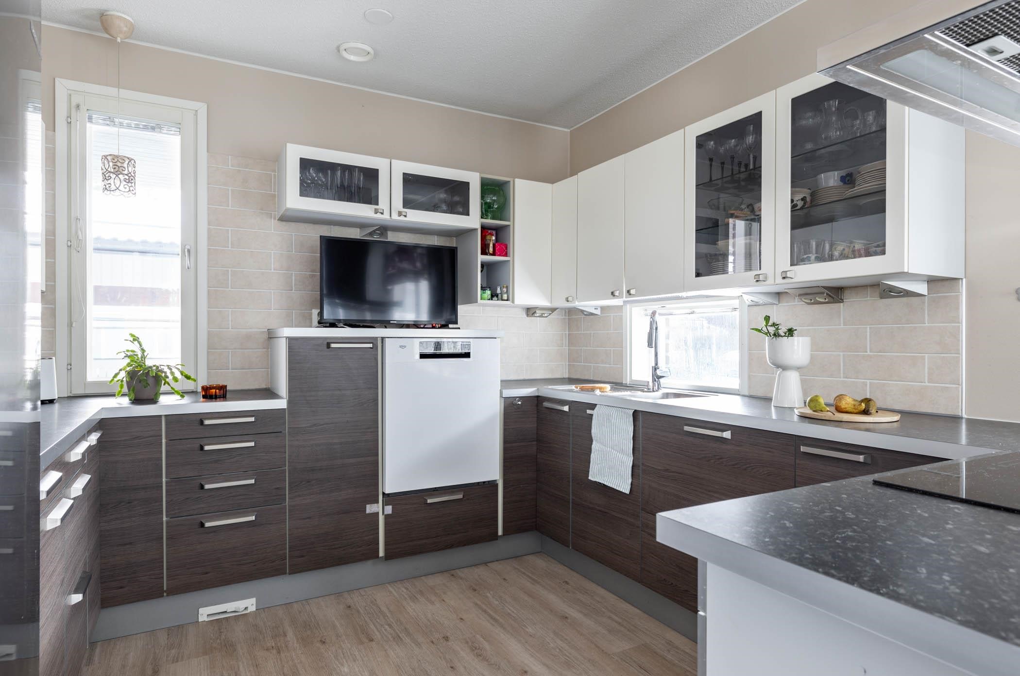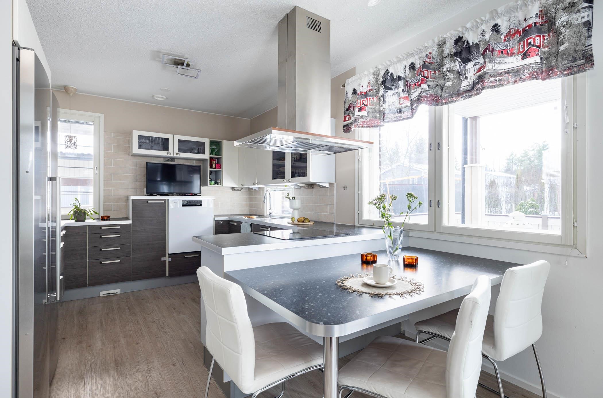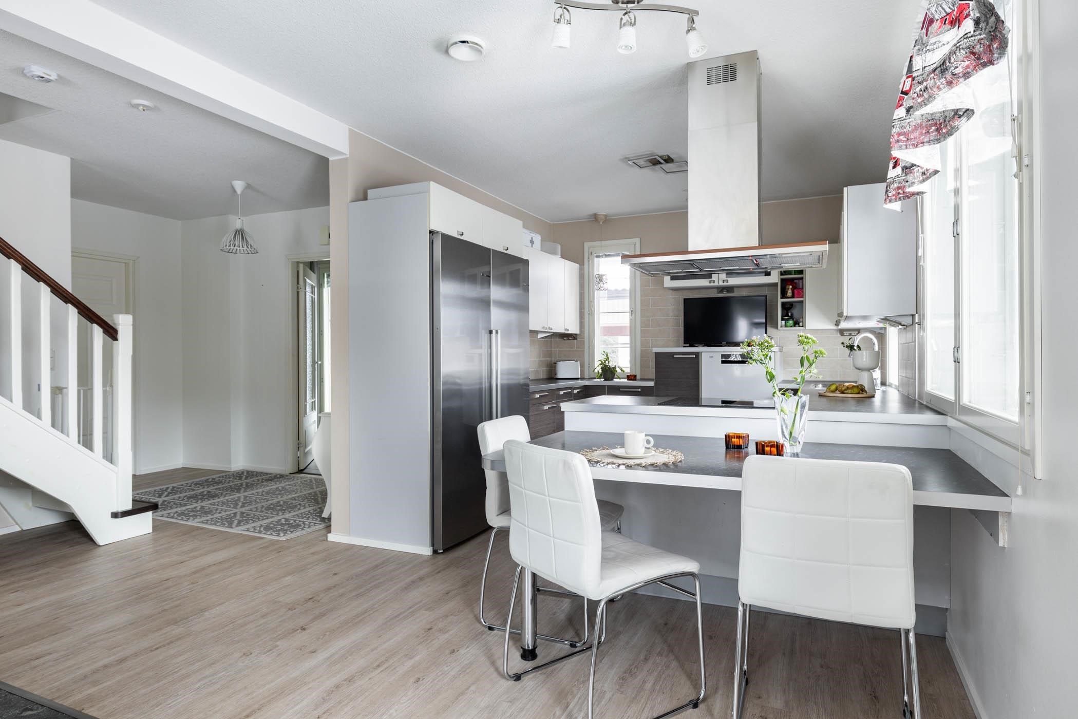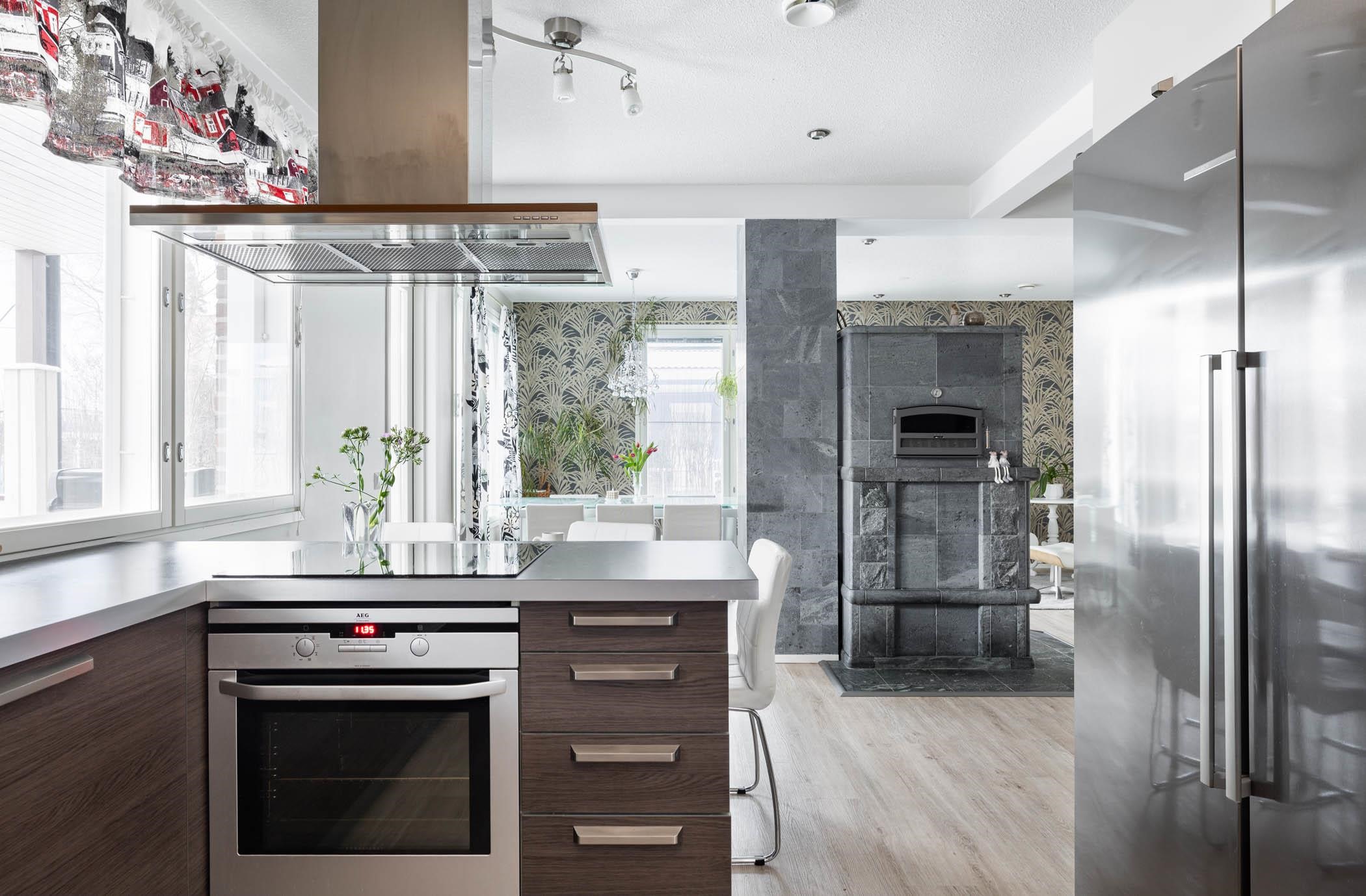 - Keittiö ja olohuone muodostavat kodikkaan ja avaran kokonaisuuden yhdessäoloon. Laadukkaan Puustelli -keittiön varusteisiin kuuluvat UPO:n tasoon nostettu astianpesukone, Lapetekin liesituuletin sekä Boschin korkea jääkaappi (2022), Boschin korkea pakastin (2022), AEG:n erillisuuni ja Whirlpoolin induktioliesitaso (2022). Keittiössä on hyvin työskentely- ja säilytystilaa.