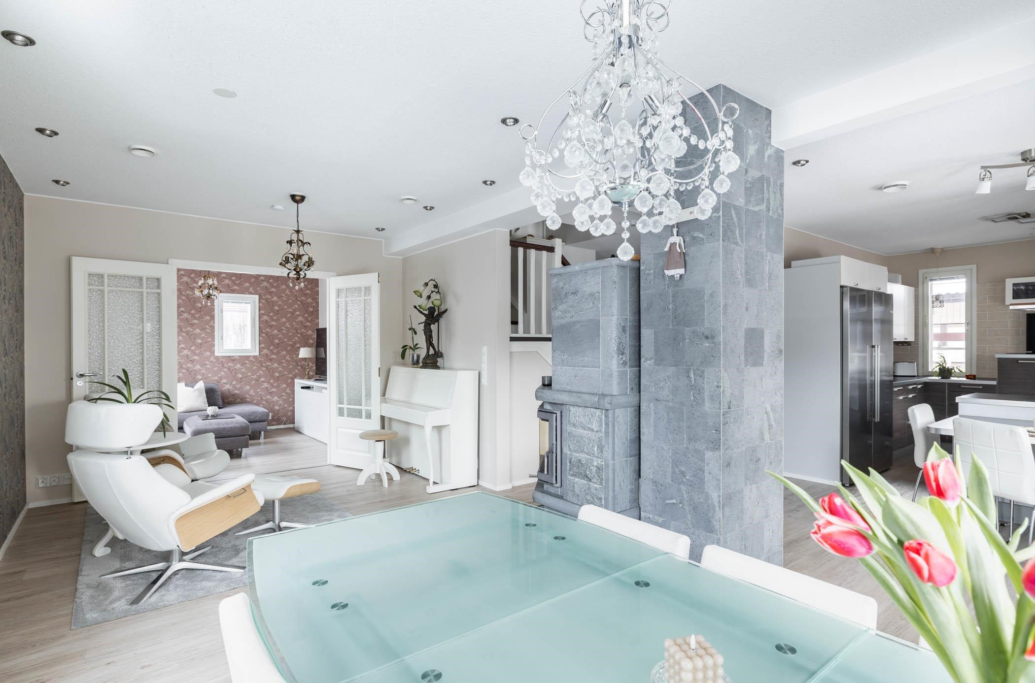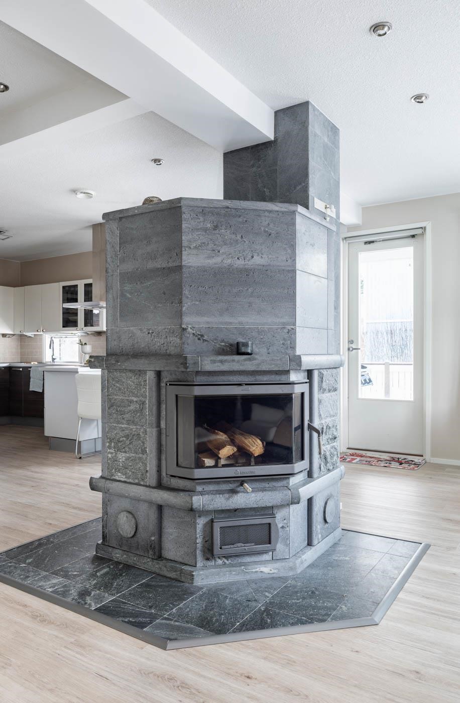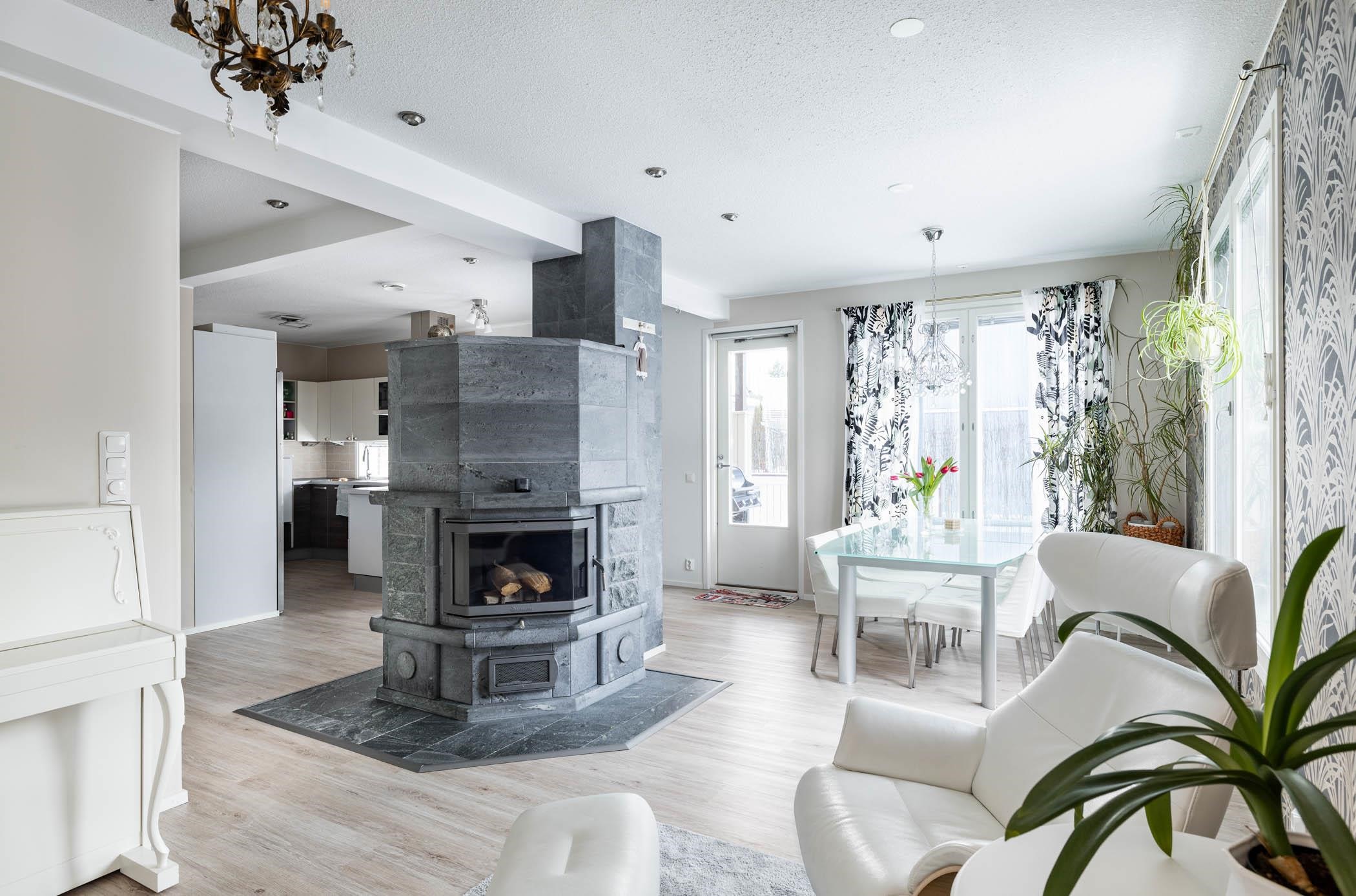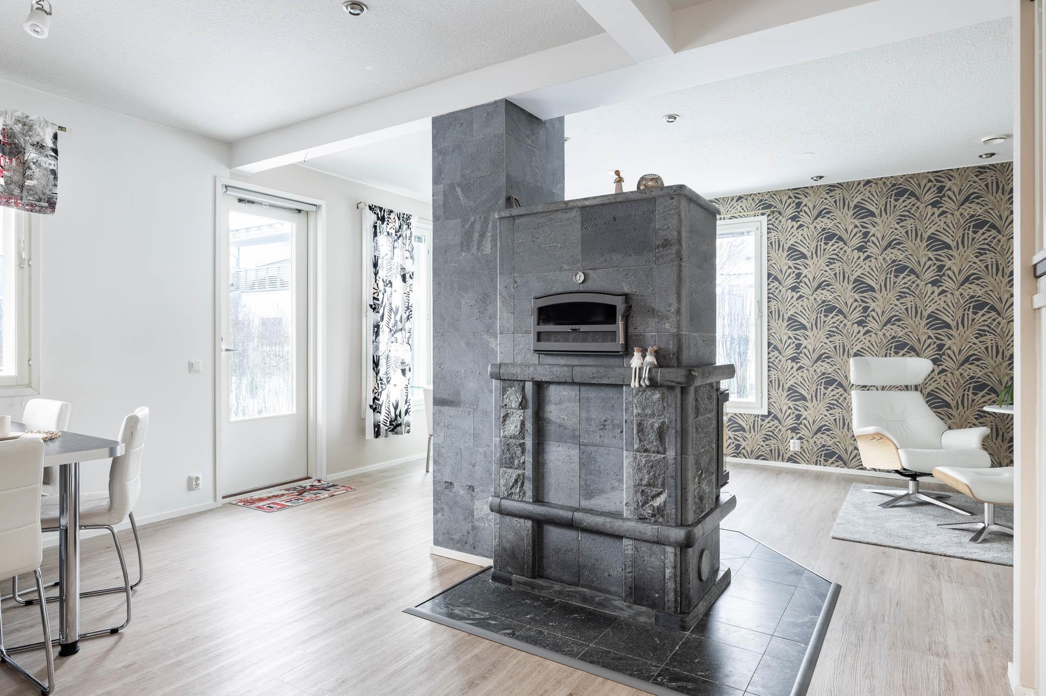 Käytännöllinen keittiö ja valoisa olohuone muodostavat kodinsydämen kotoisaan yhdessäoloon. Olohuoneen sydämessä varaava takka-leivinuuni tuo lämpöä ja tunnelmaa, ja olohuoneesta avautuu kulku ihanalle länsiterassille.