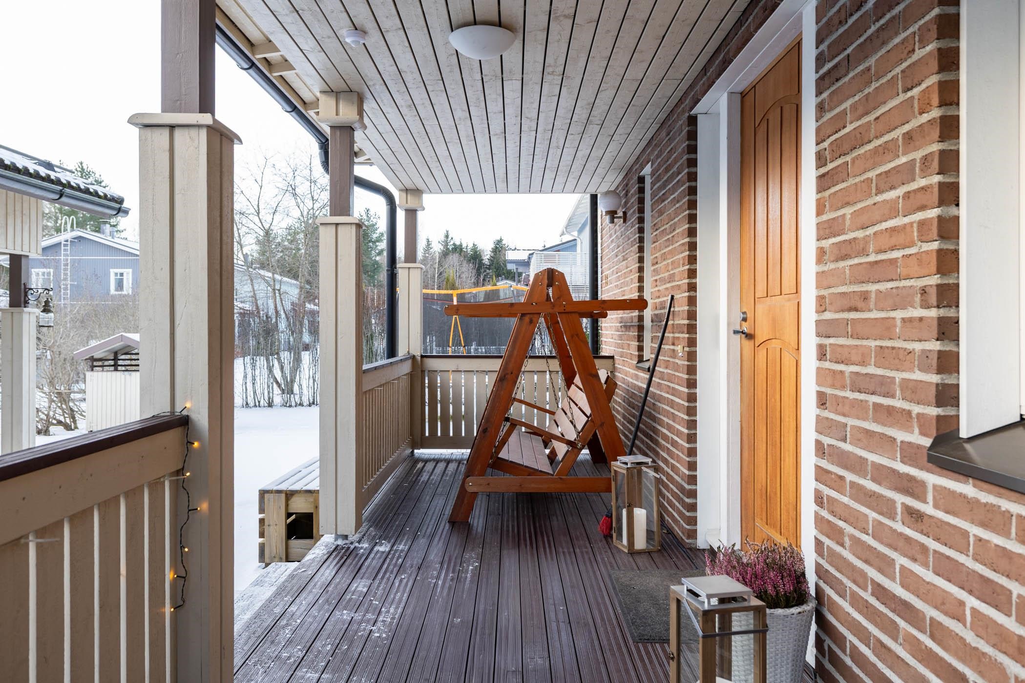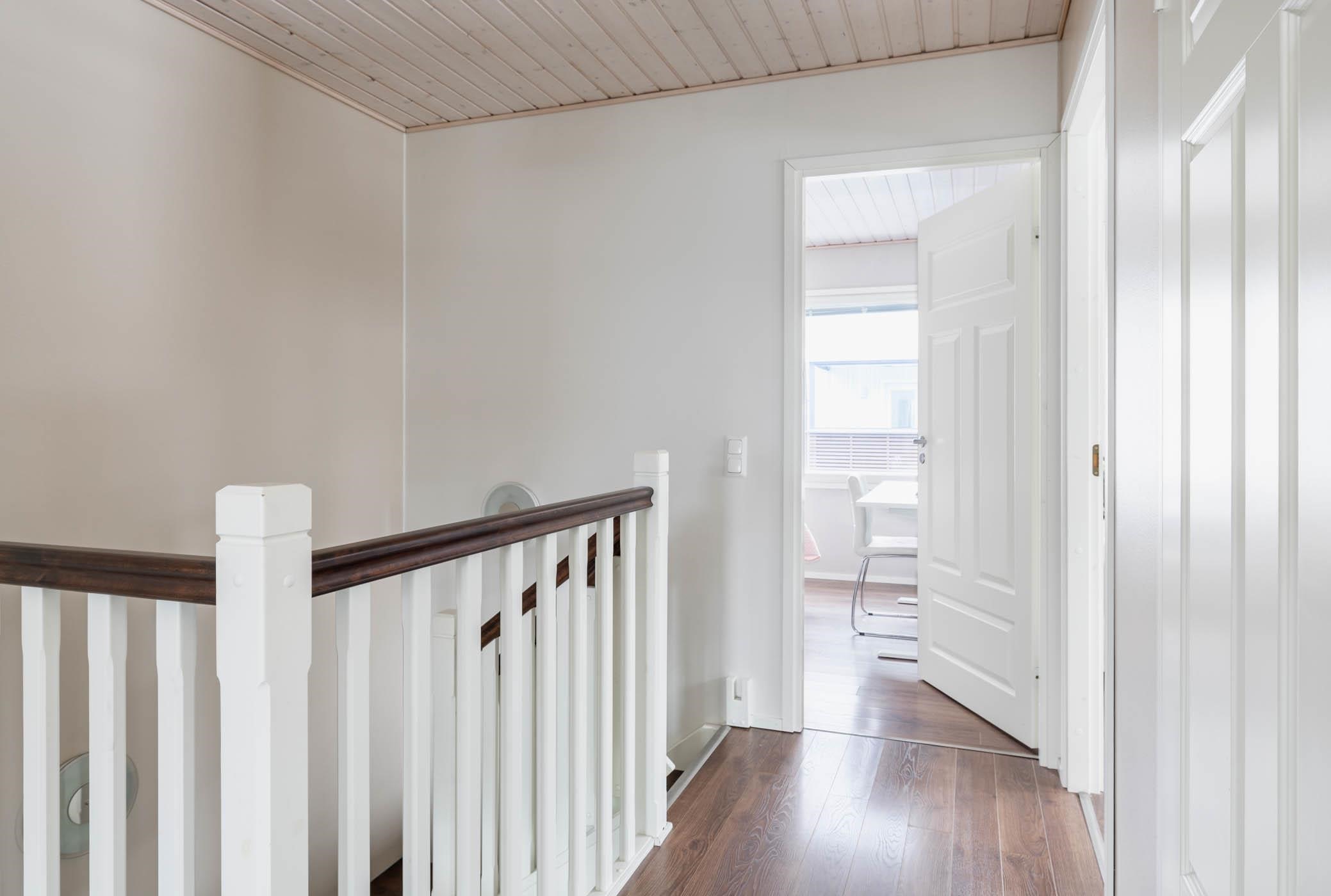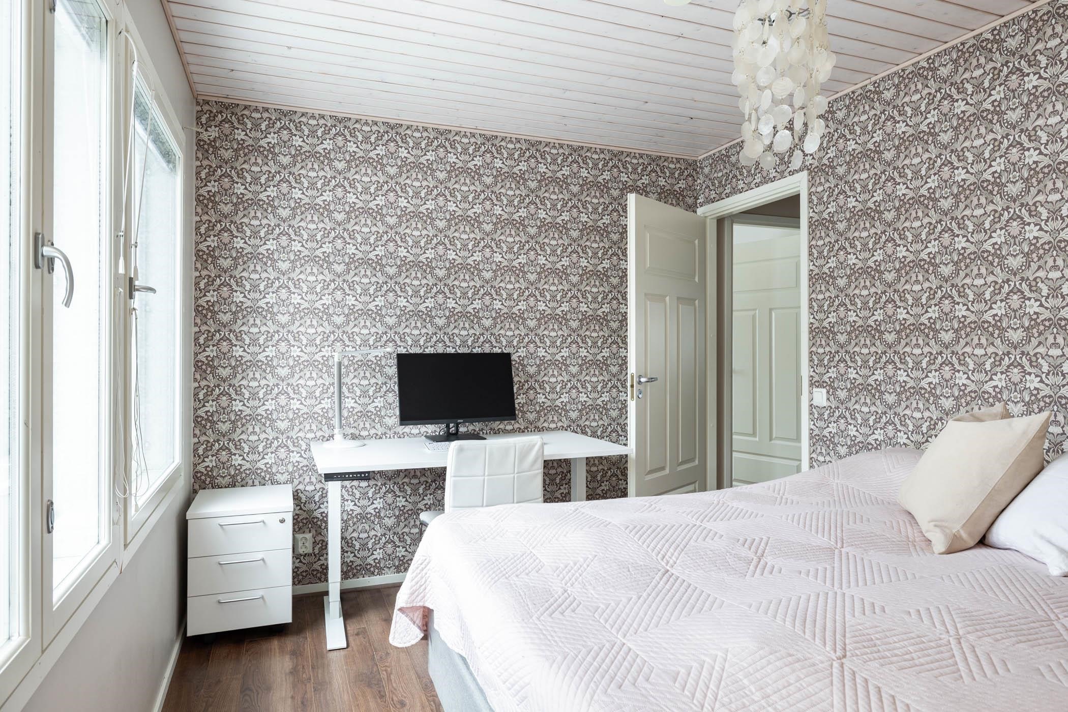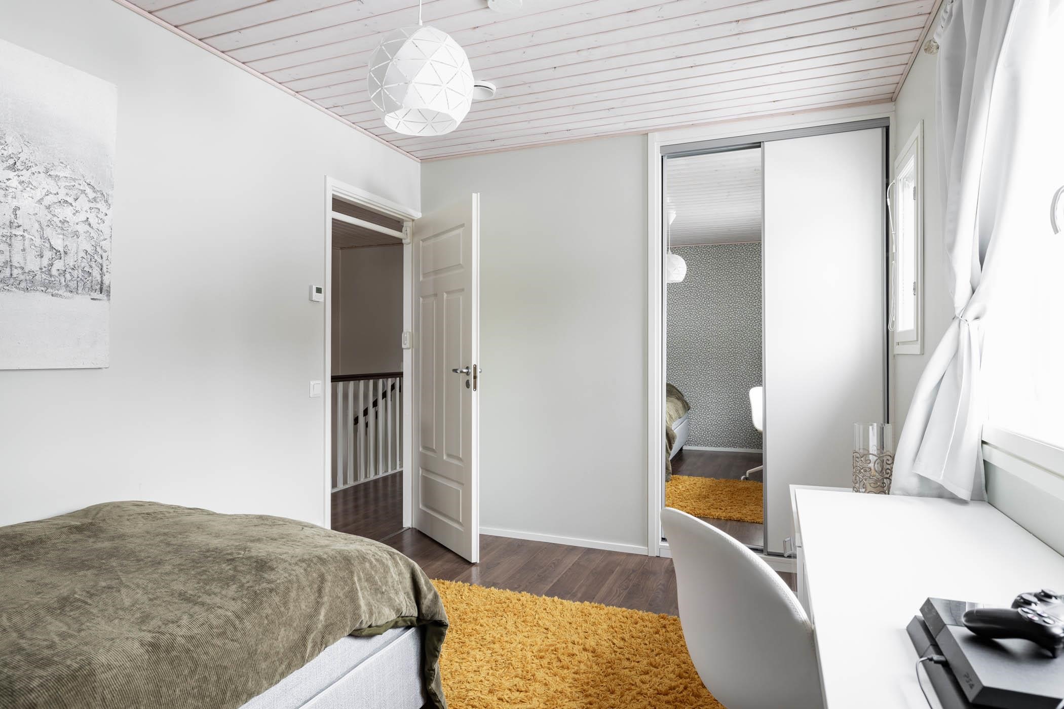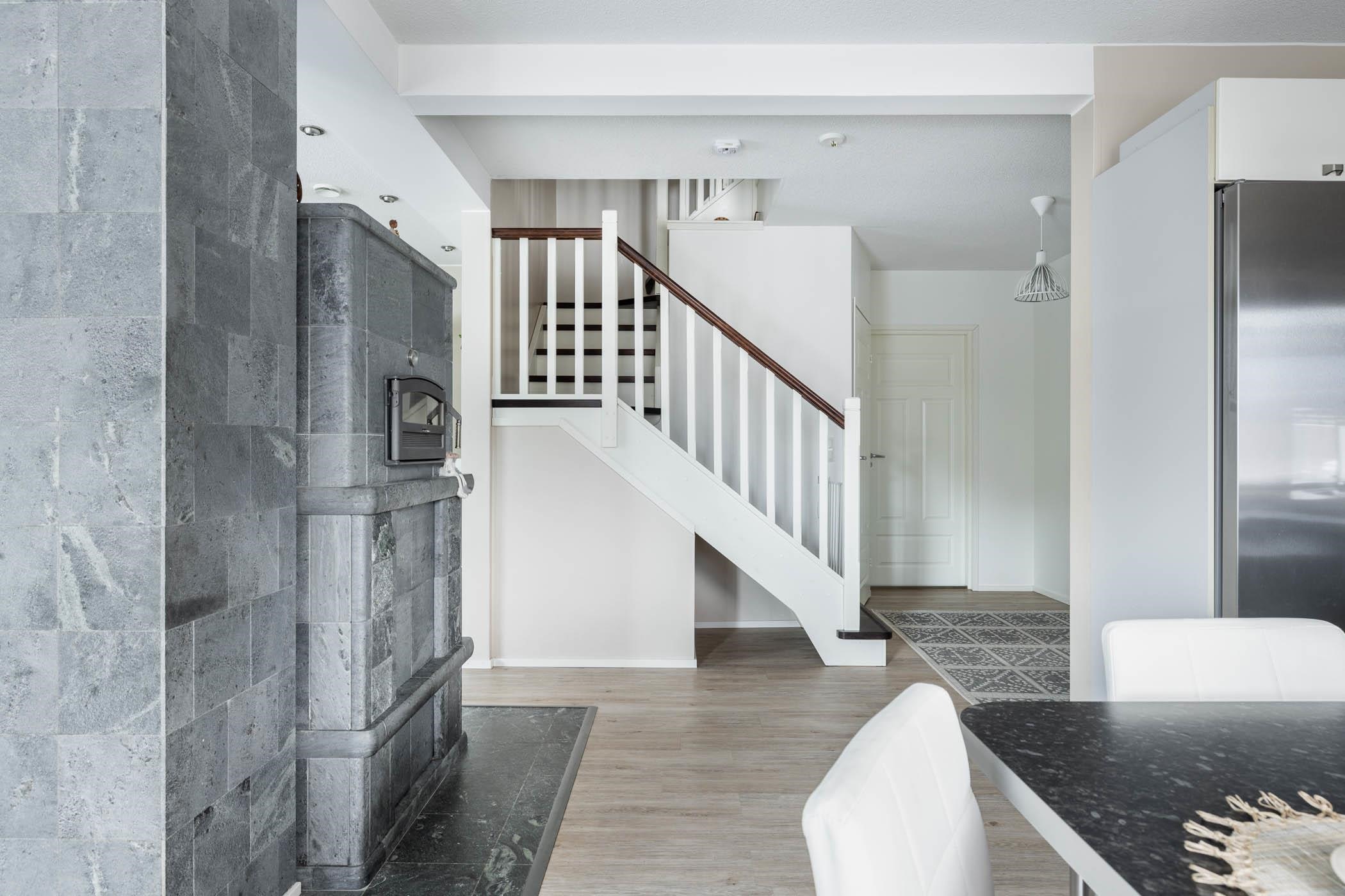 Tilaa riittää: olohuoneen lisäksi viisi huonetta, toimivat kodinhoitotilat ja runsaasti säilytystilaa. Molemmissa kerroksissa omat kylpyhuoneet, ja yläkerrassa sauna rentoutumiseen.