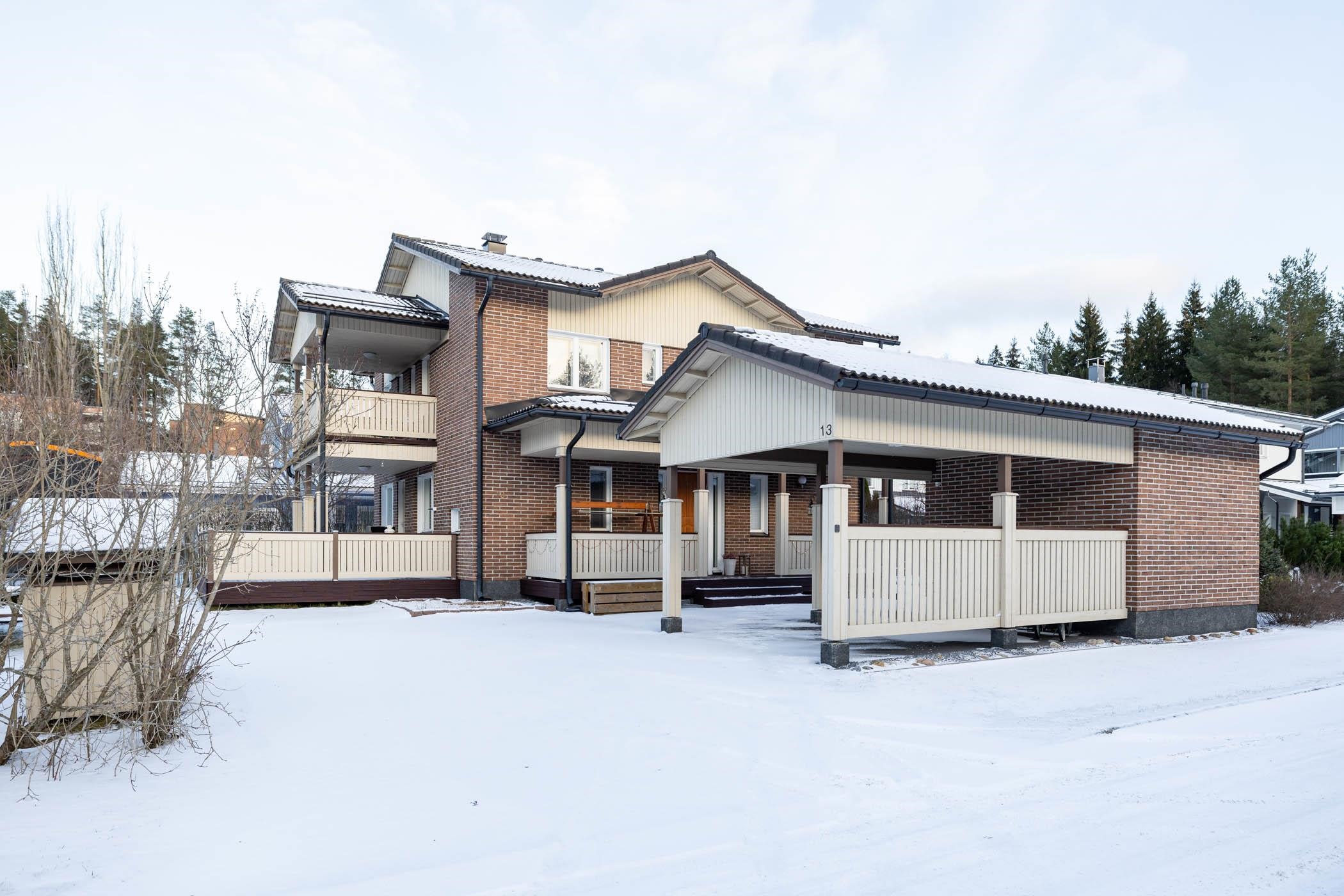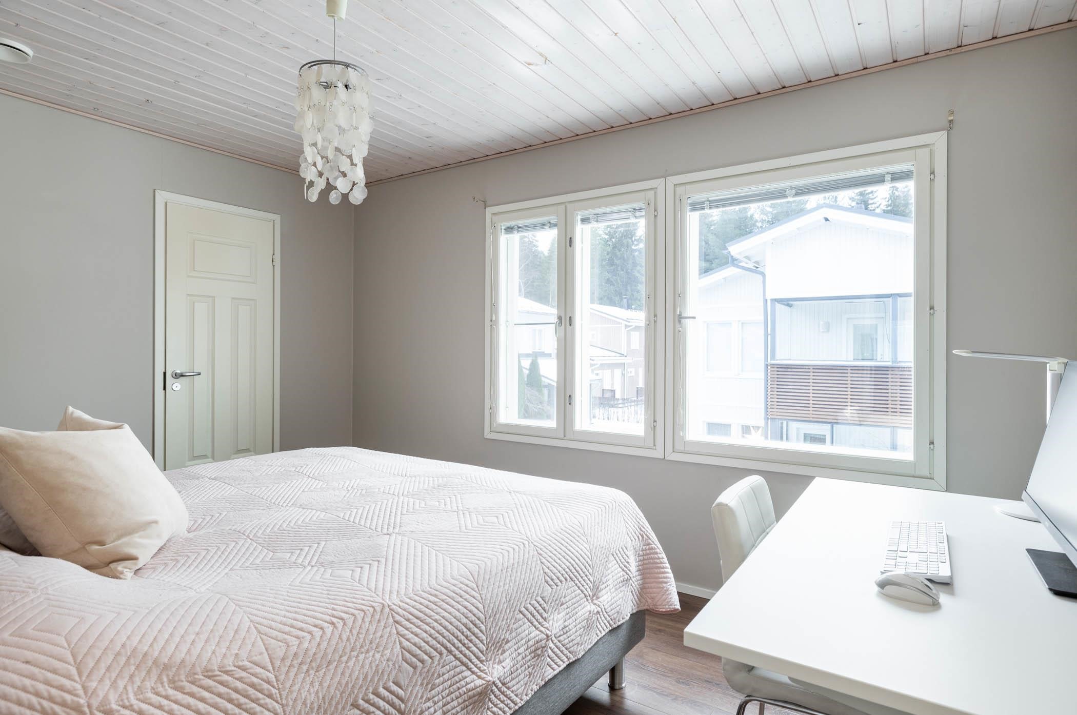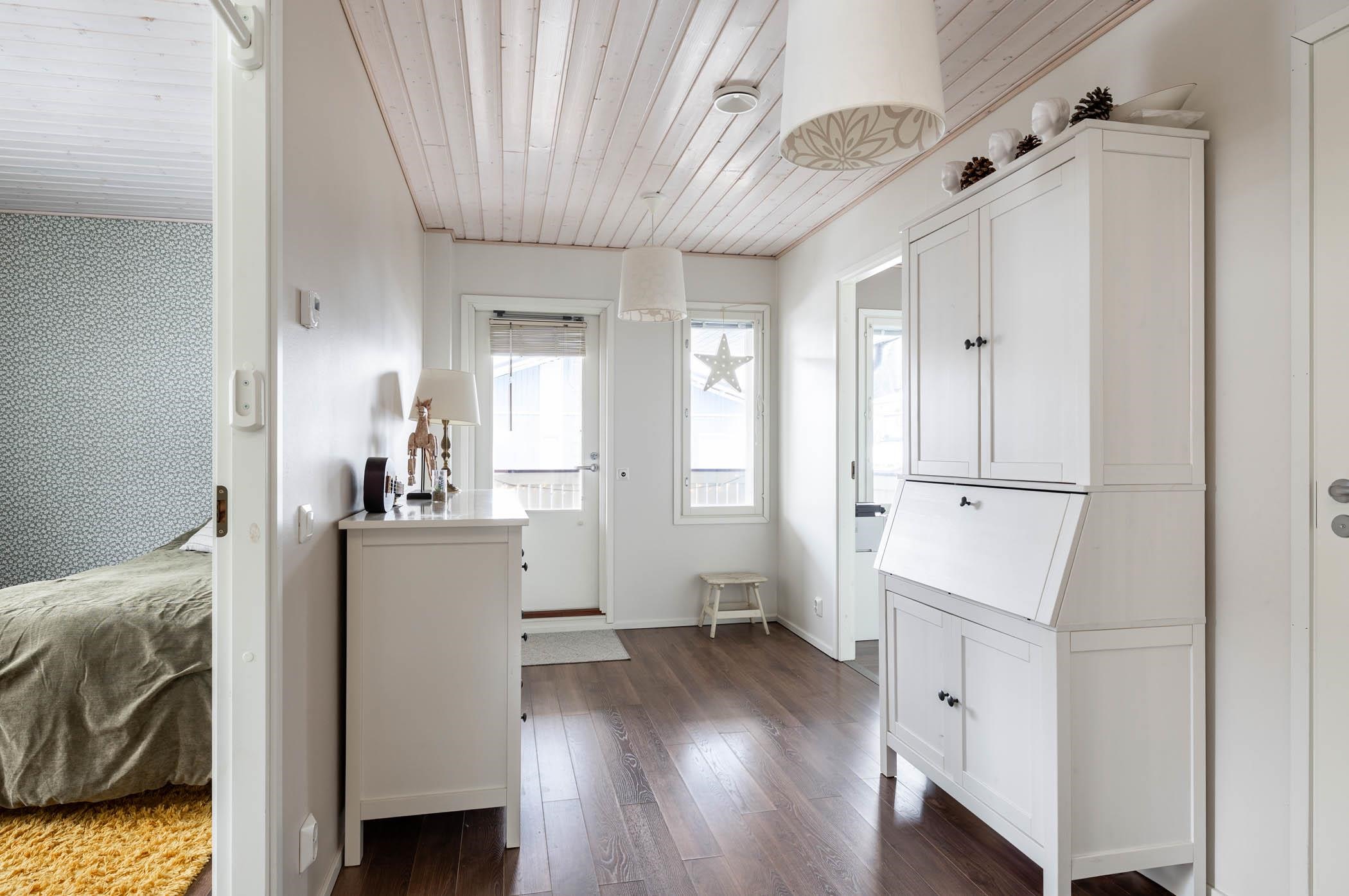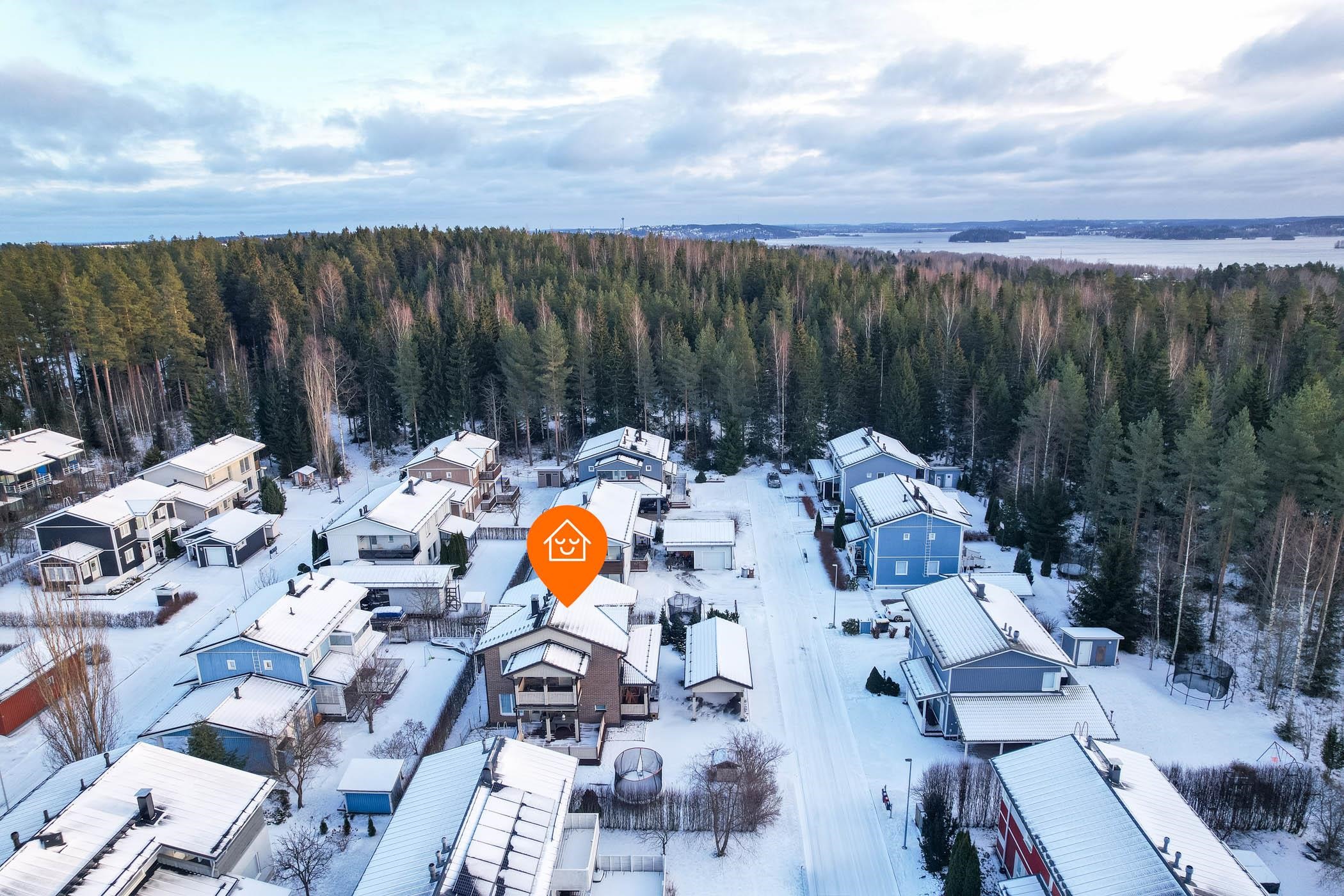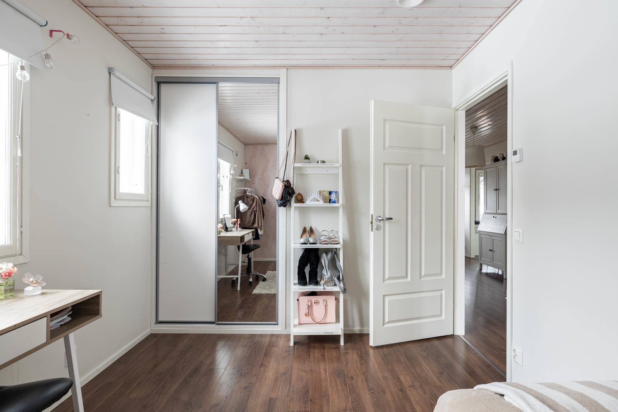 Tilaa riittää: olohuoneen lisäksi viisi huonetta, toimivat kodinhoitotilat ja runsaasti säilytystilaa. Molemmissa kerroksissa omat kylpyhuoneet, ja yläkerrassa sauna rentoutumiseen.