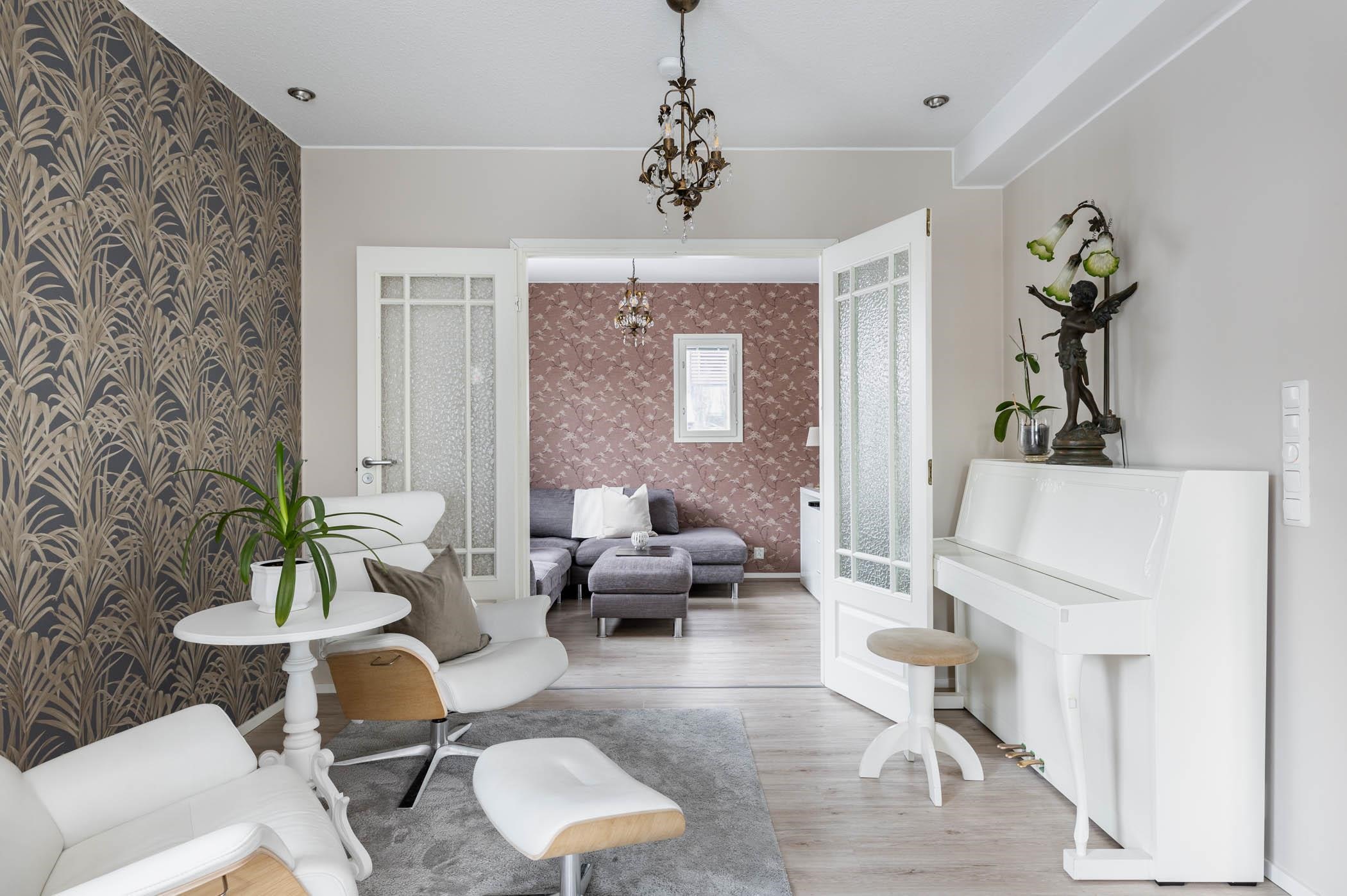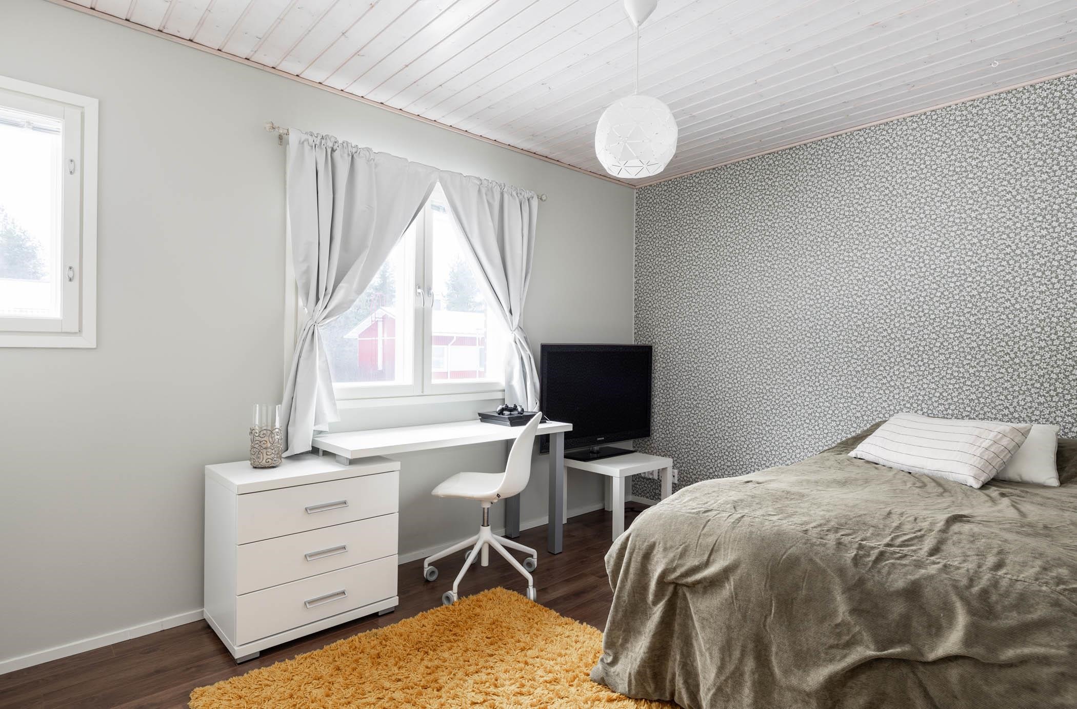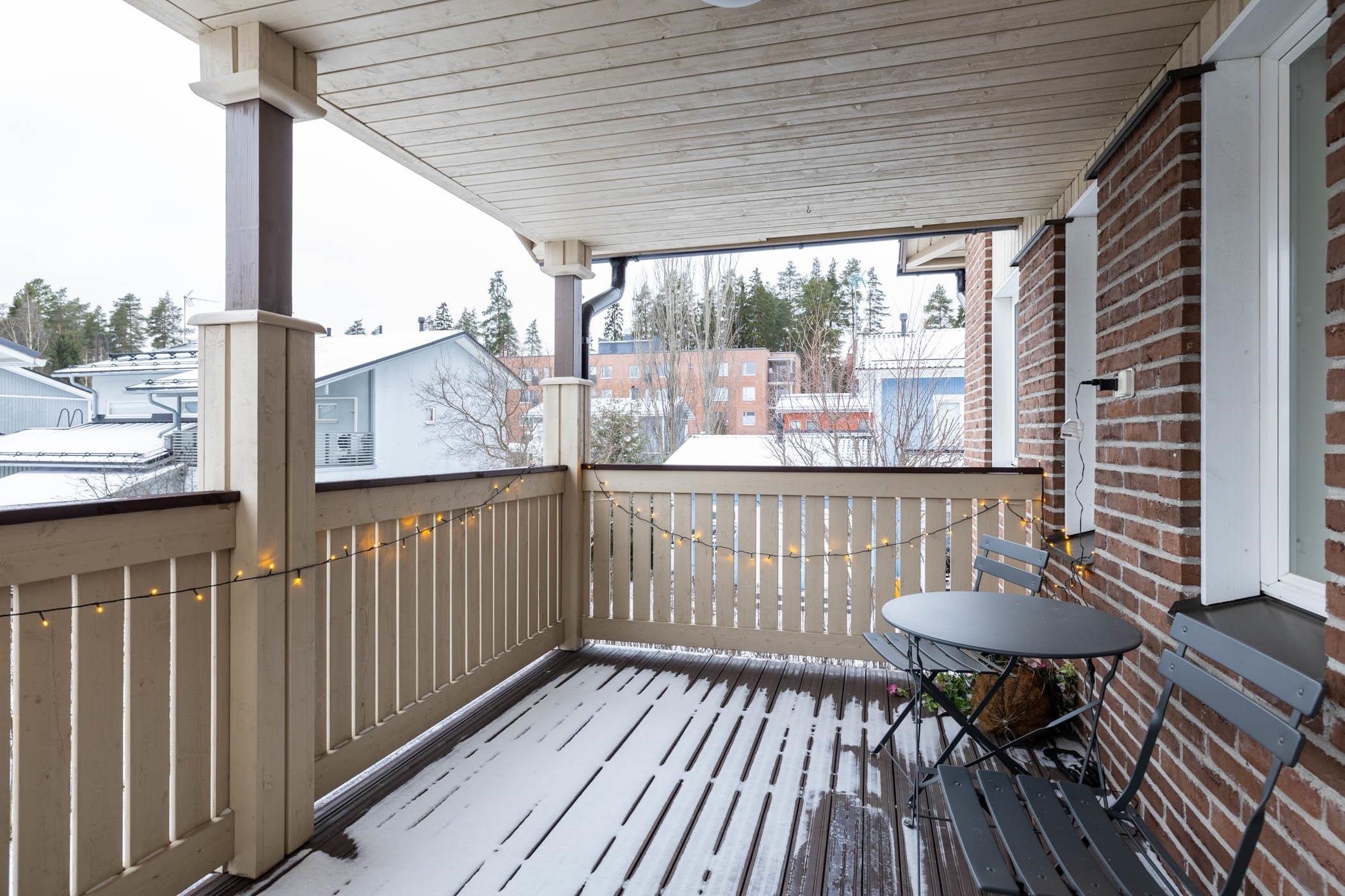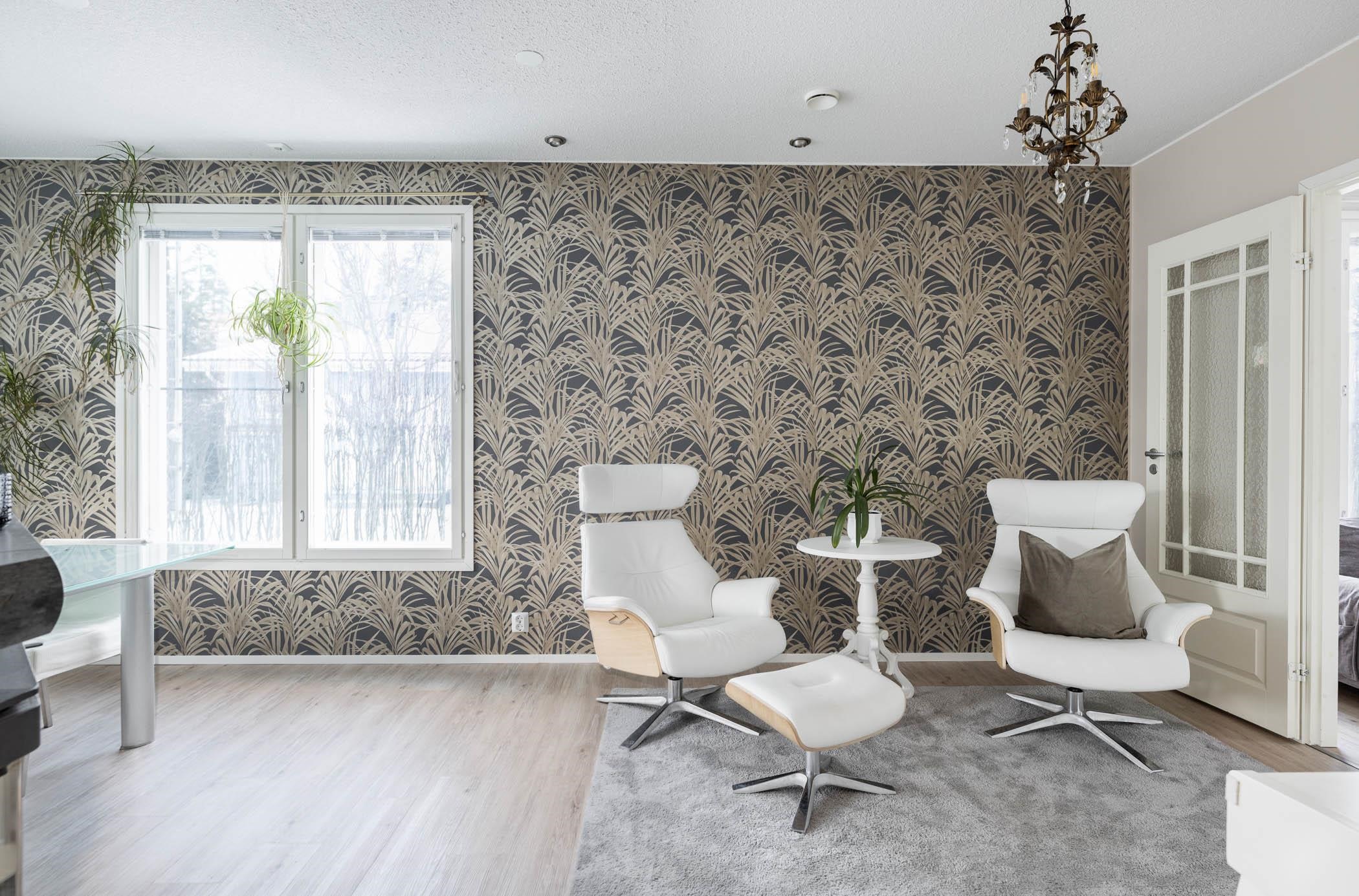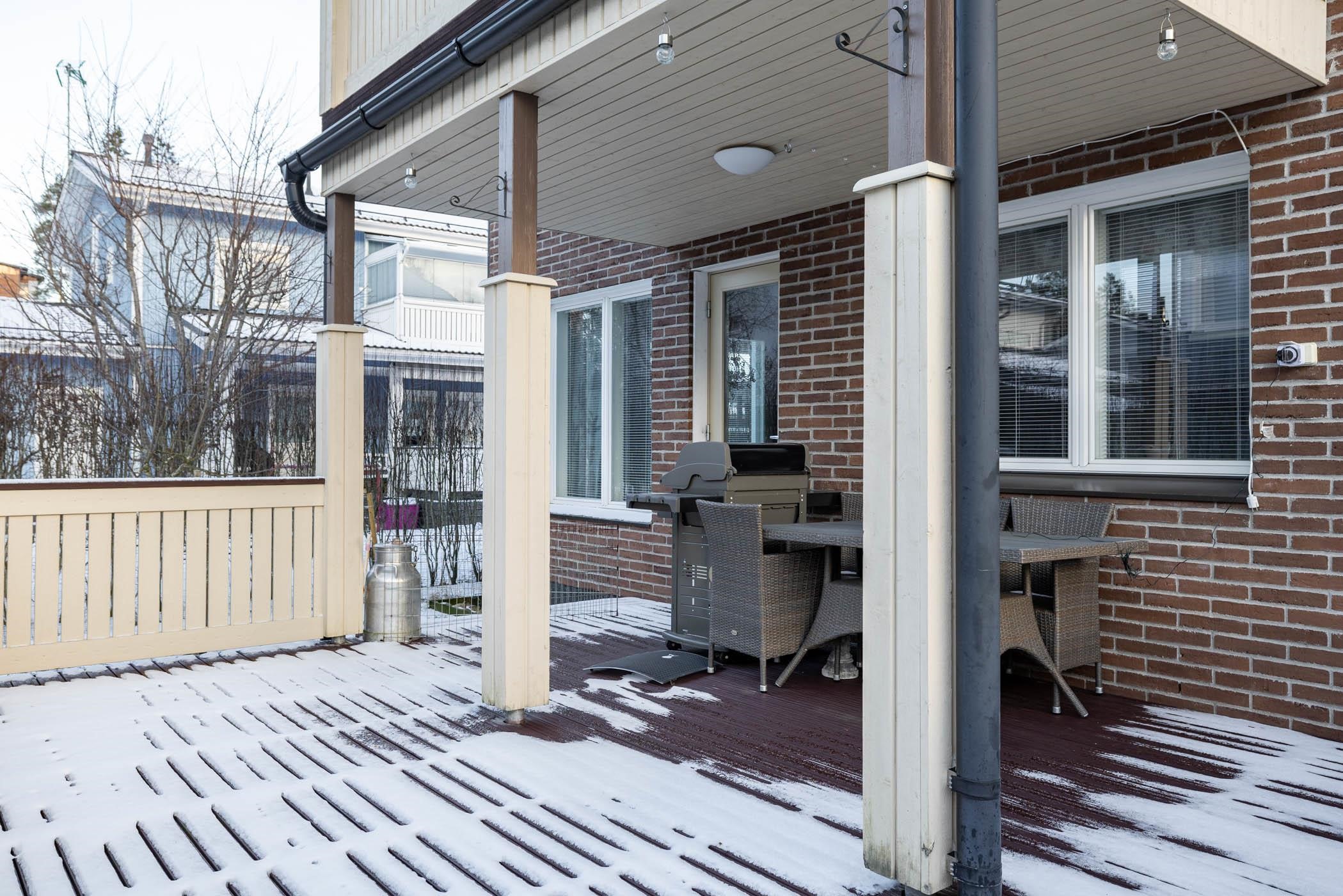Tilaa riittää: olohuoneen lisäksi viisi huonetta, toimivat kodinhoitotilat ja runsaasti säilytystilaa. Molemmissa kerroksissa omat kylpyhuoneet, ja yläkerrassa sauna rentoutumiseen.
