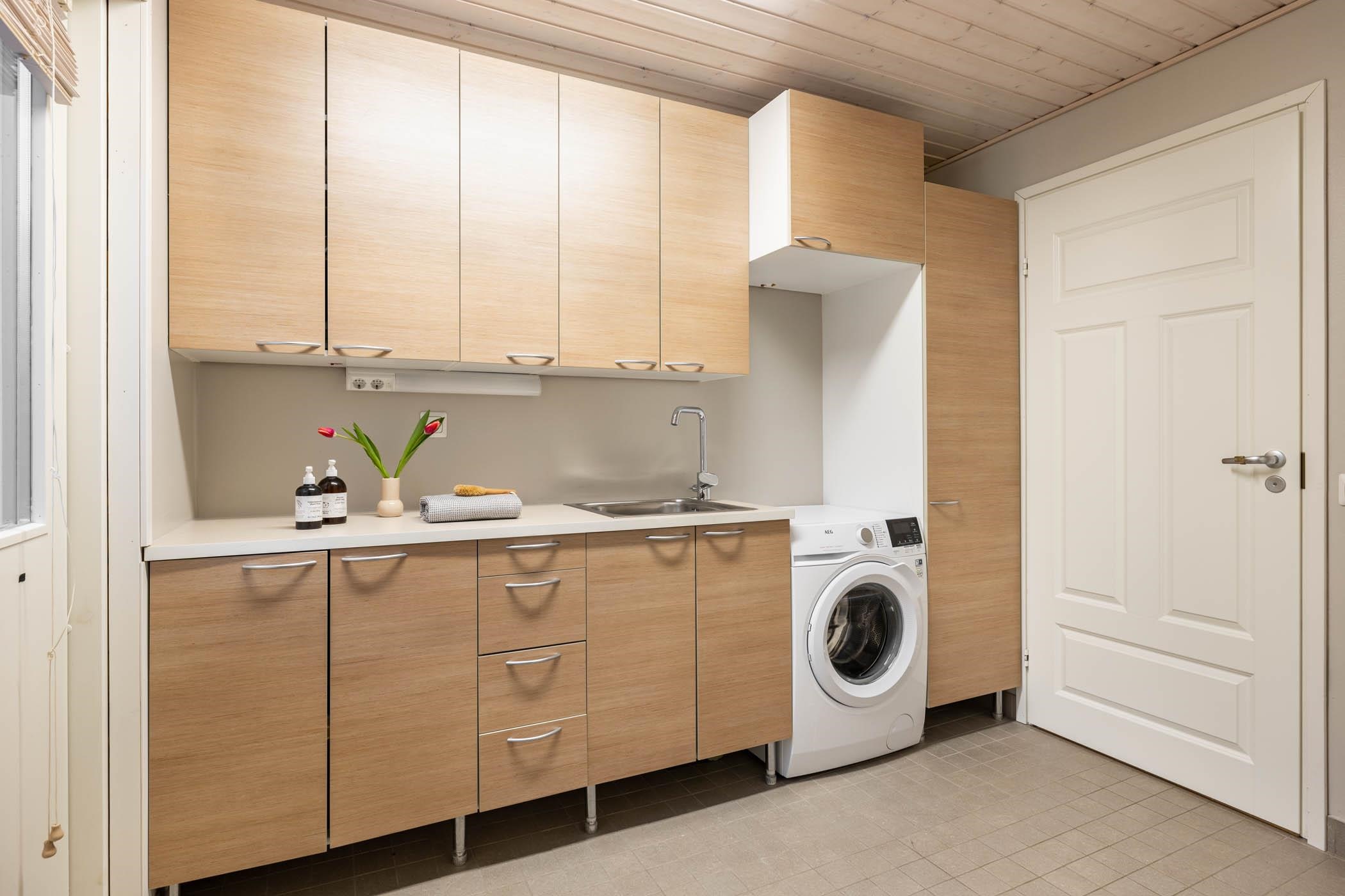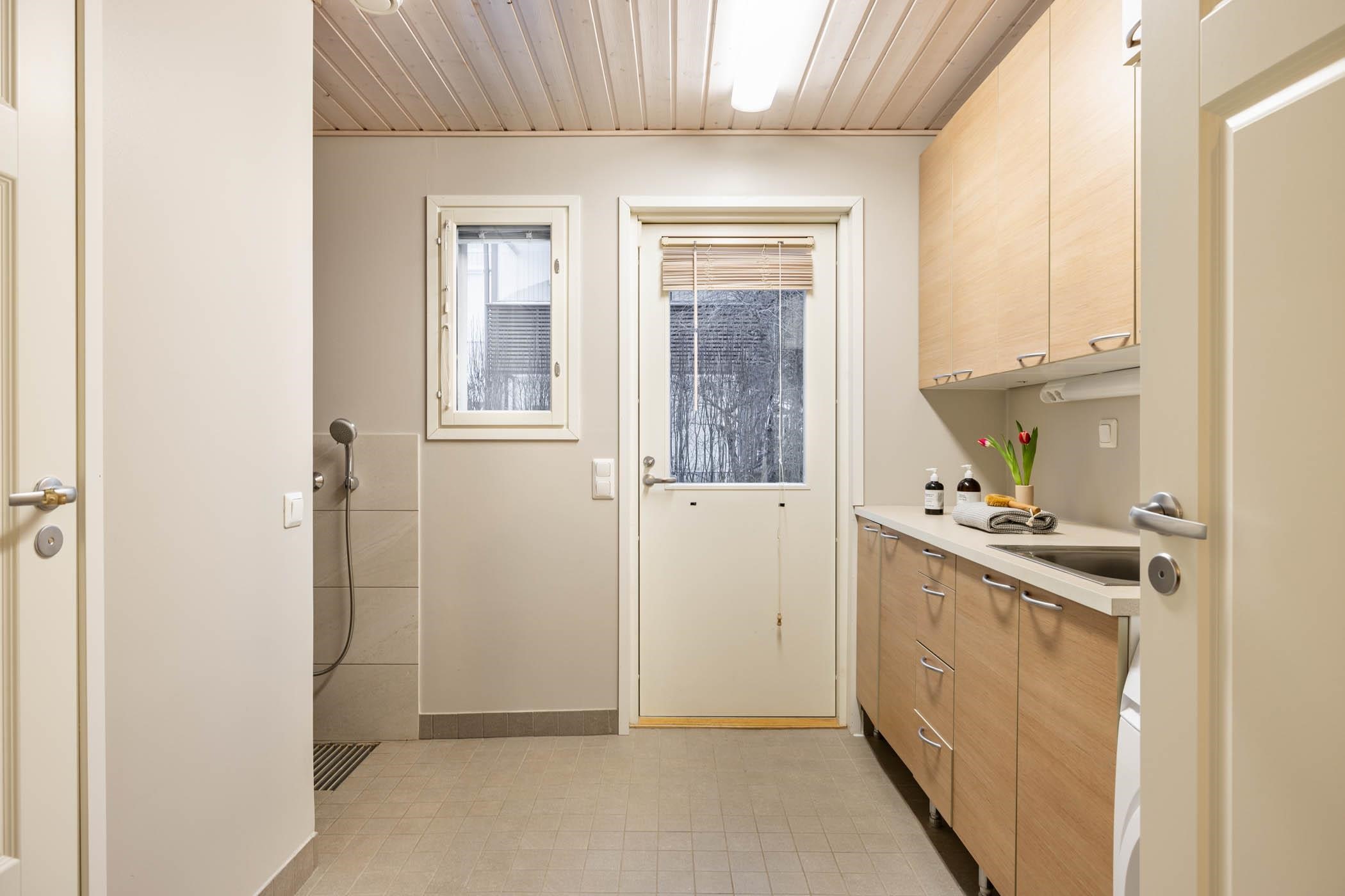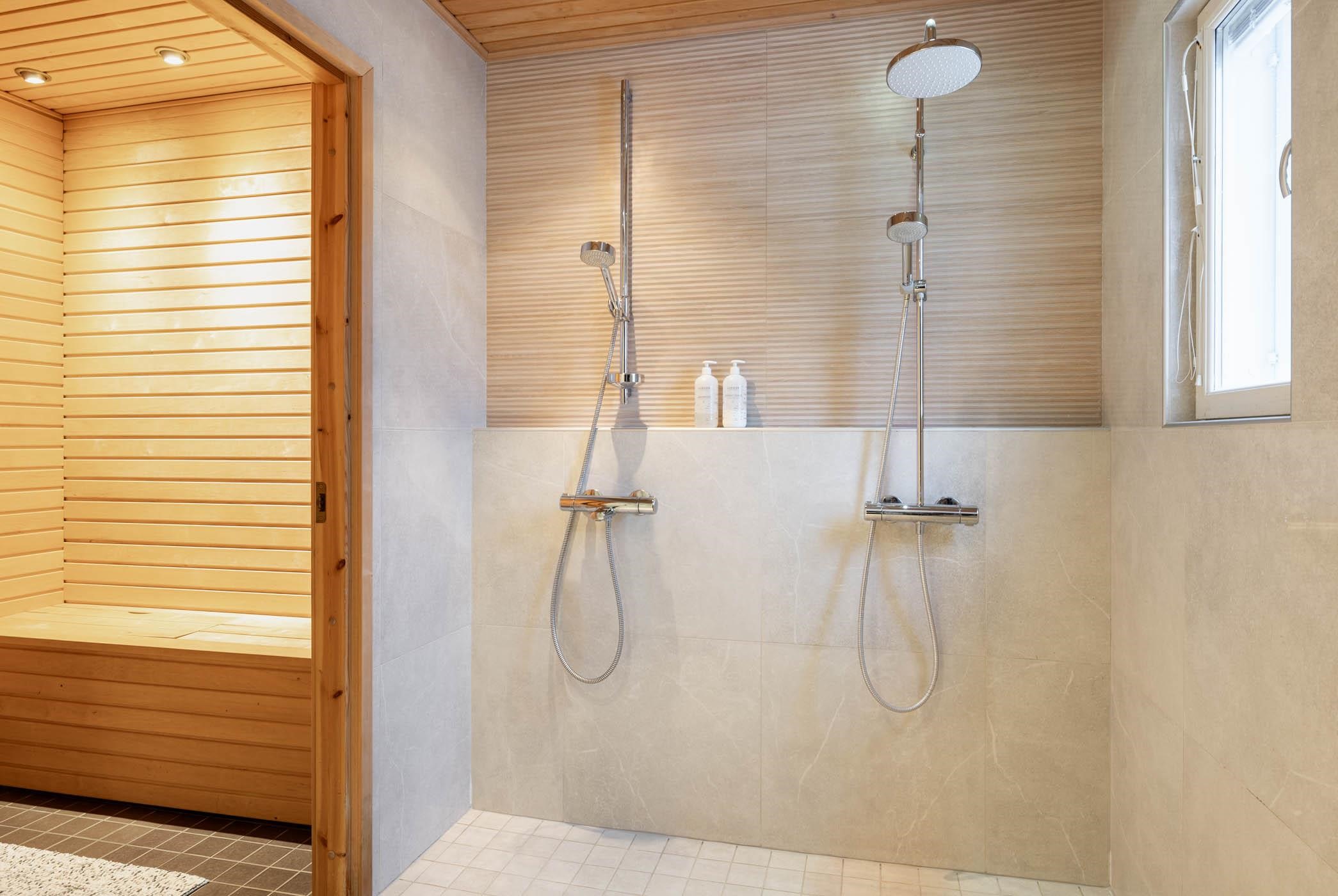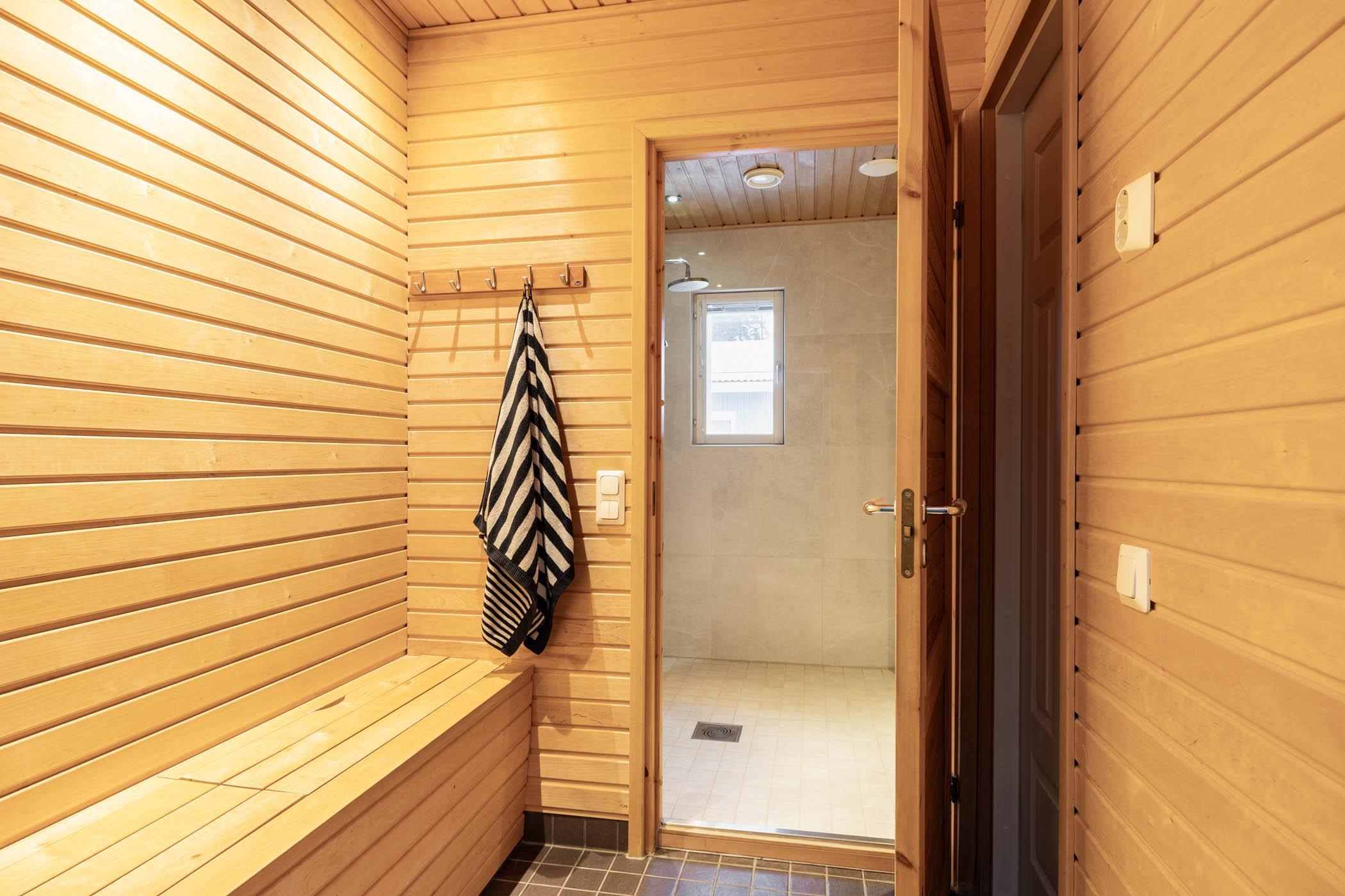 - Tunnelmallisessa saunassa on Mondexin (2023) uusittu pilarikiuas. Yläkerran kylpyhuoneessa on kaksi suihkua. Alakerran kylpyhuoneessa on suihku, allaskaappi, valopeili ja wc-istuin. Molemmissa kerroksissa on erilliset wc:t. Vessoissa on allaskaapistot ja peilit. Käytännöllisessä kodinhoitohuoneessa on pesukoneliitäntä (pesutornivaraus), kurasyöppö, pyyhekuivain, elfa-hyllyt ja kuivausoksat.