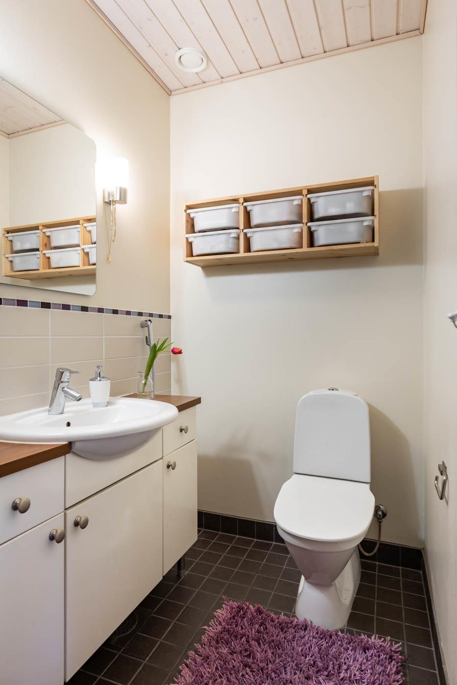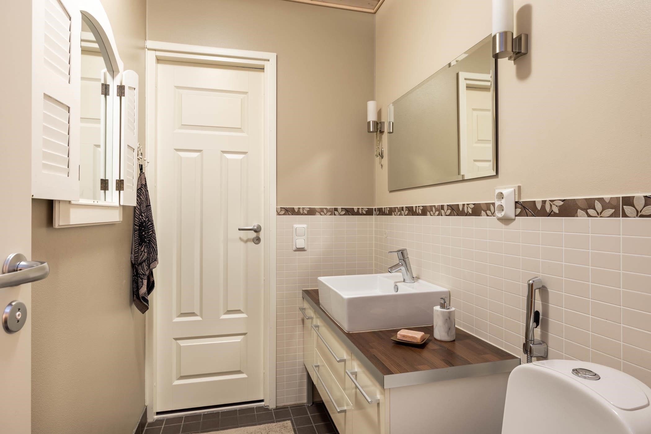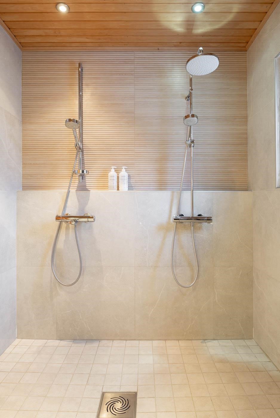 - Tunnelmallisessa saunassa on Mondexin (2023) uusittu pilarikiuas. Yläkerran kylpyhuoneessa on kaksi suihkua. Alakerran kylpyhuoneessa on suihku, allaskaappi, valopeili ja wc-istuin. Molemmissa kerroksissa on erilliset wc:t. Vessoissa on allaskaapistot ja peilit. Käytännöllisessä kodinhoitohuoneessa on pesukoneliitäntä (pesutornivaraus), kurasyöppö, pyyhekuivain, elfa-hyllyt ja kuivausoksat.