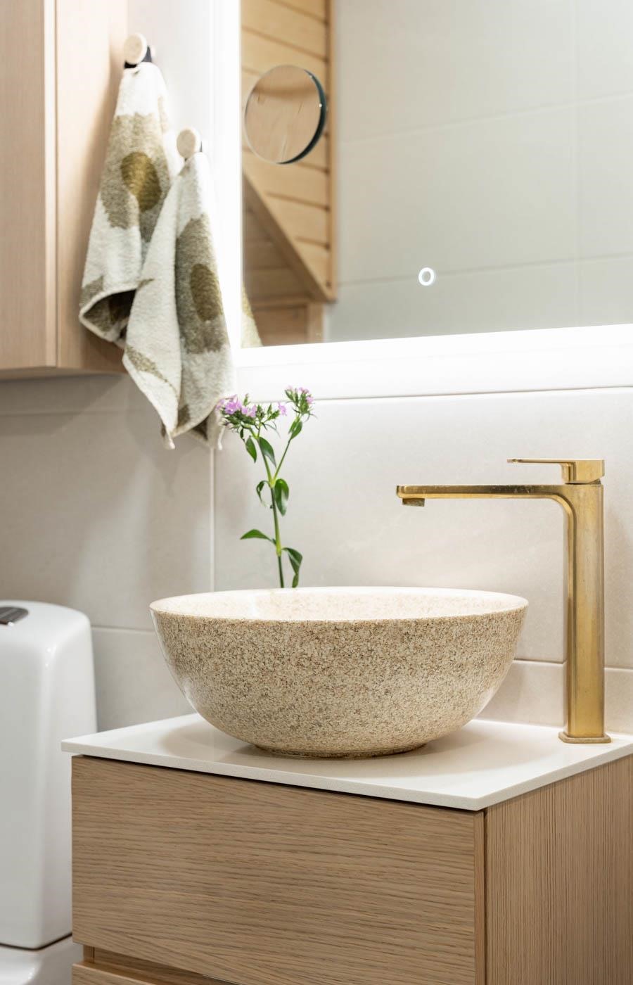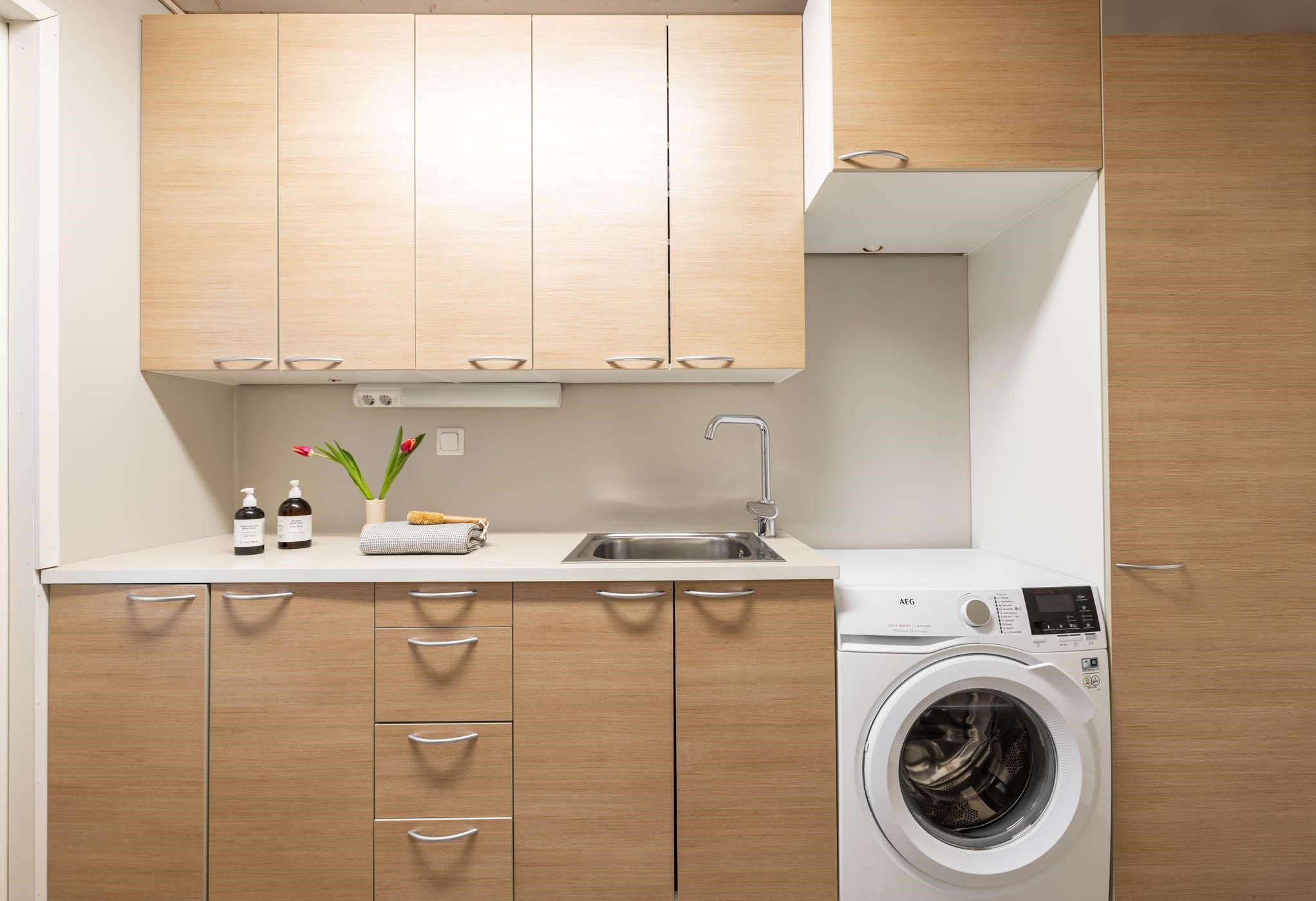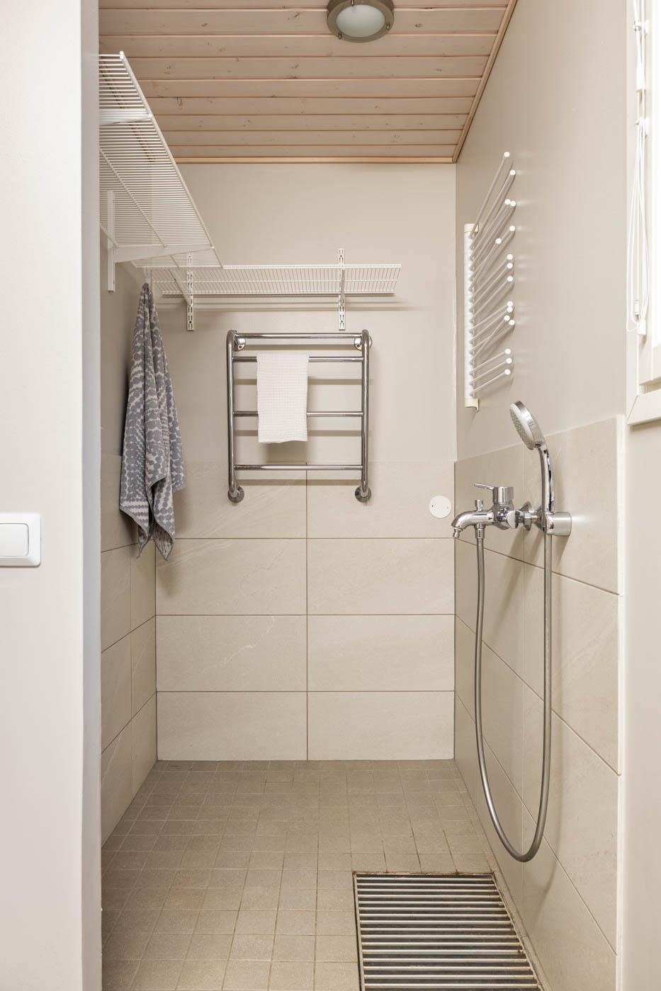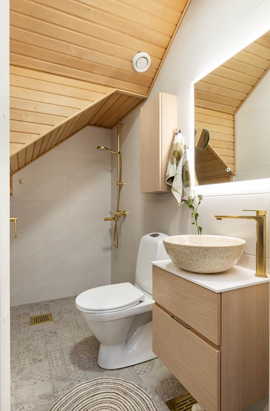 - Tunnelmallisessa saunassa on Mondexin (2023) uusittu pilarikiuas. Yläkerran kylpyhuoneessa on kaksi suihkua. Alakerran kylpyhuoneessa on suihku, allaskaappi, valopeili ja wc-istuin. Molemmissa kerroksissa on erilliset wc:t. Vessoissa on allaskaapistot ja peilit. Käytännöllisessä kodinhoitohuoneessa on pesukoneliitäntä (pesutornivaraus), kurasyöppö, pyyhekuivain, elfa-hyllyt ja kuivausoksat.