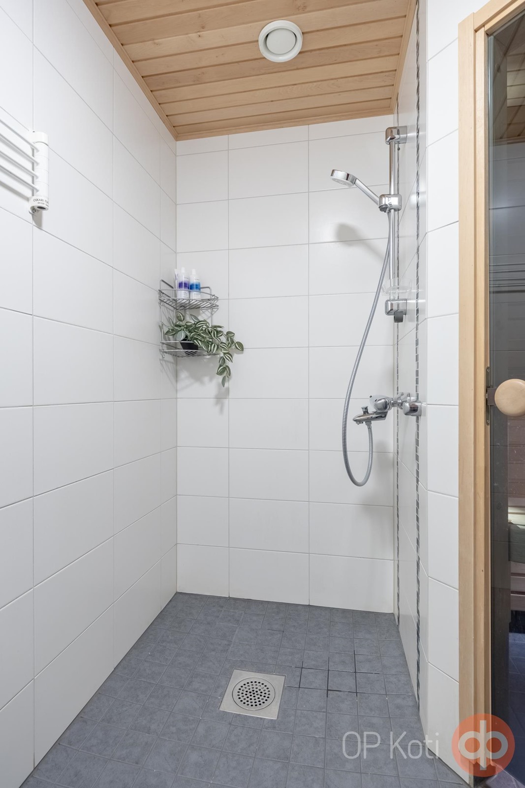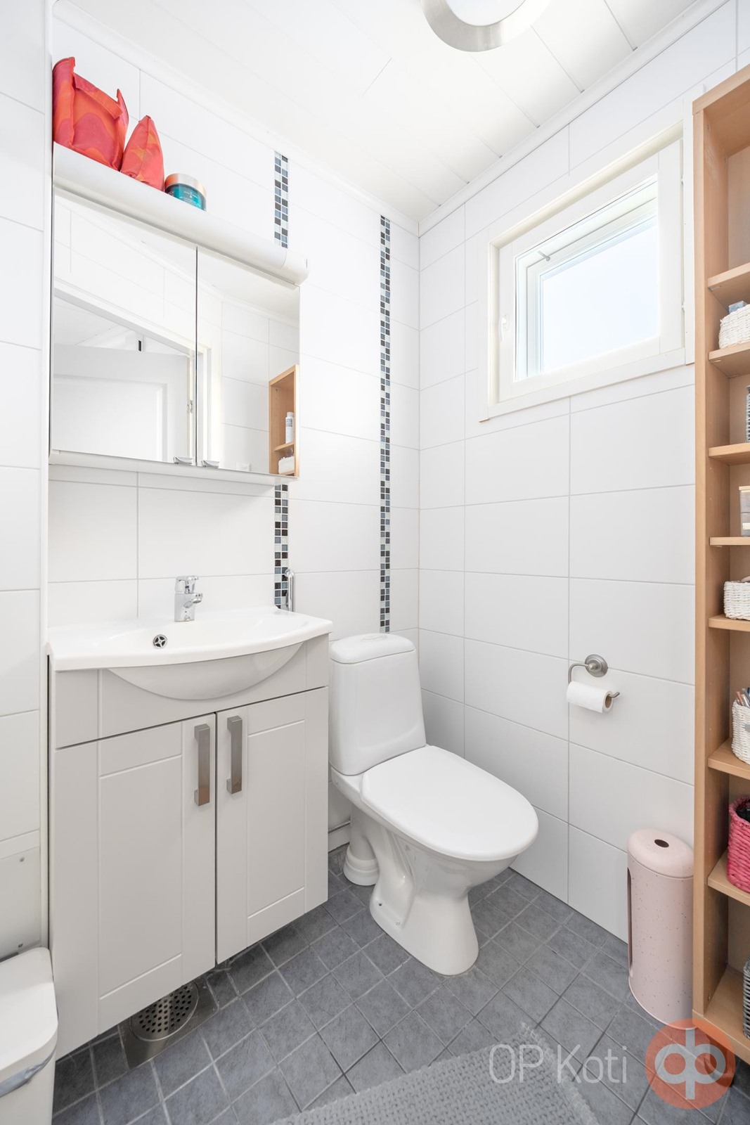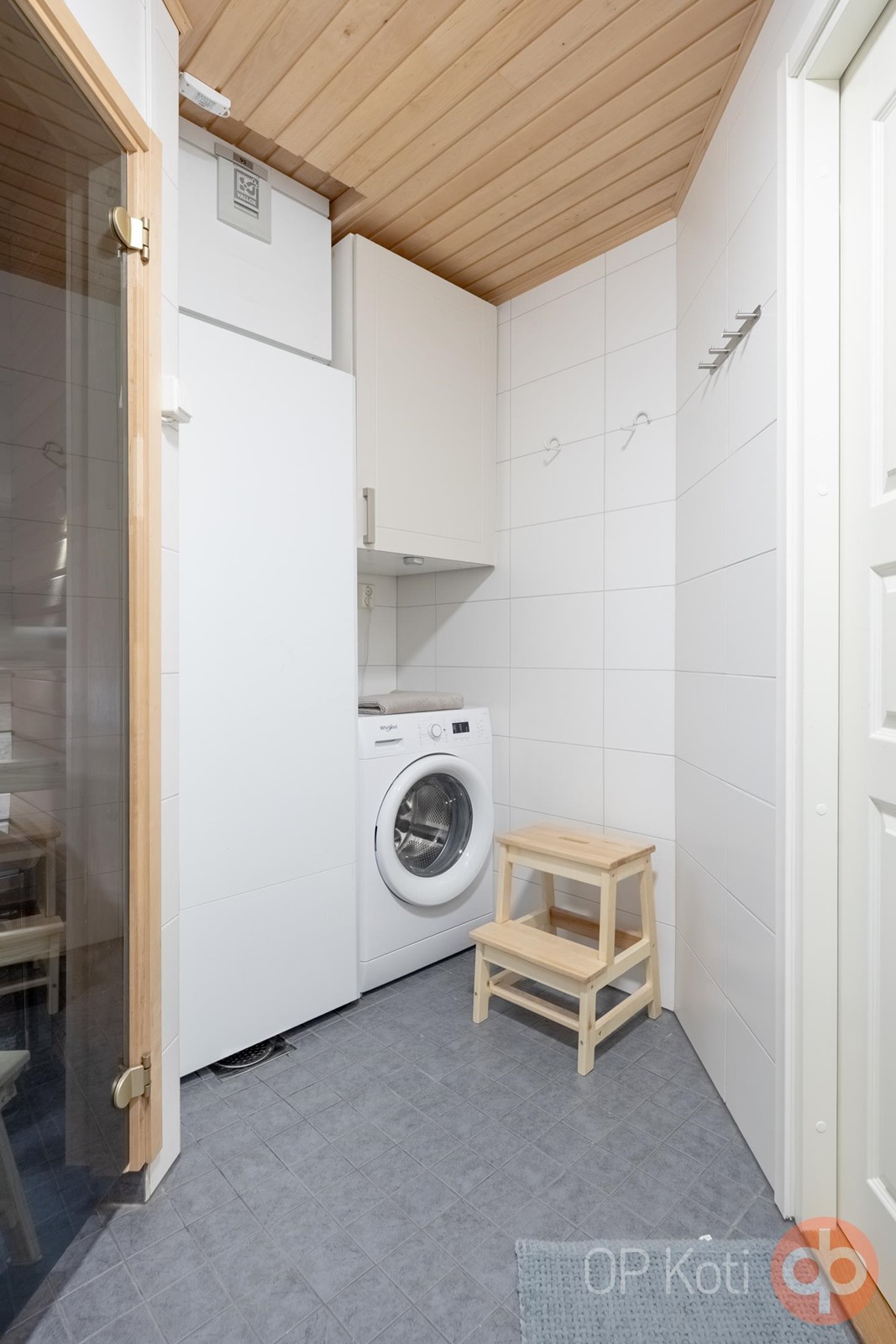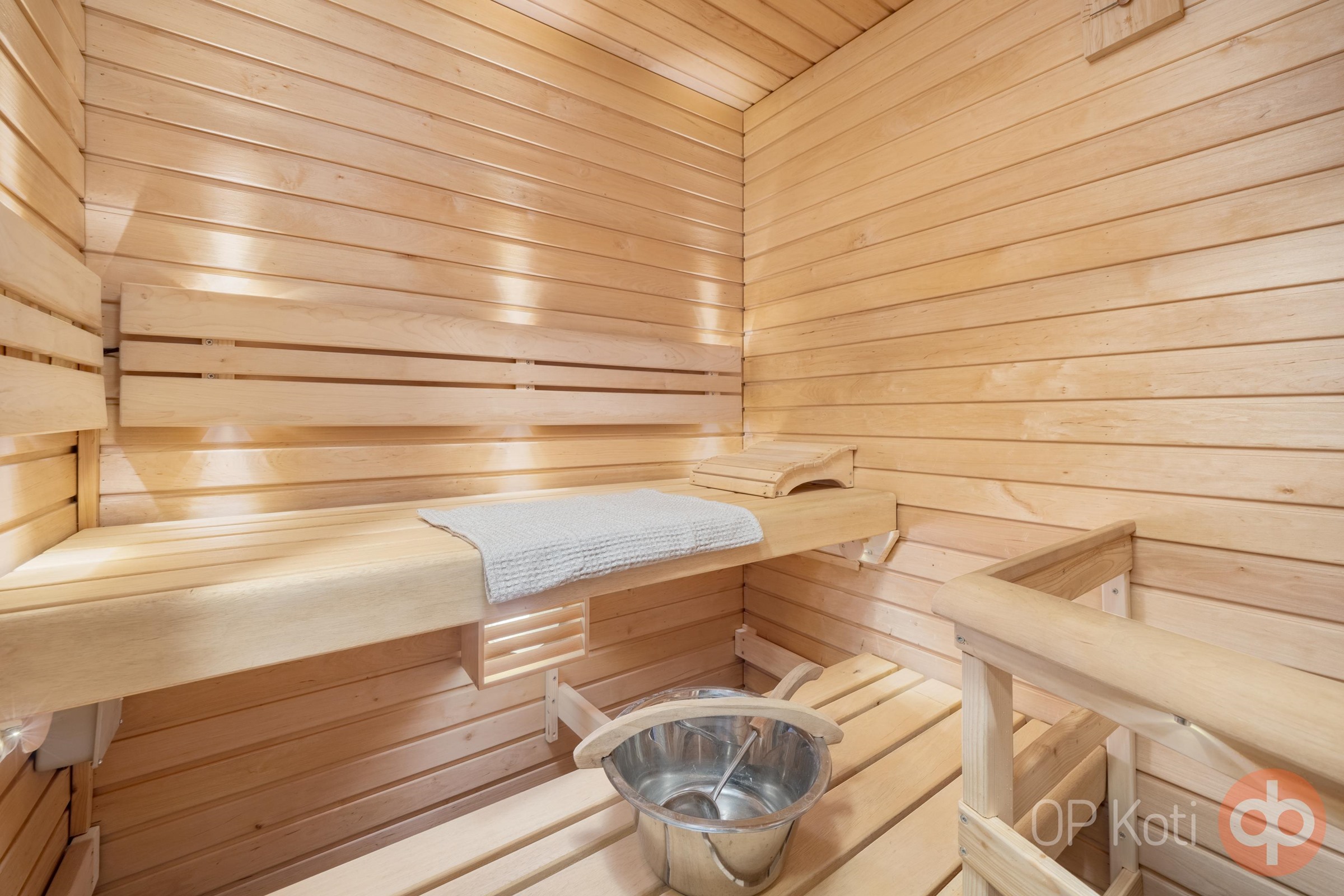 - Sauna, sähkökiuas, kylpyhuone, erillinen wc, suihku, peilikaappi, allaskaappi, pesukoneliitäntä, lattialämmitys, kiinteät valaisimet.