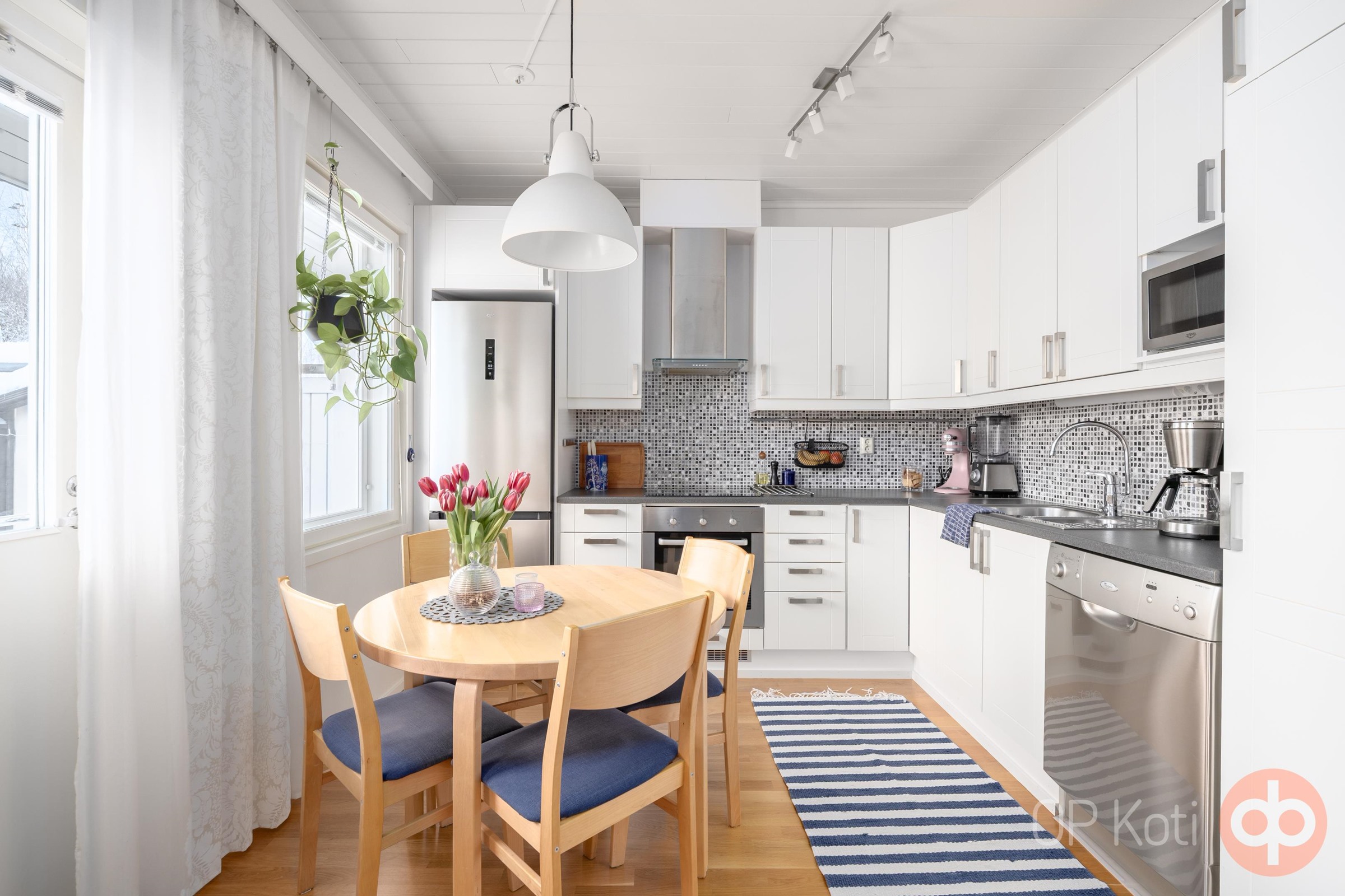 - Jääkaappipakastin, erillisuuni, keraaminen liesi, liesikupu, liesituuletin, astianpesukone, kaapistot, kiinteät valaisimet.