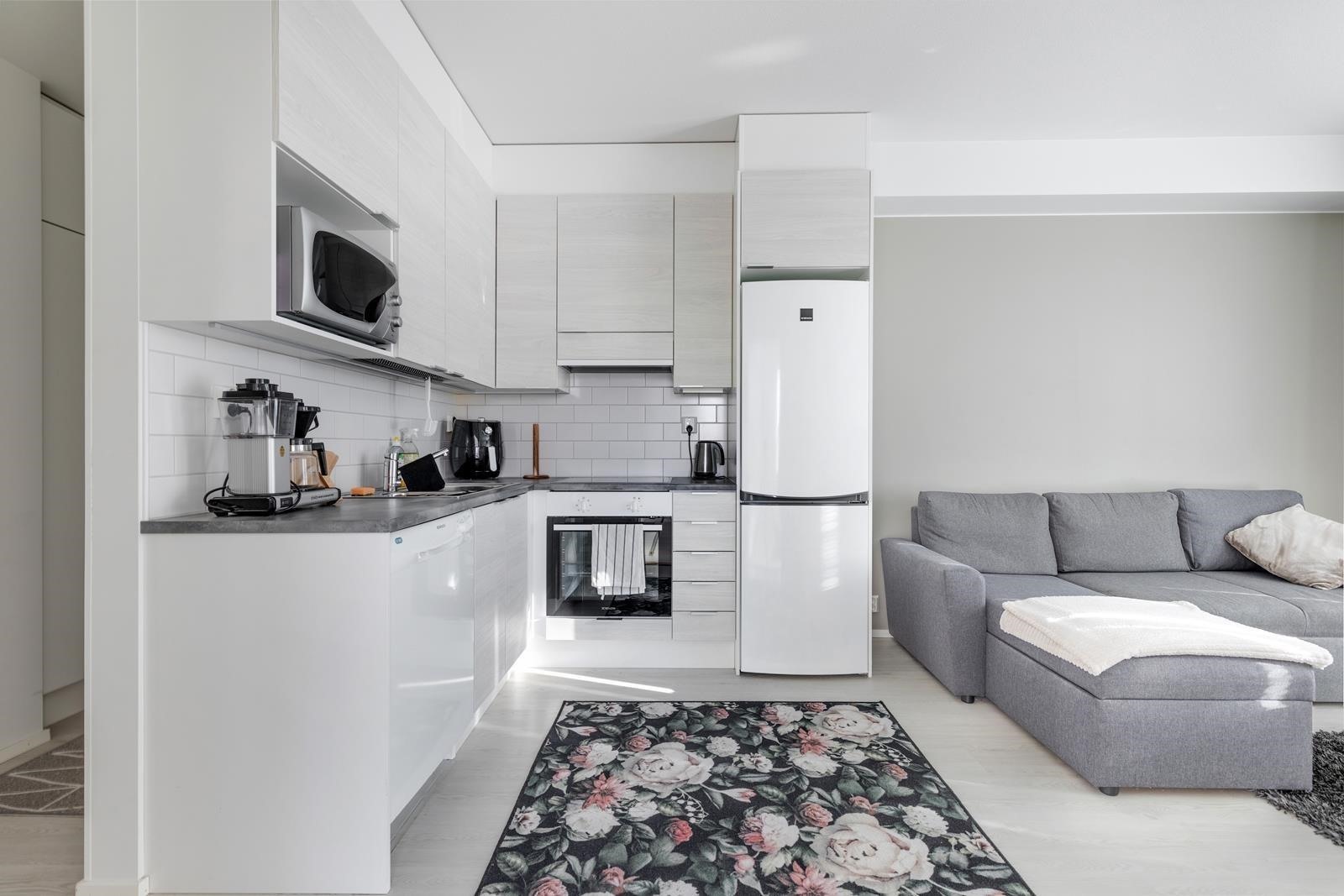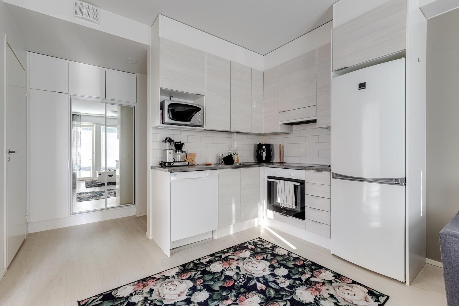 - Jääkaappipakastin, induktioliesi, liesituuletin, astianpesukone, kaapistot, kiinteät valaisimet.