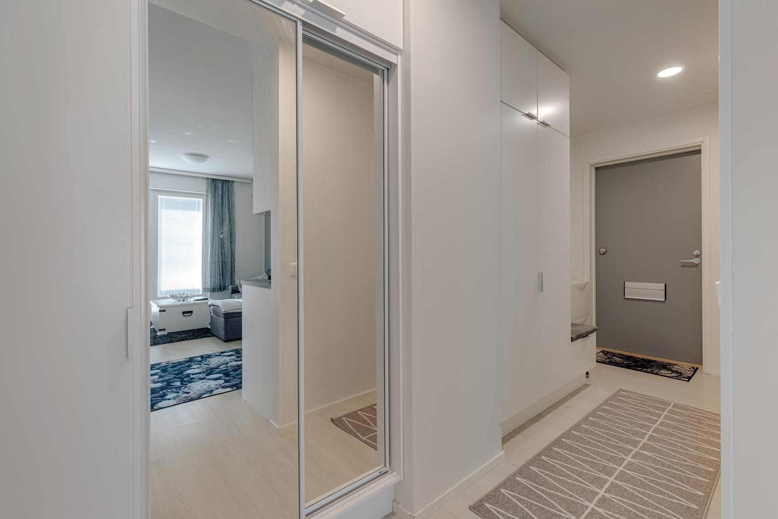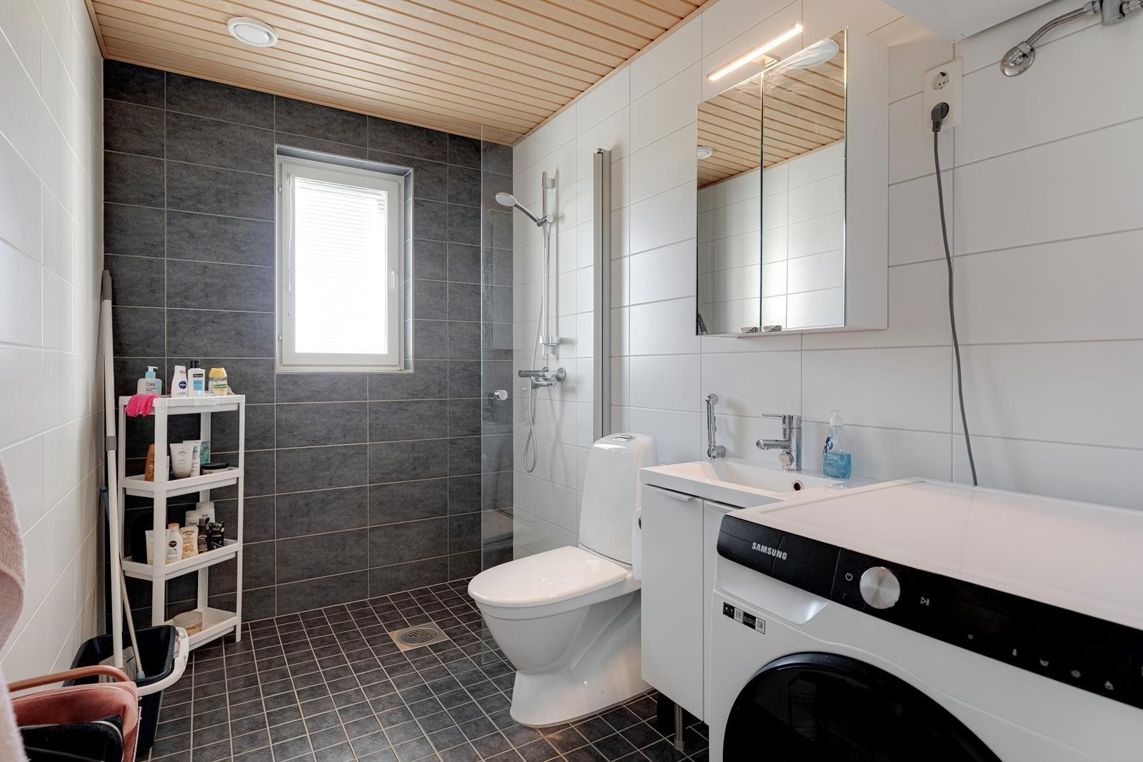 - Kylpyhuone, suihku, suihkuseinä, peilit, allaskaappi, pesukoneliitäntä, lattialämmitys, kiinteät valaisimet.
