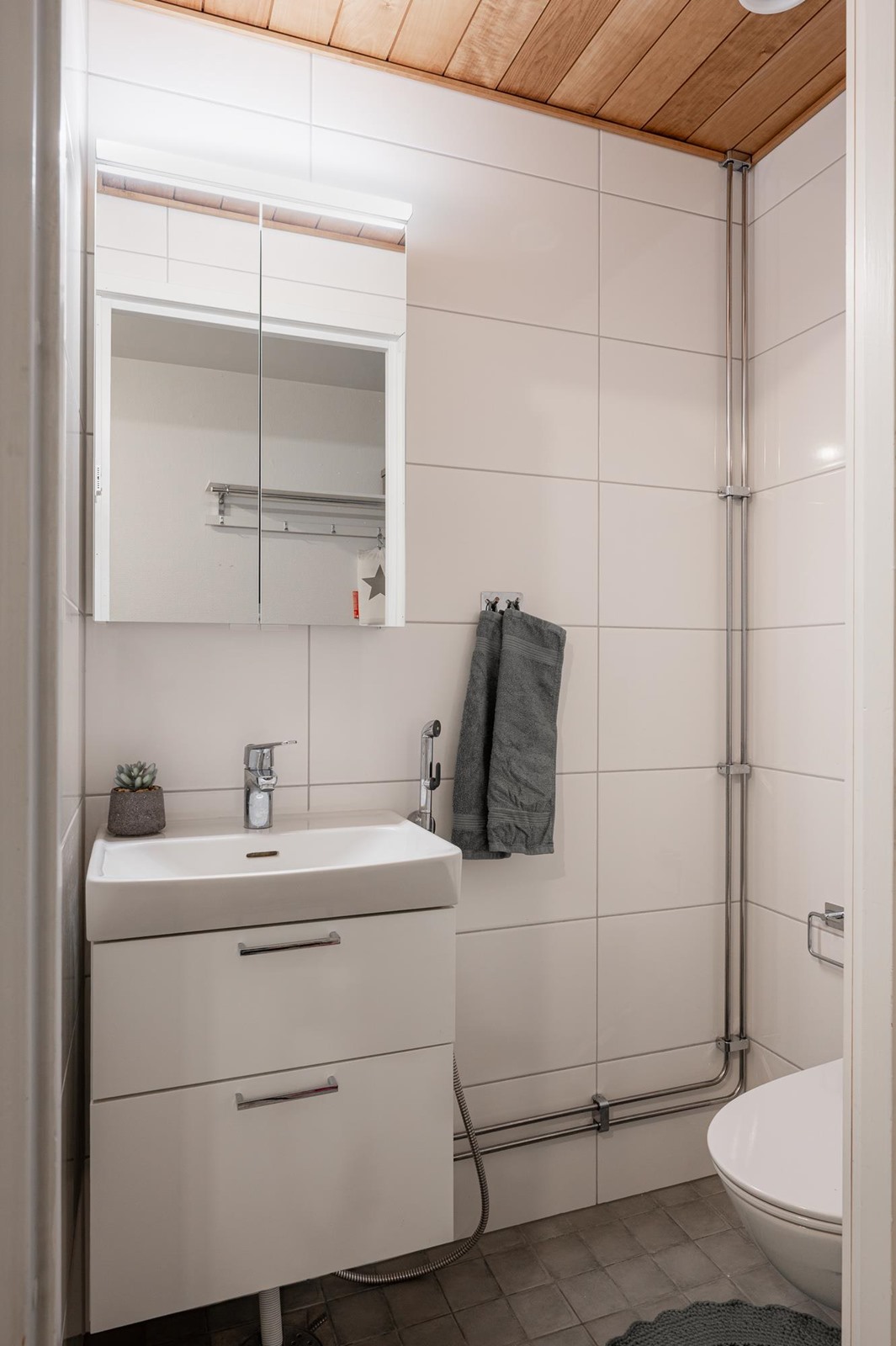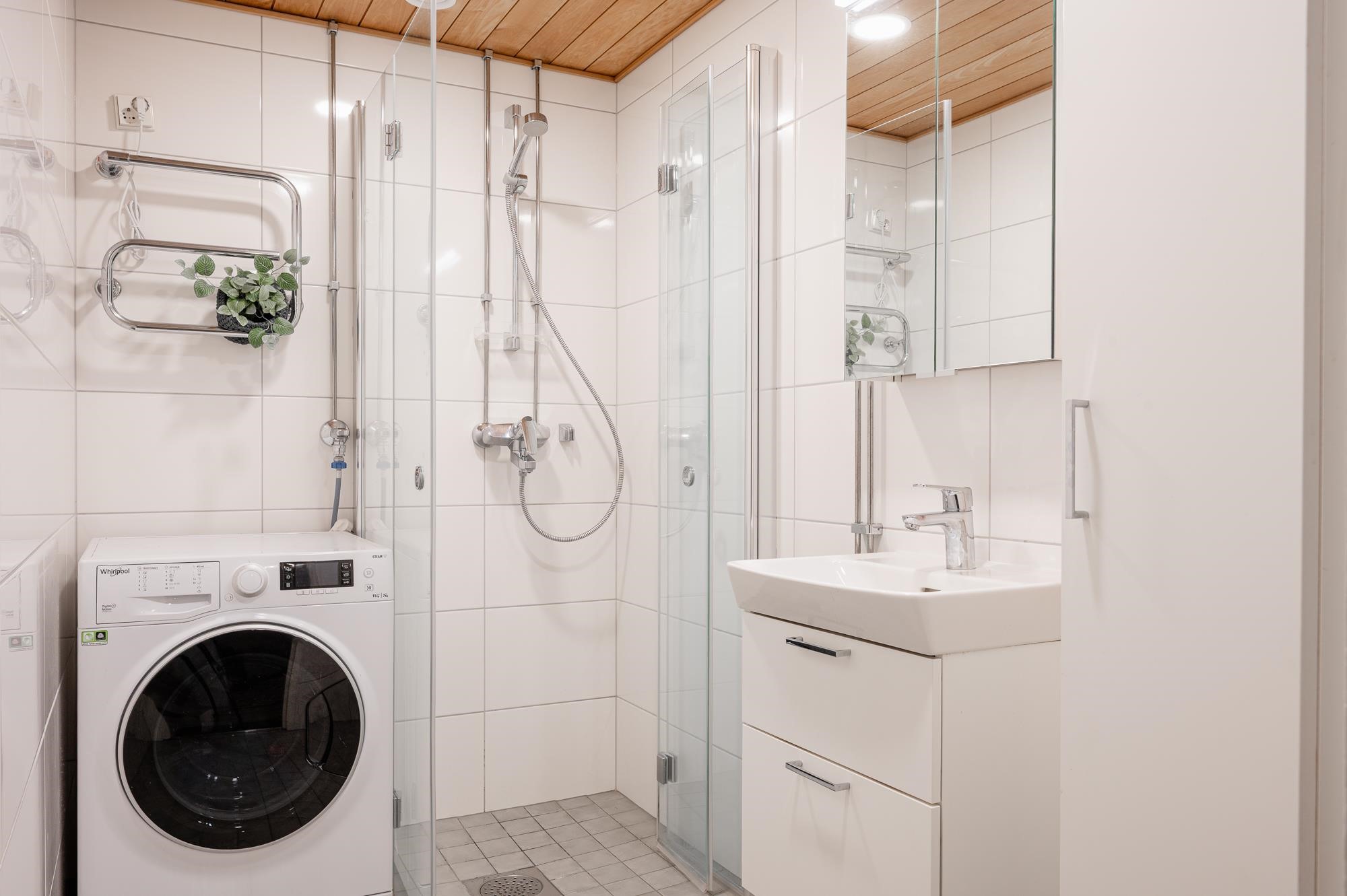 - Kylpyhuoneessa: suihku, suihkuseinä; taittuvat, peilikaappi, allaskaappi, pesukoneliitäntä, lattialämmitys; sähköinen, korkea kaappi, pyyhepatteri. Erillisessä wc:ssä: allaskaappi, peilikaappi, seinä-wc -istuin, lattialämmitys; sähköinen.
