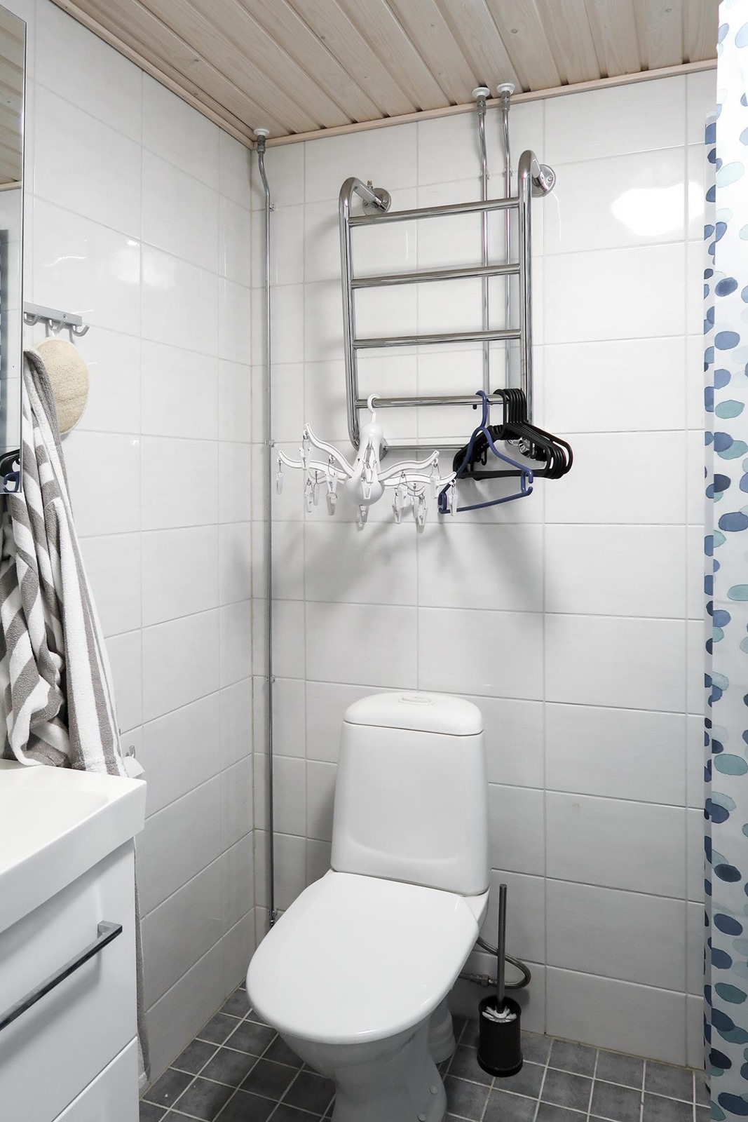 - Kylpyhuone, suihku, peilikaappi, allaskaappi, pesukoneliitäntä, lattialämmitys.