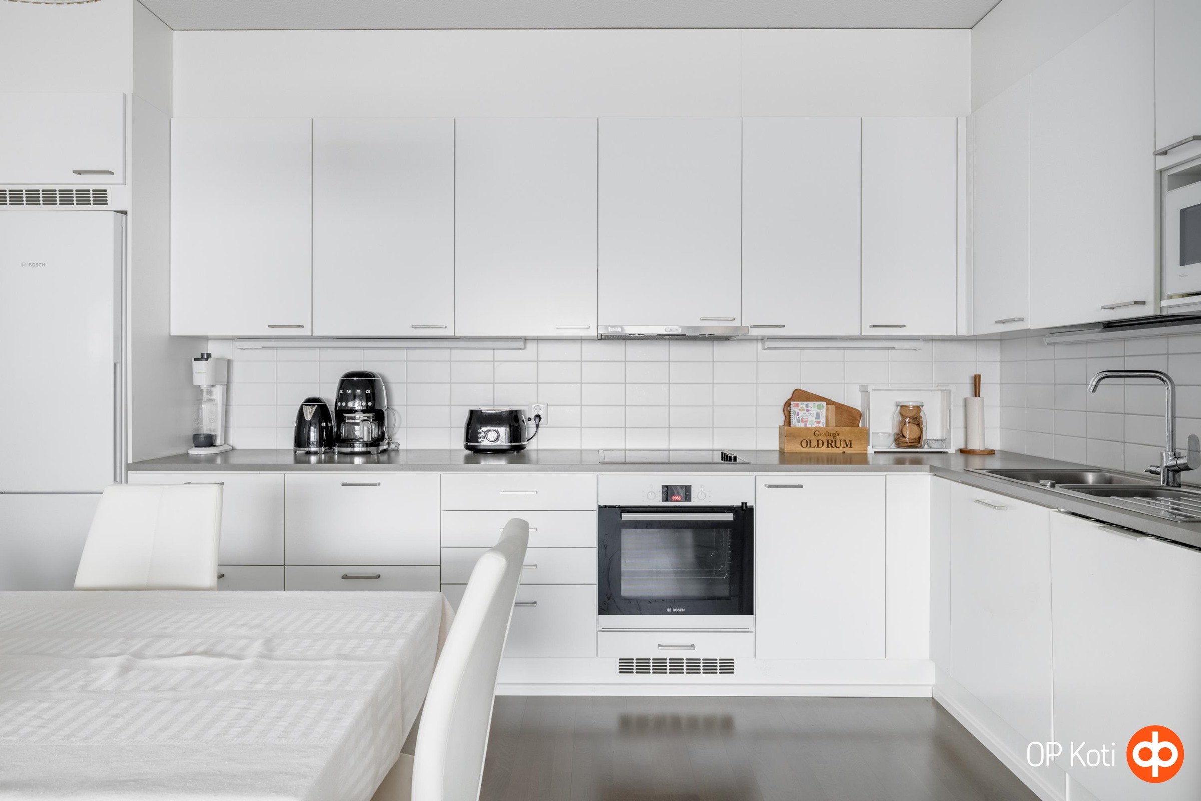 - Jääkaappi, pakastekaappi, erillisuuni, induktioliesi, liesituuletin, astianpesukone, kaapistot, kiinteät valaisimet.