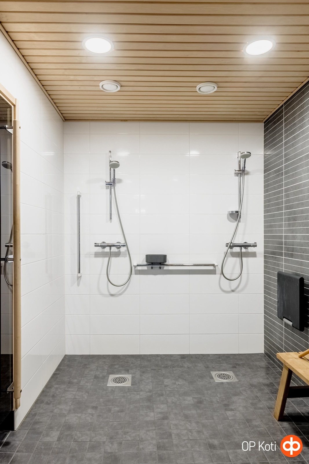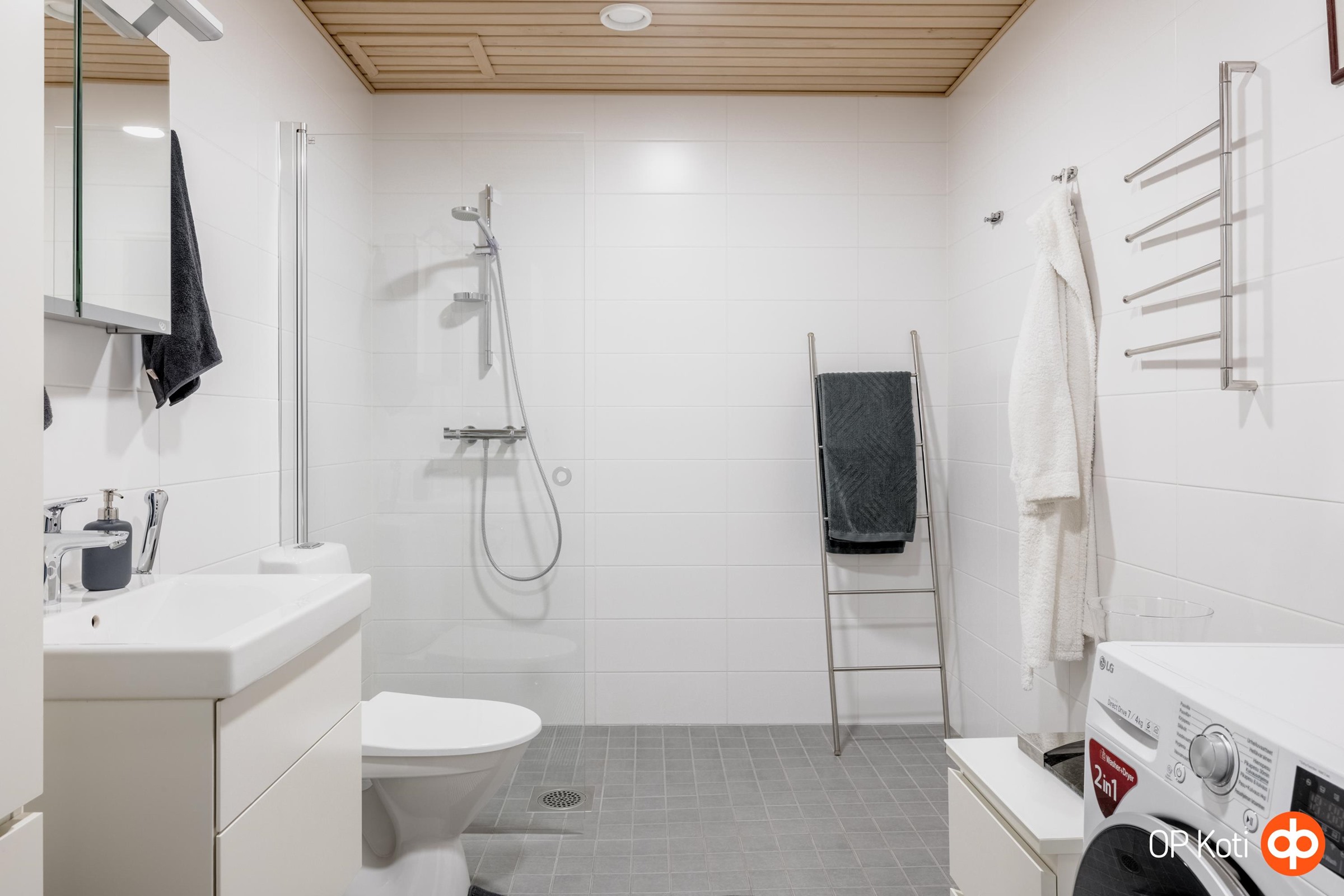 - Kylpyhuone, suihku, suihkuseinä, peilikaappi, allaskaappi, pesukoneliitäntä, lattialämmitys, kiinteät valaisimet. Pyyhe/kuivausteline