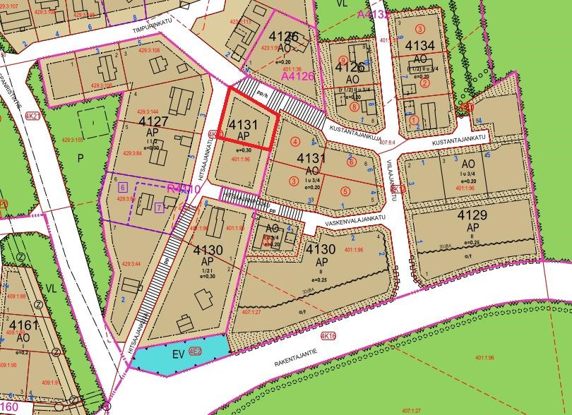 - Asemakaava (ohjeellinen tonttijako). Alueella voimassa oleva asemakaavamerkintä AP, asuinpientalojen korttelialue. Lähialueella vireillä asemakaavamuutos: Keskusliikuntapuiston asemakaavan muutos, A4322; Tavoitteena on parantaa Kaarinan kaupungin keskeisimmän liikunta- ja virkistyspalveluihin soveltuvan keskuksen toiminnallisia järjestelyjä niin vapaa-ajan käyttäjän kuin urheiluseurojen toiminnan näkökulmasta. Lisäksi tavoitellaan liikuntapuiston kehittämistä pysäköinnin ja liikenteen järjestämisen lähtökohdista ajoneuvo-, kevyen- ja joukkoliikenteen osalta. Lisätietoja: https://kaarina.fi/fi/asuminen-ja-ymparisto/kaavoitus-ja-kaupunkisuunnittelu/a4322-keskusliikuntapuiston-asemakaavan#209b89f1. Kaarinan kaupunki, p. (02) 588 4000