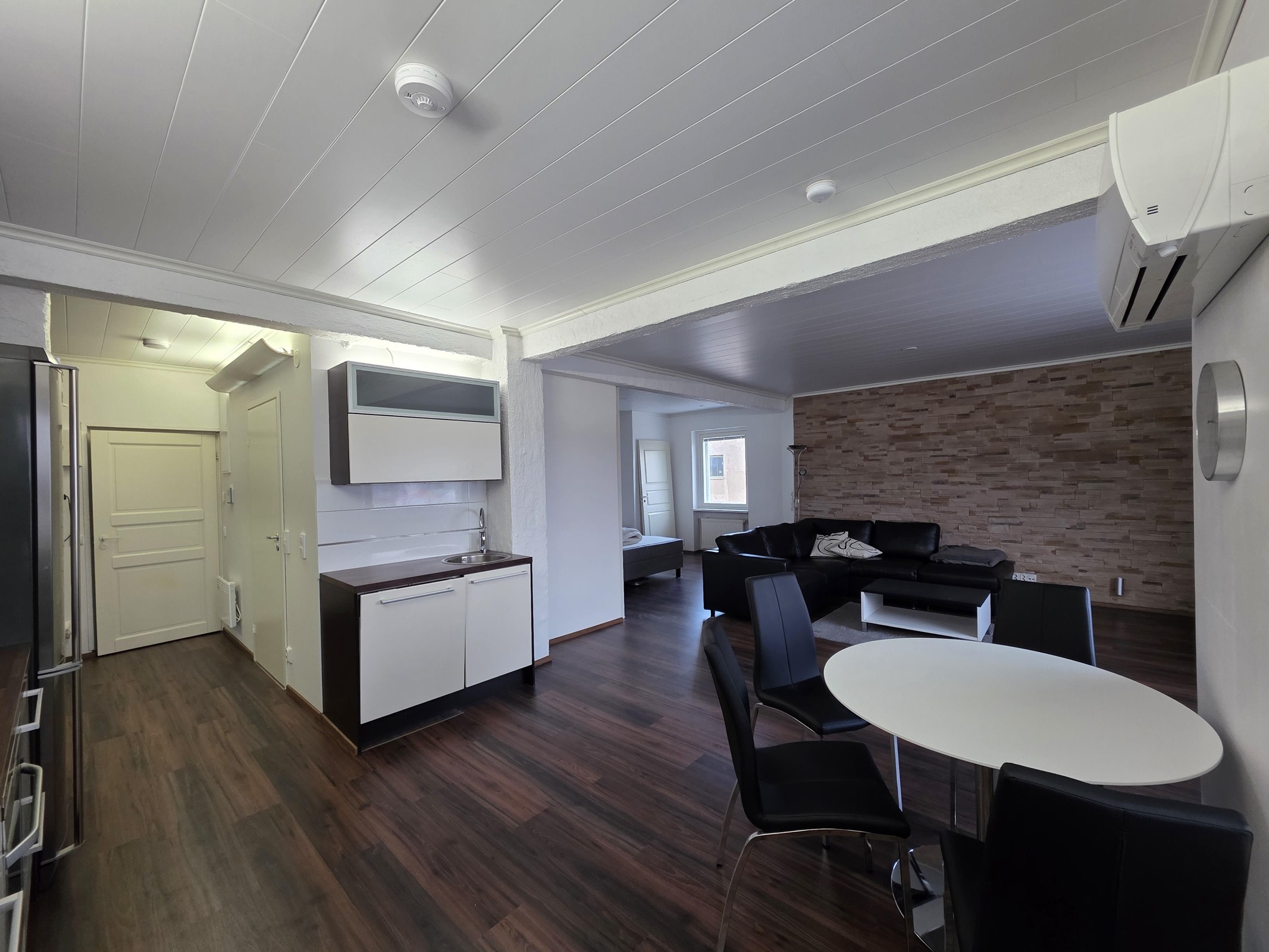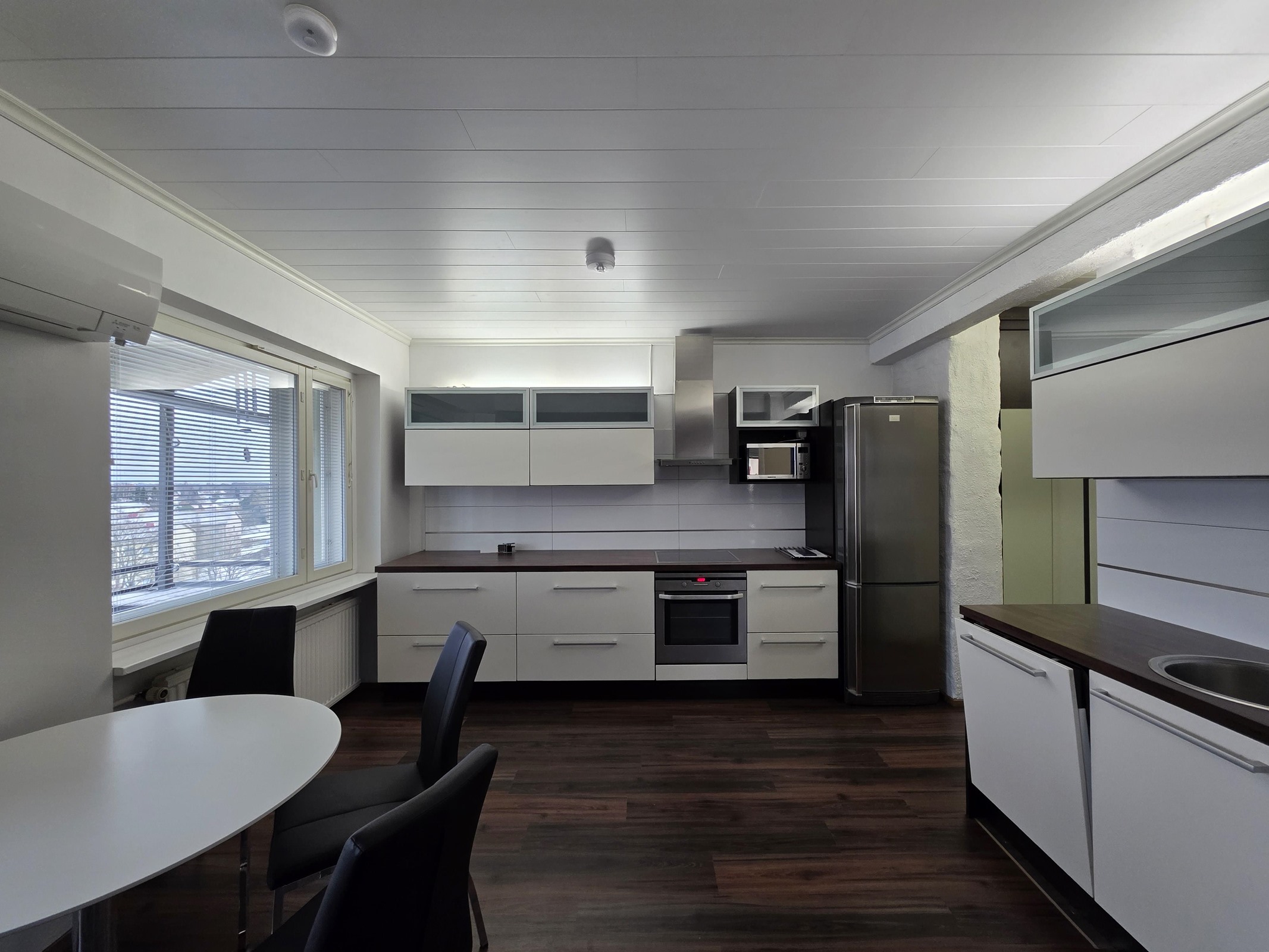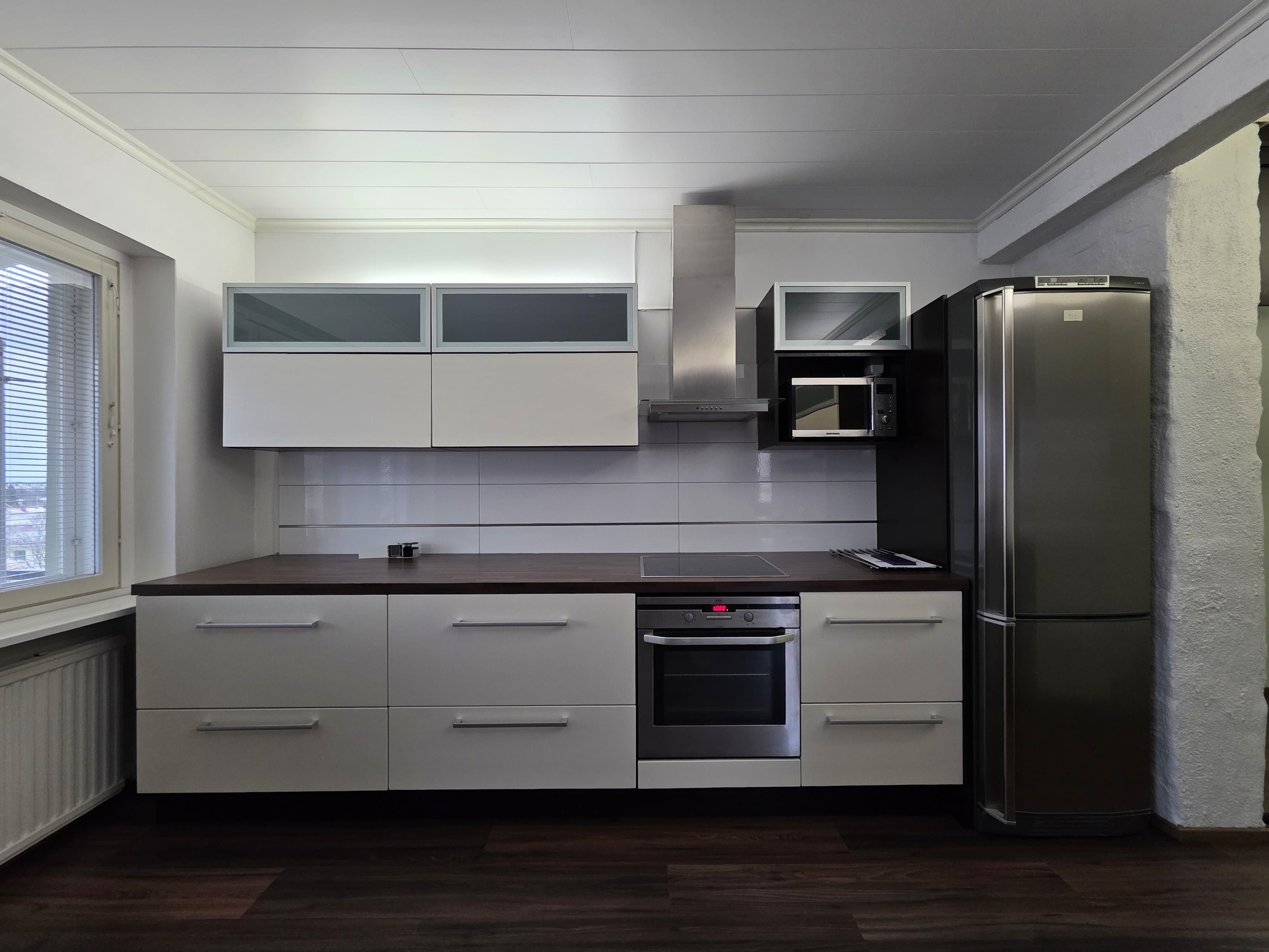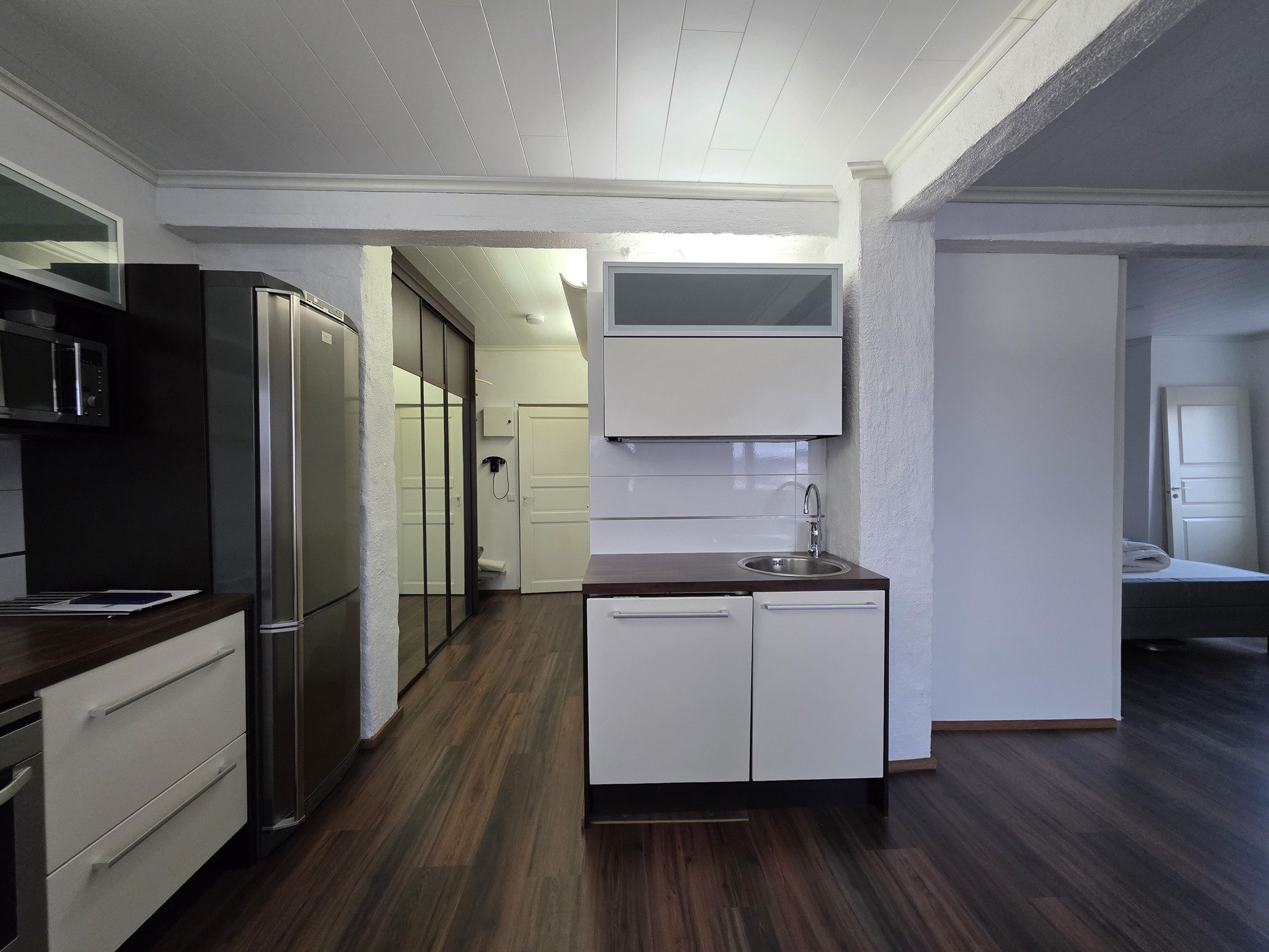 Lattia: tyylikäs laminaatti. Seinät: valkoinen maalattu.