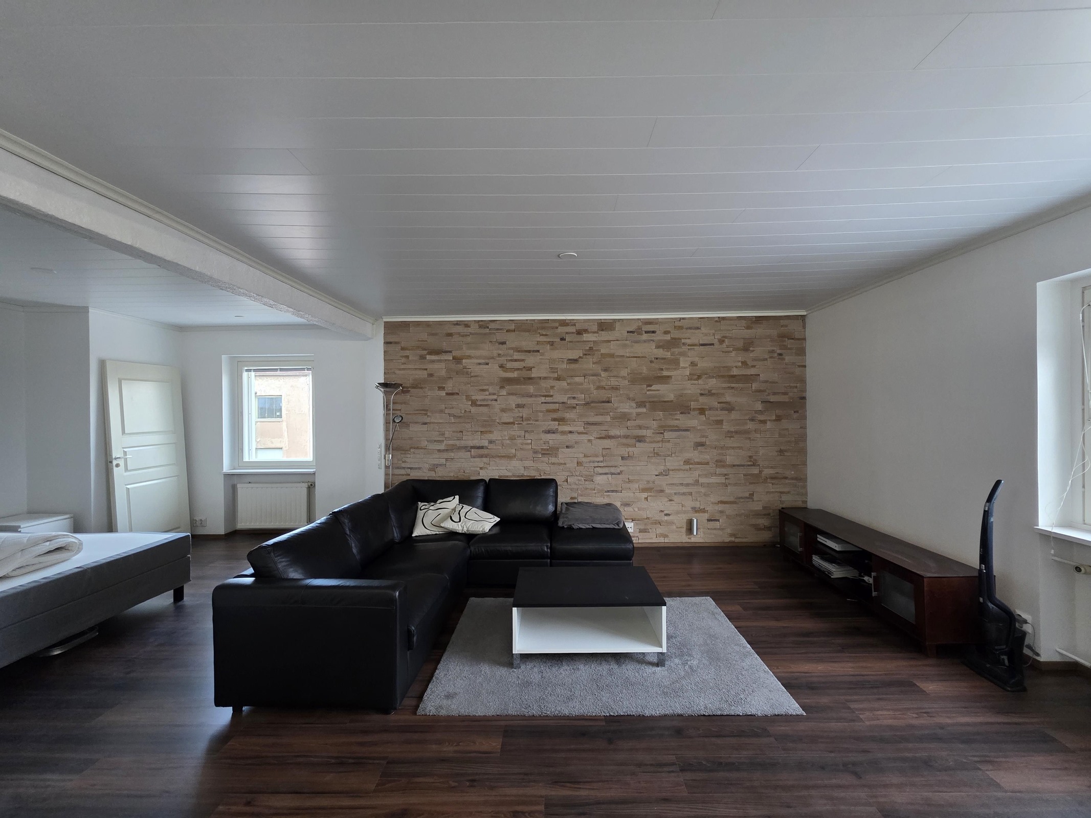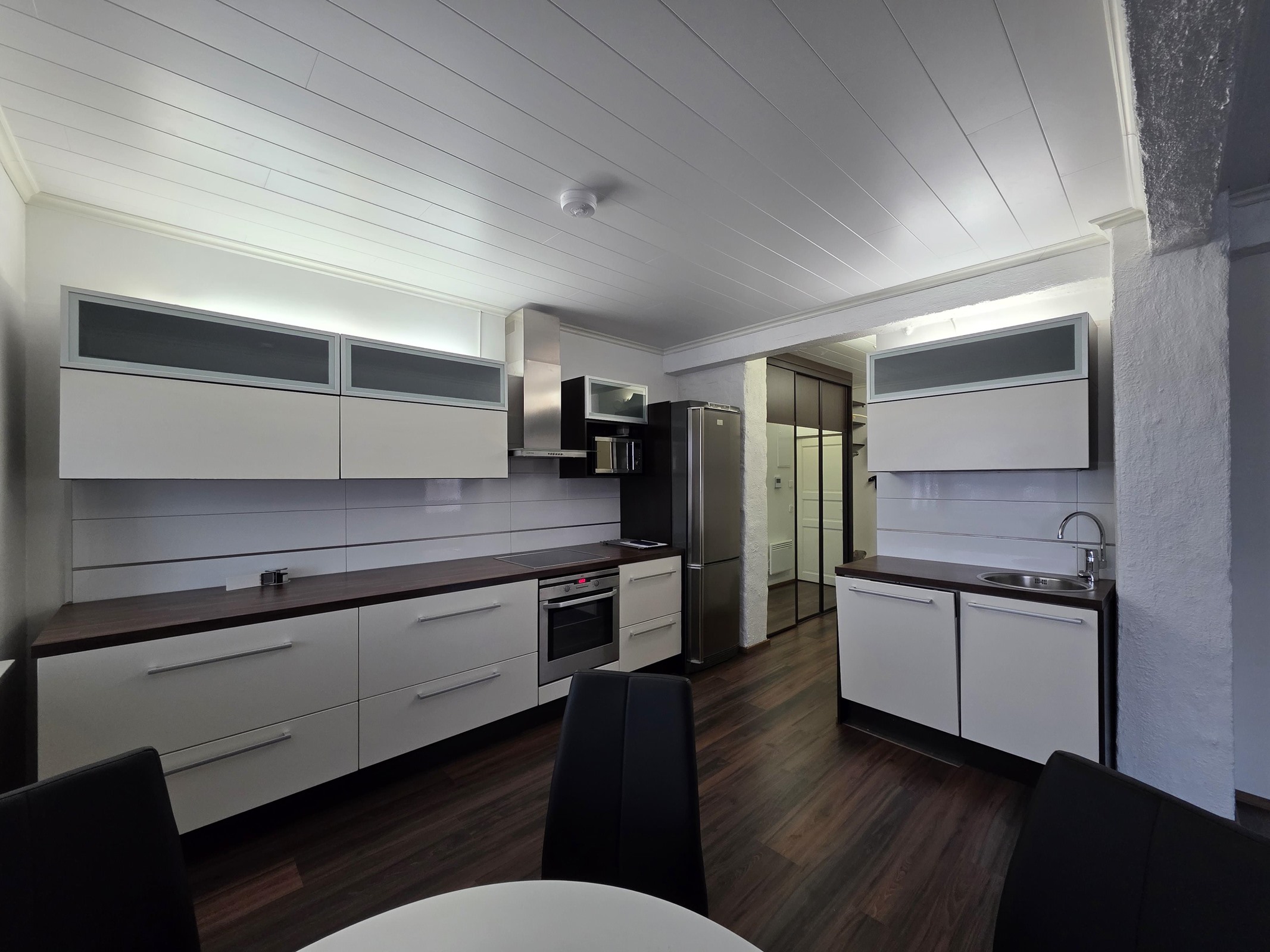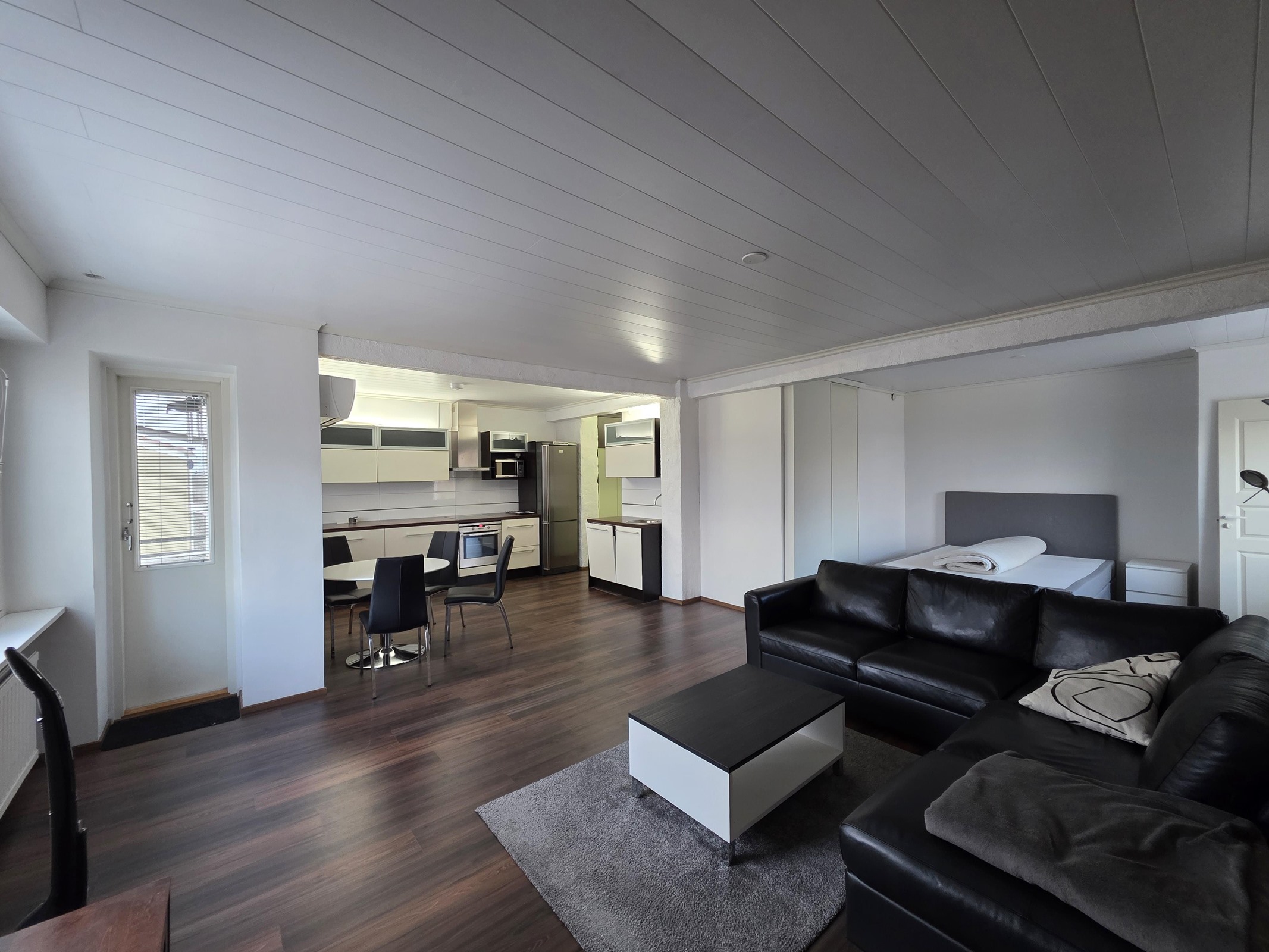 Lattia: tyylikäs laminaatti. Seinät: valkoinen maalattu.