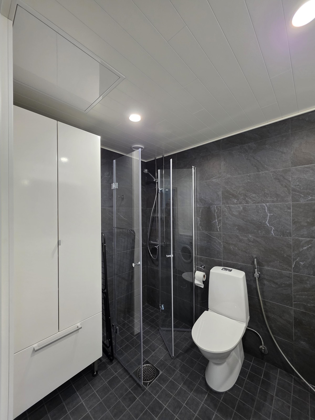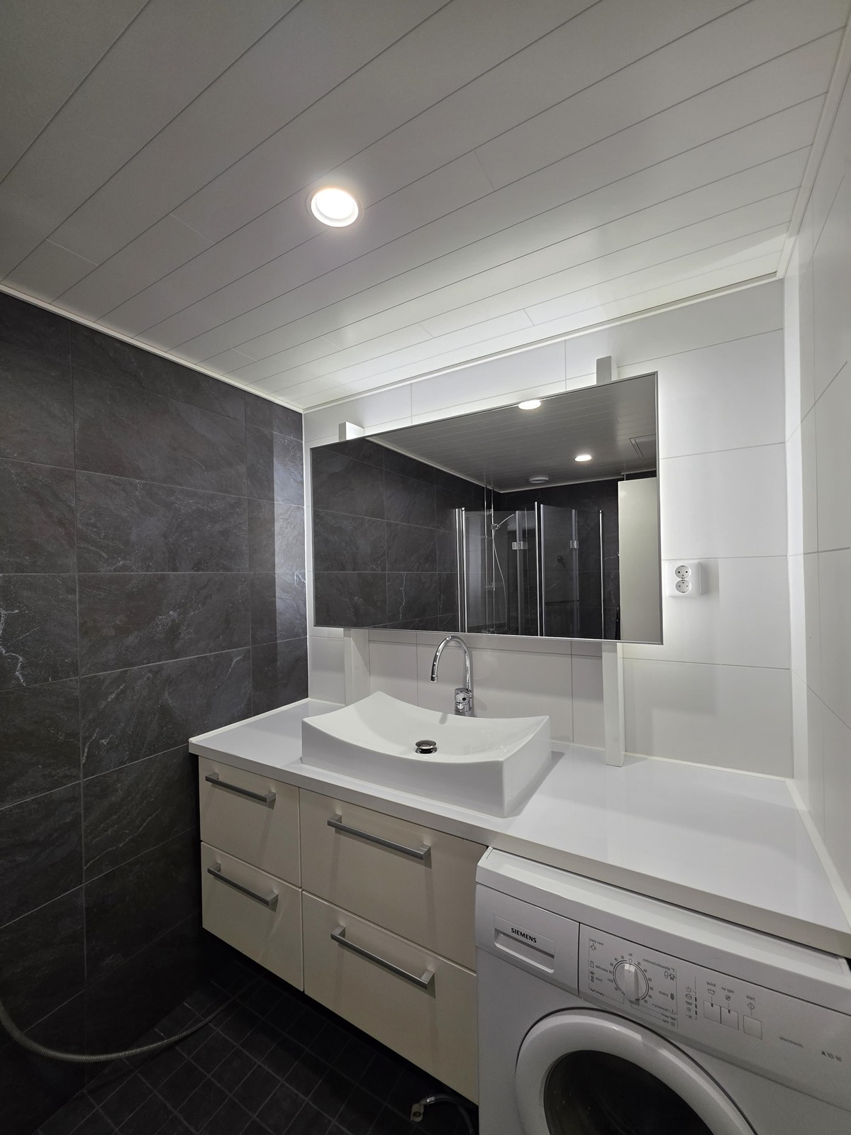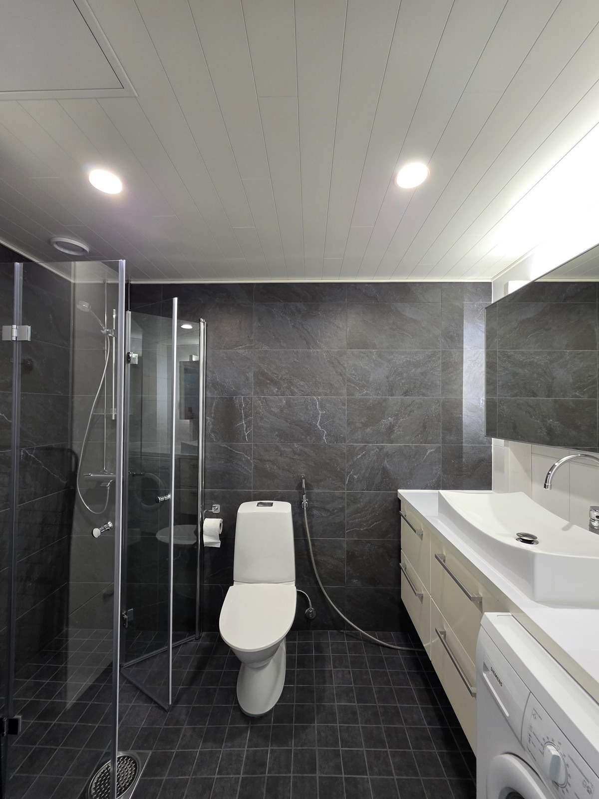 - Kylpyhuone, suihku, kaapit, allaskaappi, pesukoneliitäntä, lattialämmitys, kiinteät valaisimet.