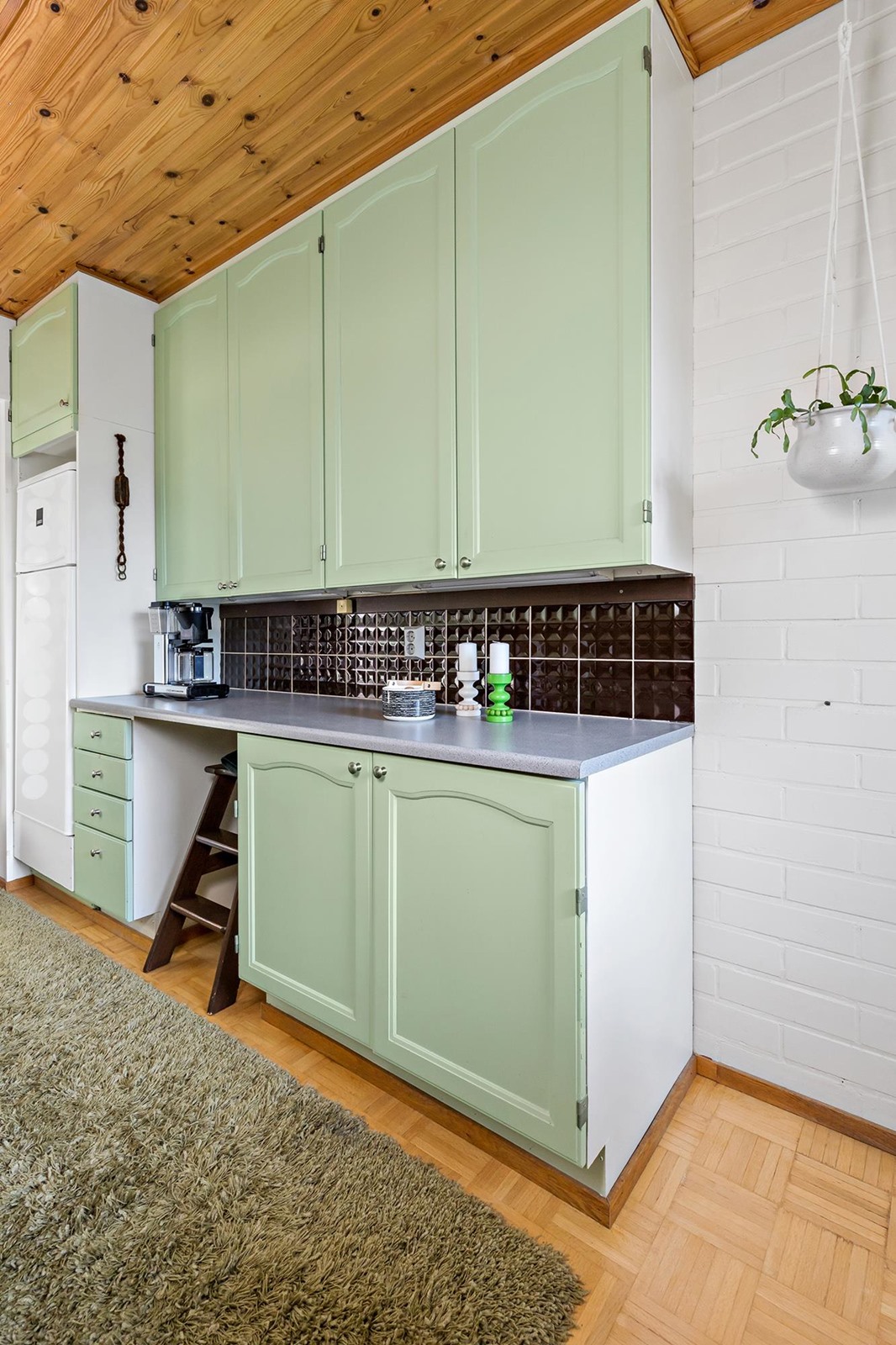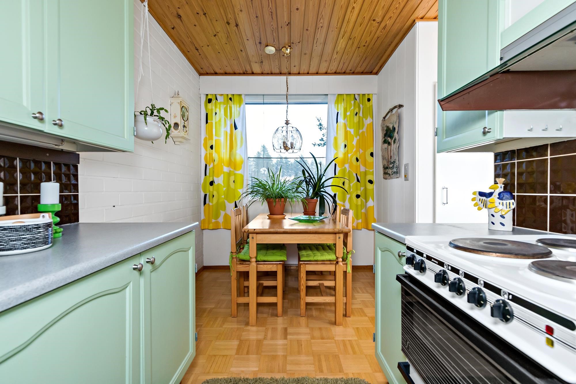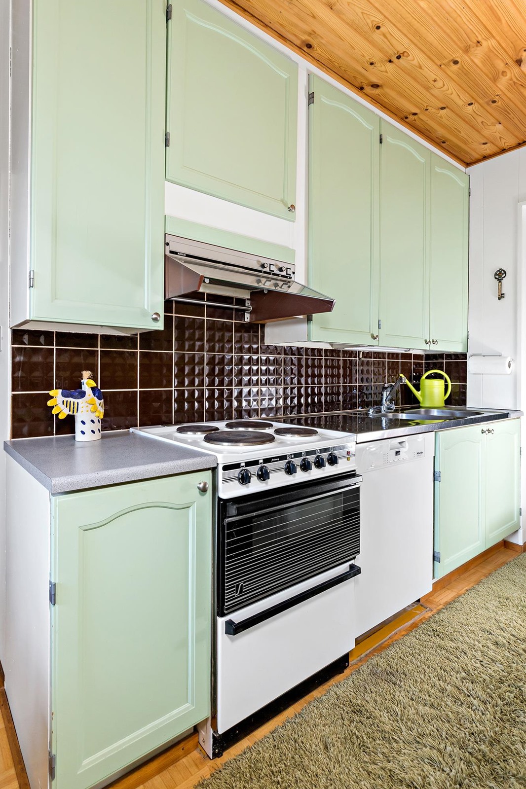- Jääkaappipakastin, sähköliesi, liesituuletin, astianpesukone, kaapistot, kiinteät valaisimet. Kylmiö