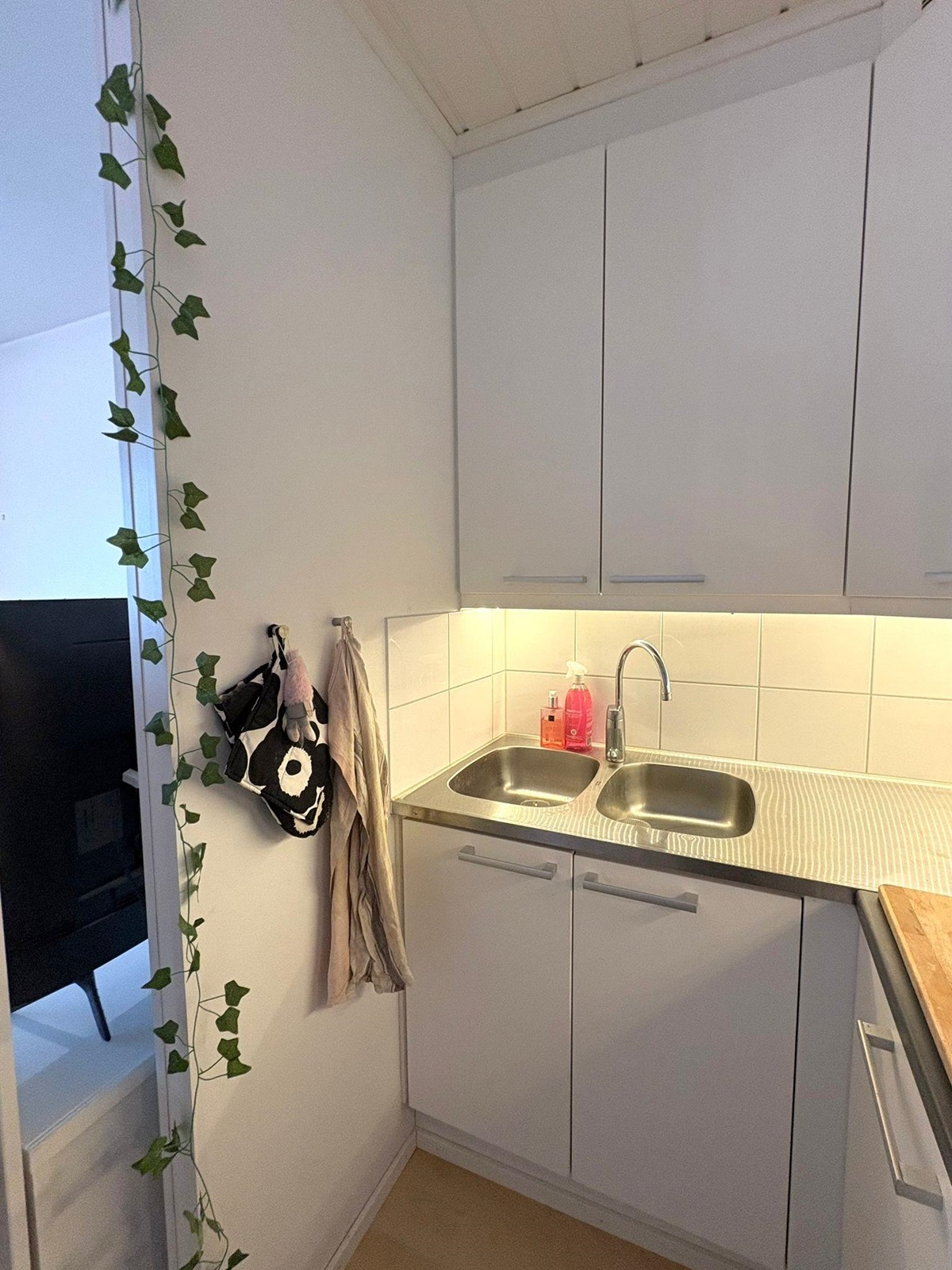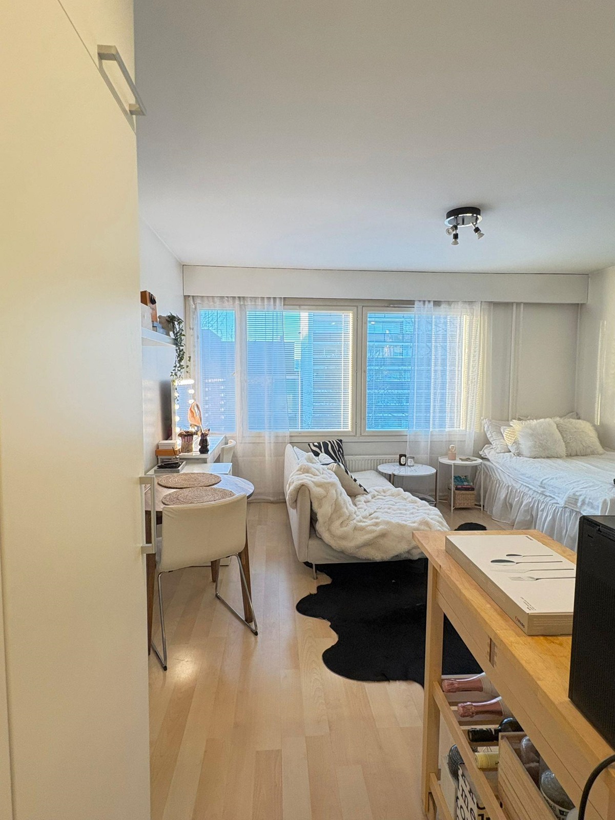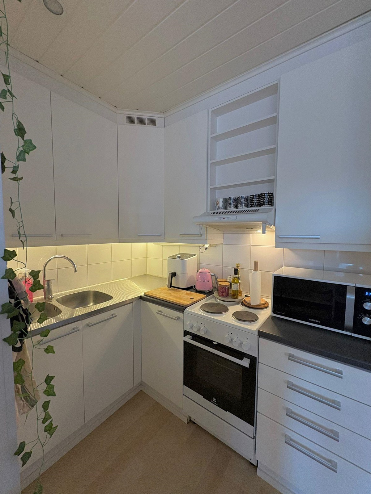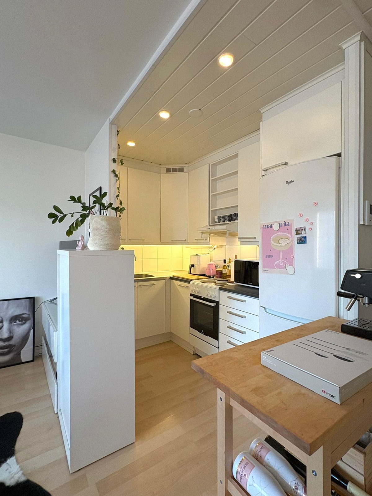 Asunnon 27,5 neliömetriä on jaettu käytännöllisesti yhteen huoneeseen, keittokomeroon ja kylpyhuoneeseen. Tyylikäs vaalea laminaattilattia ja valkoiset maalatut seinät korostavat tilan valoisuutta. Keittiössä on runsaasti kaappitilaa, jääkaappipakastin ja lattialiesi. Kylpyhuone on uusittu putkiremontin yhteydessä ja siellä on pesukoneliitäntä. Eteiskäytävän isot kaapistot tuovat lisää säilytystilaa. Lisäksi yläkerrassa on käytettävissä ilmainen pesutupa.